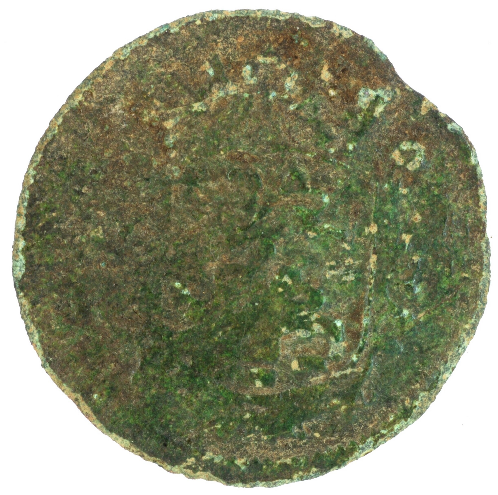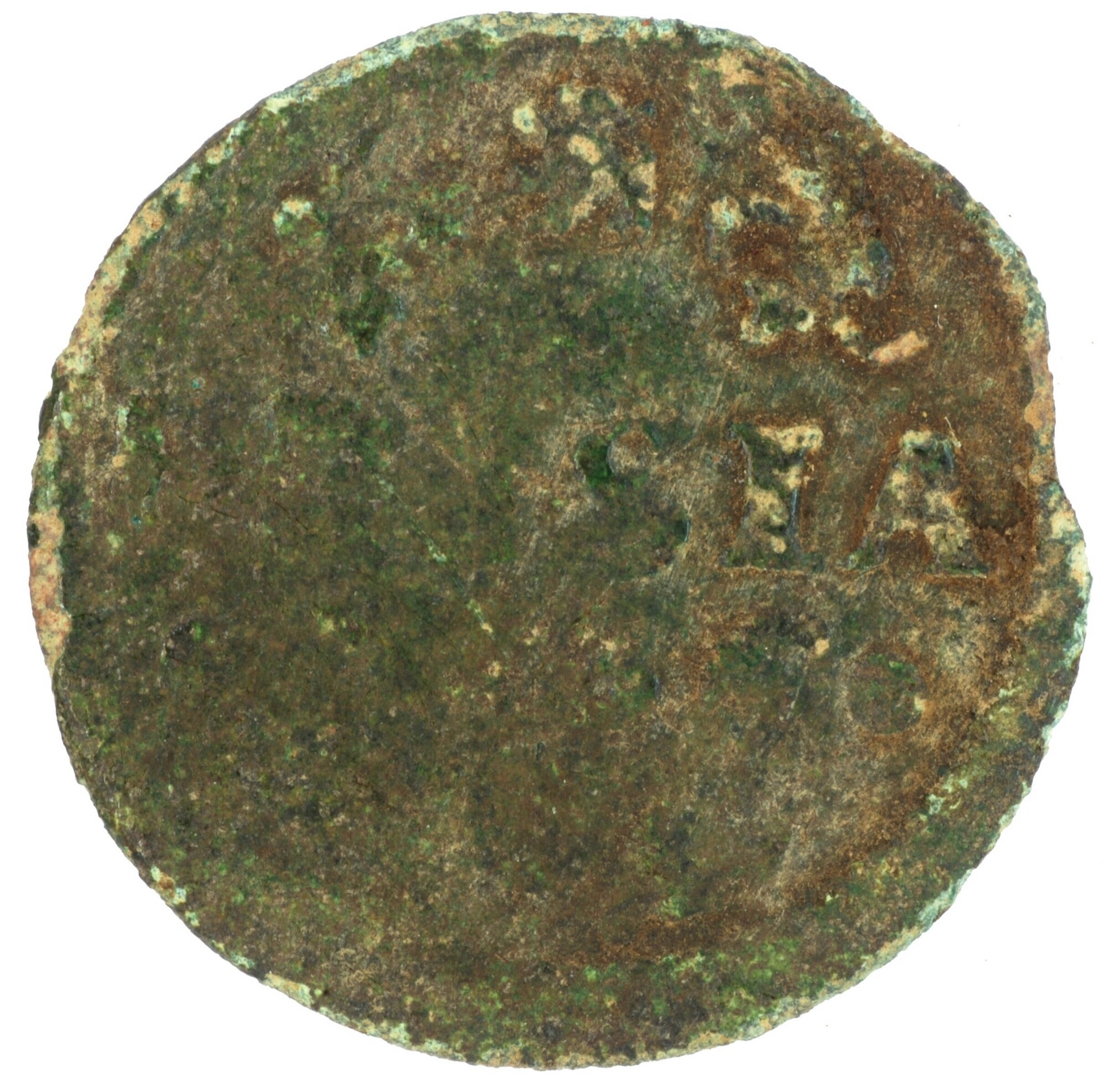 Duit; Friesland Provincie (1581-1795); vz.: in vier regels: bladornament (klimmende leeuw) bladornament / FRISIA / (rozet) [16]86 (rozet) / bladornament (rozet) bladornament; kz.: met open kroon gekroond en versierd wapenschild van Friesland; muntplaats: Leeuwarden; gewicht: 1.86 gram; referentie: Purmer / Wiel 6008 var (jaartal tussen rozetten), CNM 2.16.144