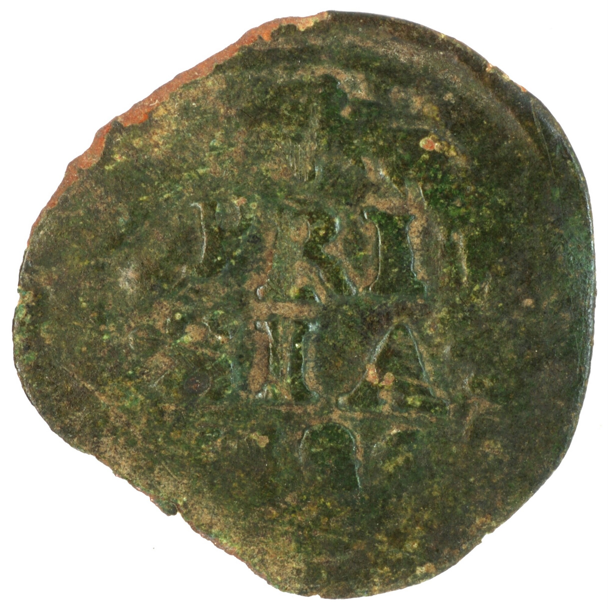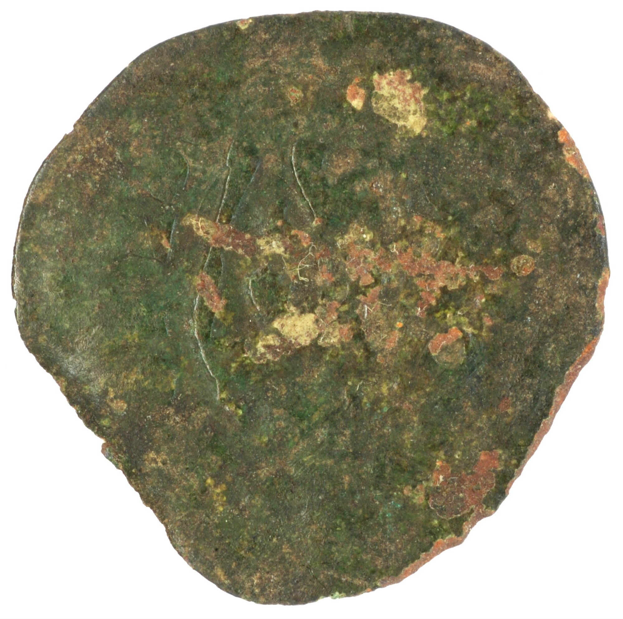 Duit; Friesland Provincie (1581-1795); vz.: binnen een bladerkrans in drie regels: FRI / SI[A] / 16[..]; kz.: met open kroon gekroond en versierd wapenschild van Friesland, met omschrift [NI]S[I•DN[S (leeuw) NO[BISCVM]; muntplaats: Leeuwarden; gewicht: 1.20 gram; referentie: Purmer / Wiel 6005, CNM 2.16.141