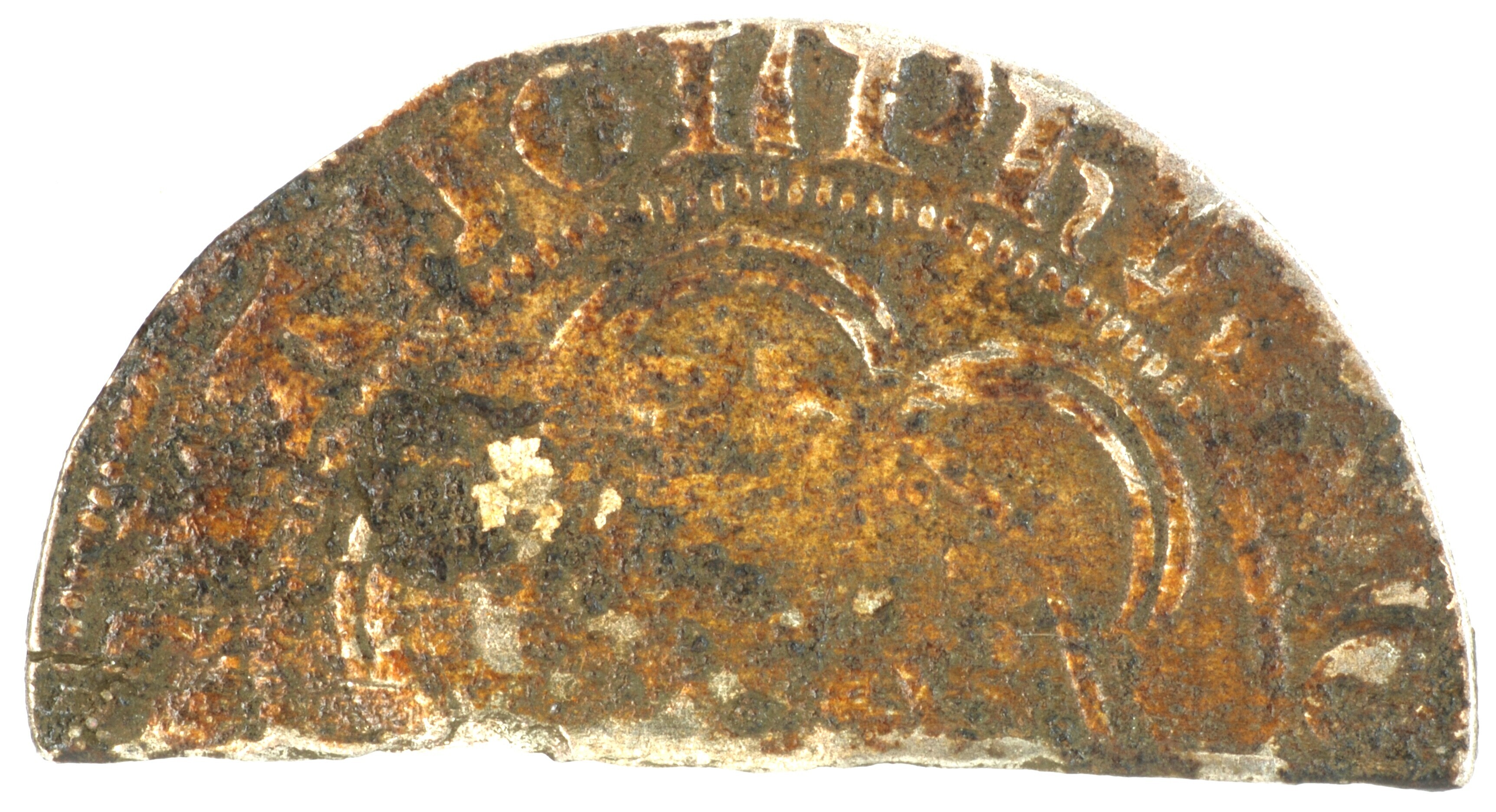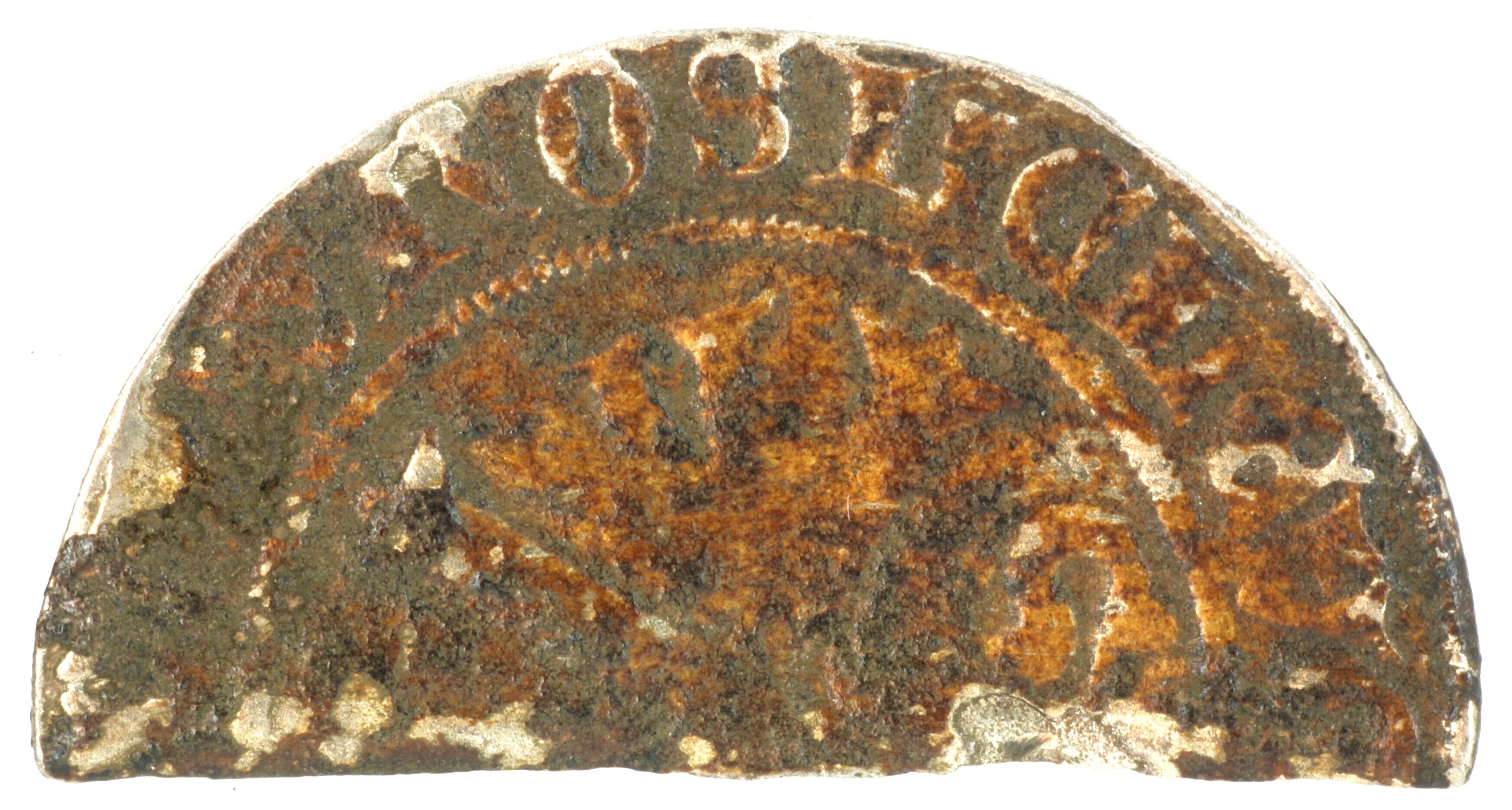 Groschen; Duitsland; Kleef Graafschap (1010-1417); Adolf I (1368-1394); vz.: wapen van Kleef binnen een achtpas en parelcirkel, met omschrift +ADOLPHVS:CO[MES:DE:CLEVE]N; kort gevoet kruis met [C – O] – M – S in de kwadranten binnen een parelcirkel, met omschrift [MONETA:NOVA:]GROSI:CLEVE; muntplaats: Kleef; gewicht: 1.08 gram; referentie: Noss: 73?; bewust gehalveerd