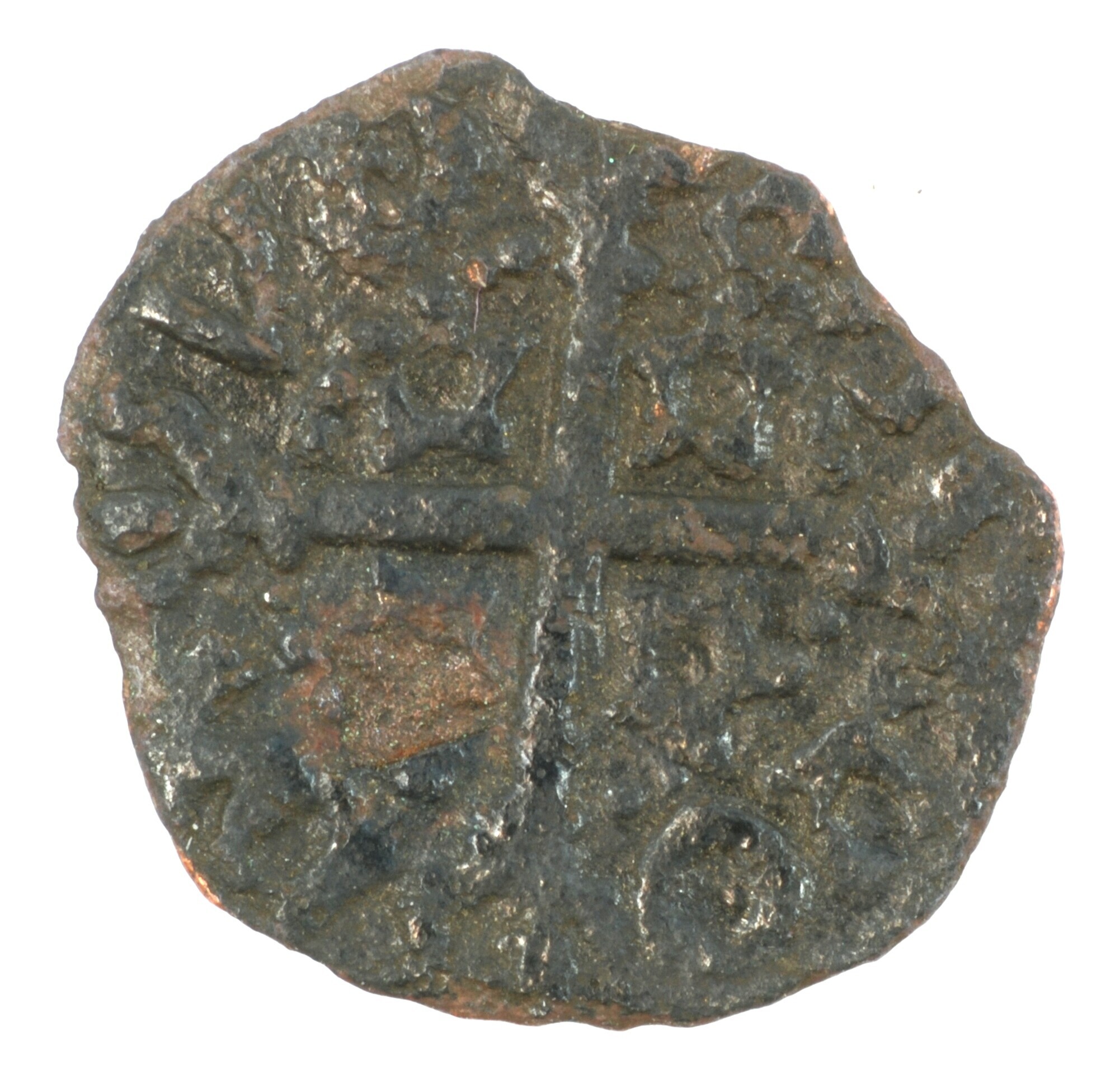 Farthing, type II; Schotland; James III (1460-1488); vz.: drie lelies binnen driepas en parelcirkel; kz.: lang kruis met gebloemd uiteinde met ruitersporen in de kwadranten binnen parelcirkel, met omschrift MO / PA / VP / [ER]; muntplaats: Edinburgh; gewicht: 0.26 gram; uiterst zeldzaam; referentie: Seaby / Purvey 5314