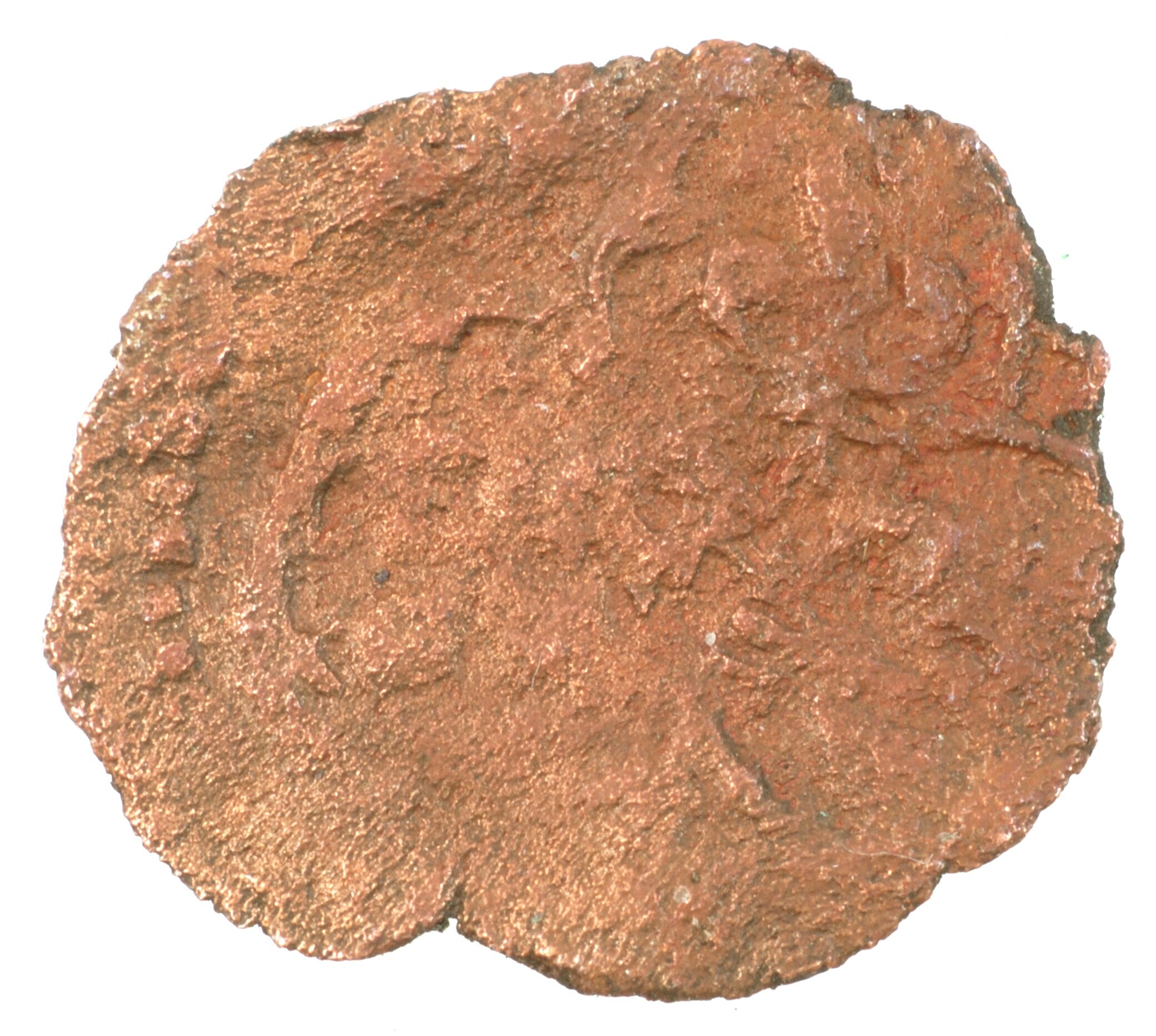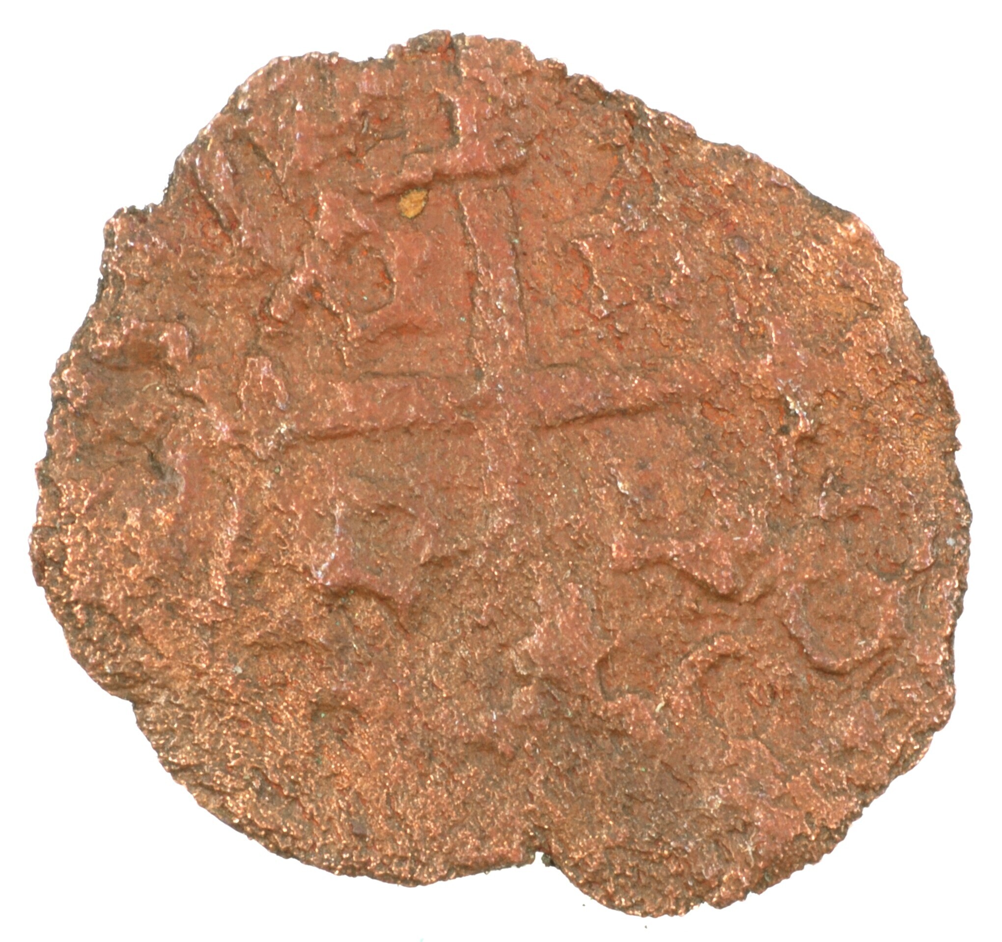 Farthing, type II; Schotland; James III (1460-1488); vz.: drie lelies binnen driepas en parelcirkel; kz.: lang kruis met gebloemd uiteinde met ruitersporen in de kwadranten binnen parelcirkel, met omschrift MO / [PA] / VP / [ER]; muntplaats: Edinburgh; gewicht: 0.26 gram; referentie: Seaby / Purvey 5314