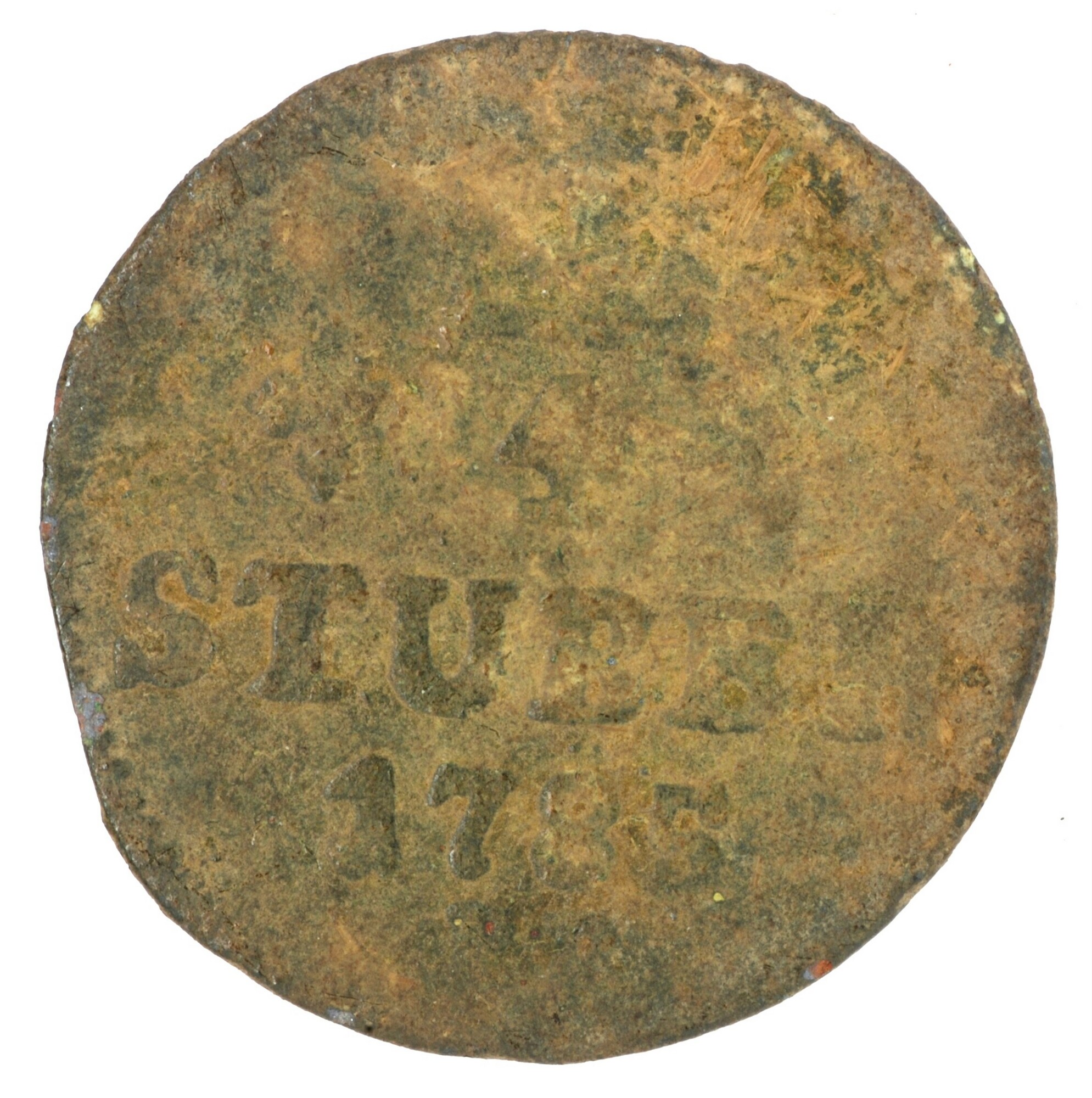 Kwart stuber; Duitsland; Duitse Staten; Gulik-Berg; Karel Theodoor (1742-1799); vz.: monogram van Düsseldorf, met omschrift GULICH•UND•BERGISCHE•LANDMUNZ; kz.: in vier regels: ster ¼ ster / STUBER / •1785• / •P•R•; muntplaats: Düsseldorf; gewicht: 2.22 gram; referentie: Krause / Mishler 205