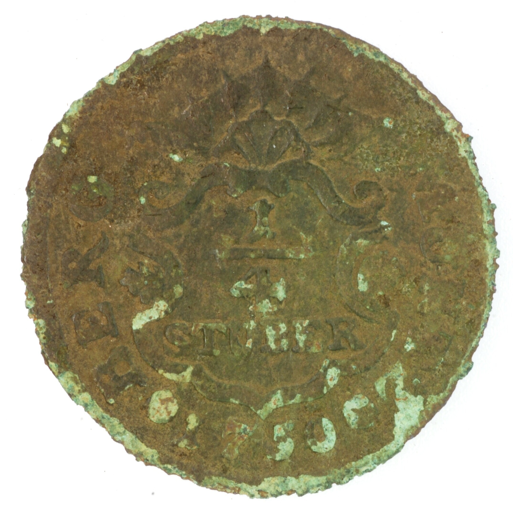Kwart stuber; Duitsland; Duitse Staten; Graafschap Wied-Neuwied; Johann Friedrich Alexander (1737-1791); vz.: mijnactiviteiten met omschrift GOTT SEGNE DAS BERGWERCK; kz.: binnen een schild in twee regels ¼ / STUBER met omschrift MUNTZ – BERG en aan de onderzijde •1750•; gewicht: 1.60 gram; muntplaats: -; referentie: Krause / Mishler 4