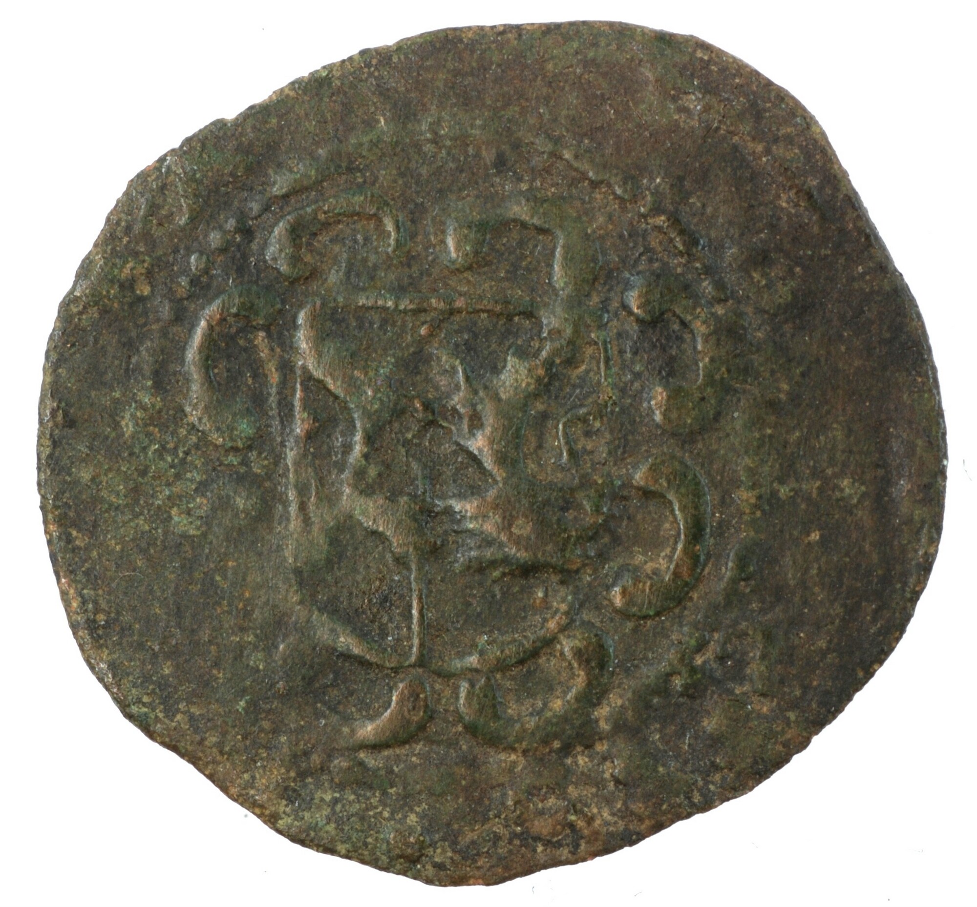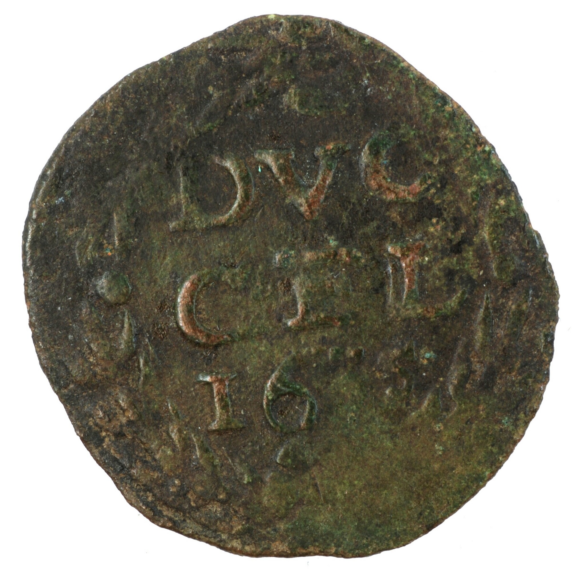 Duit; Gelderland Provincie (1581-1795); vz.: binnen een bladerkrans in drie regels DVC / GEL / 1635; kz.: wapenschild van Gelderland binnen achtpas en parelcirkel, met omschrift [•I]N[•DEO•]SPES•[NOSTR]A[•(Gelders kruis)]; muntplaats: Harderwijk; gewicht: 1.20 gram; referentie: Purmer / Wiel 1008 var, CNM 2.17.184 var (eerst S van SPES in retrograde)