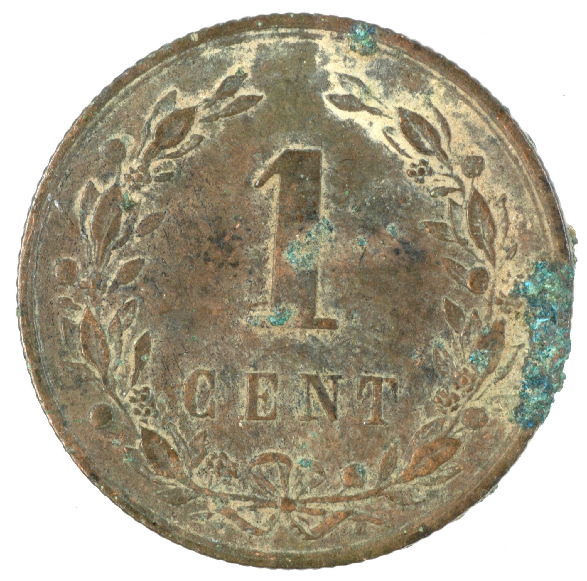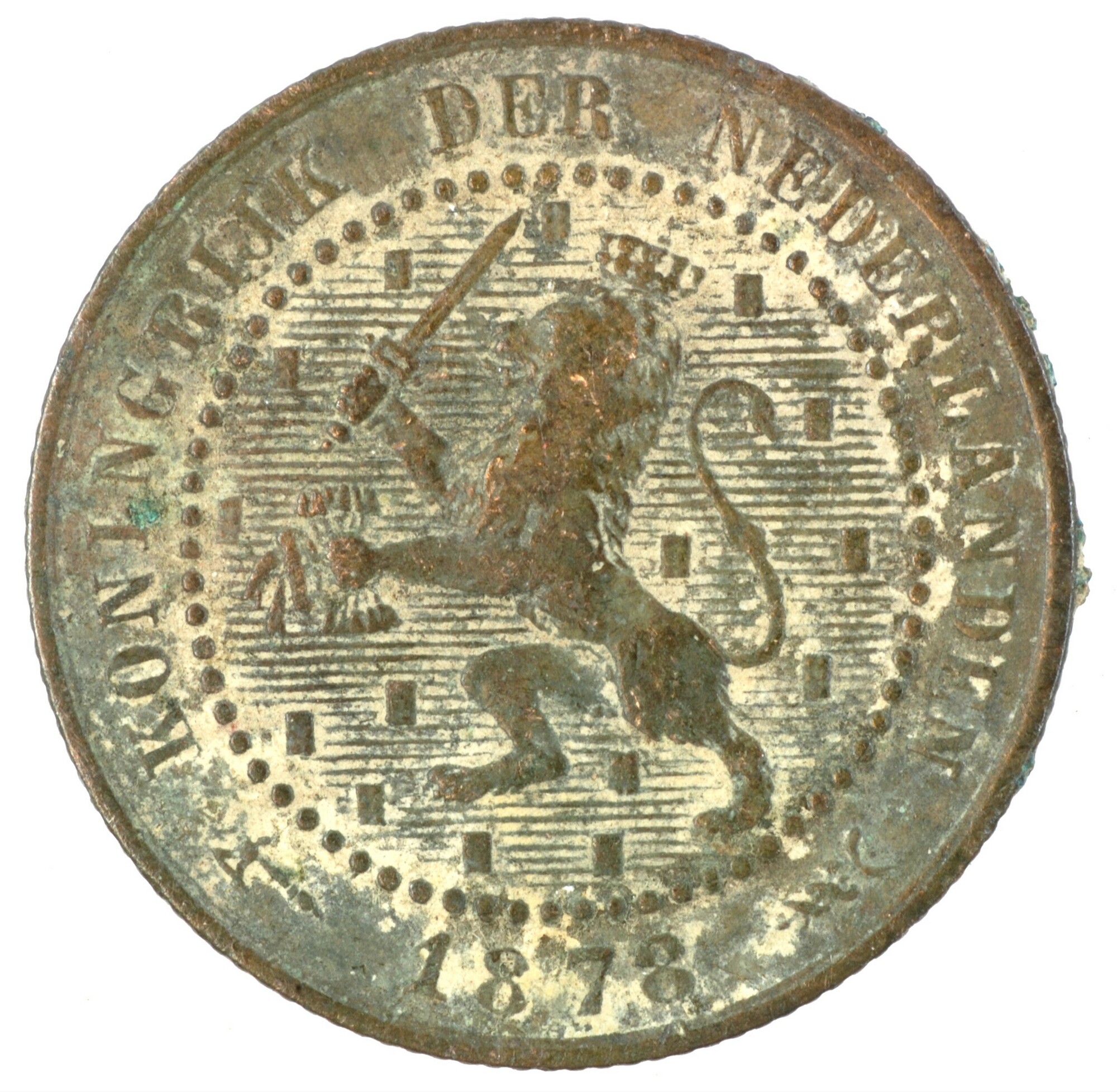 Cent; Nederland Koninkrijk (1813-heden); Willem III (1849-1890); vz.: klimmende leeuw naar links met zwaard en pijlenbundel op een veld van azuur met zeventien blokken binnen parelcirkel, met omschrift (bijl) KONINGRIJK DER NEDERLANDEN (mercuriusstaf) 1878; kz.: binnen een krans van twee samengebonden oranjetakken in twee regels: 1 / CENT; muntplaats: Utrecht; gewicht: 2.37 gram; referentie: Schulman ...