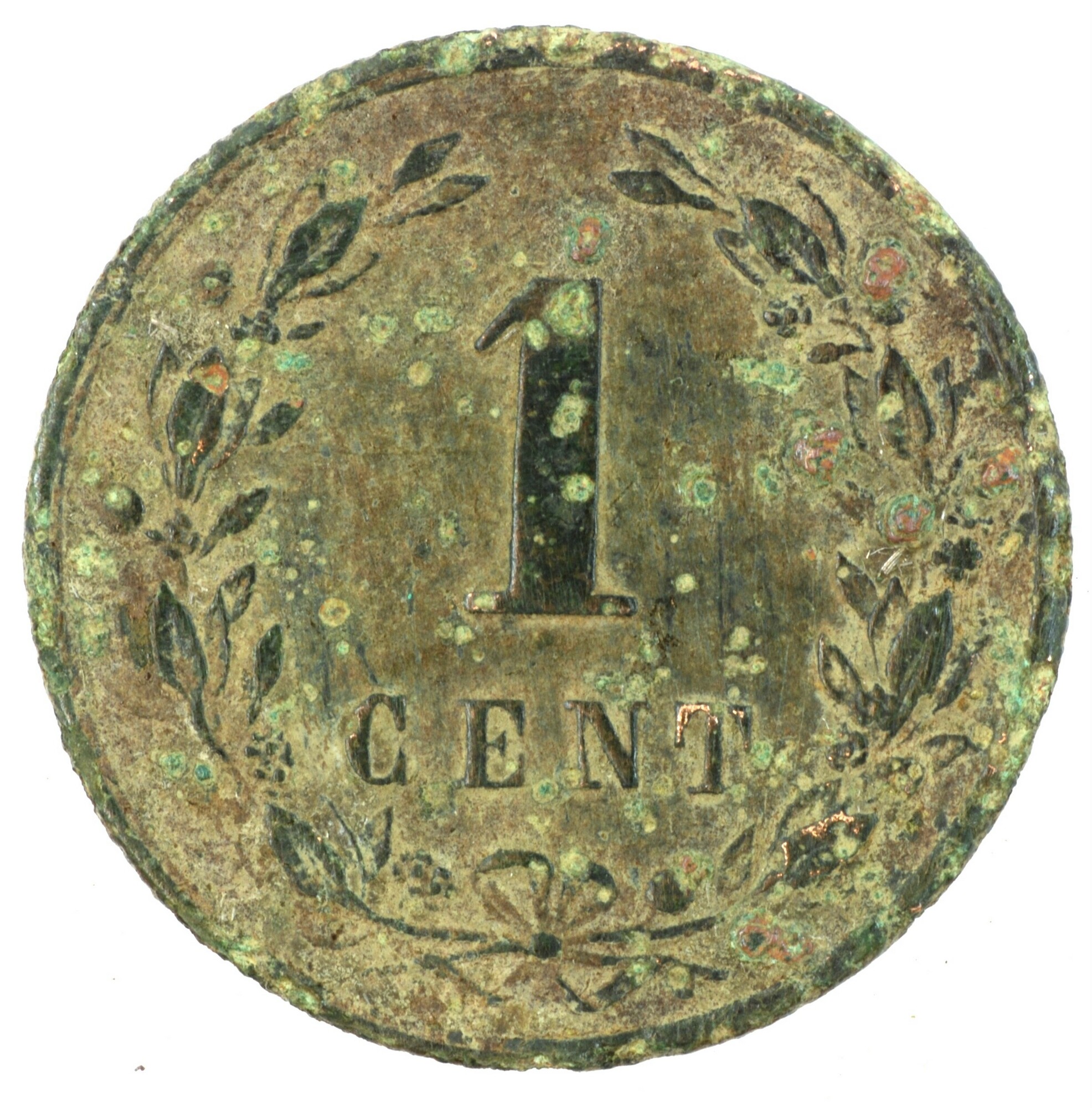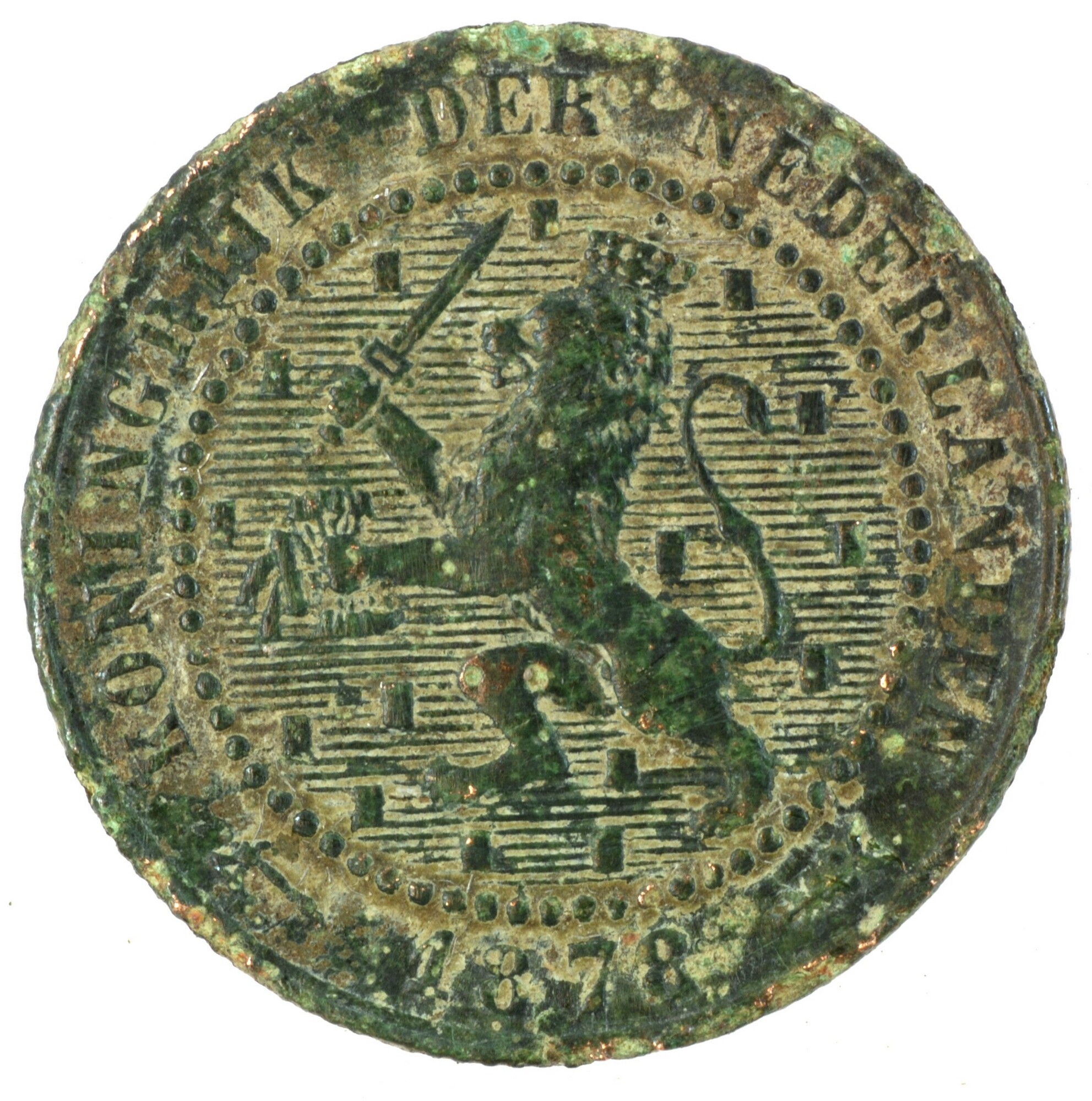 Cent; Nederland Koninkrijk (1813-heden); Willem III (1849-1890); vz.: klimmende leeuw naar links met zwaard en pijlenbundel op een veld van azuur met zeventien blokken binnen parelcirkel, met omschrift (bijl) KONINGRIJK DER NEDERLANDEN (mercuriusstaf) 1878; kz.: binnen een krans van twee samengebonden oranjetakken in twee regels: 1 / CENT; muntplaats: Utrecht; gewicht: 2.33 gram; referentie: Schulman ...