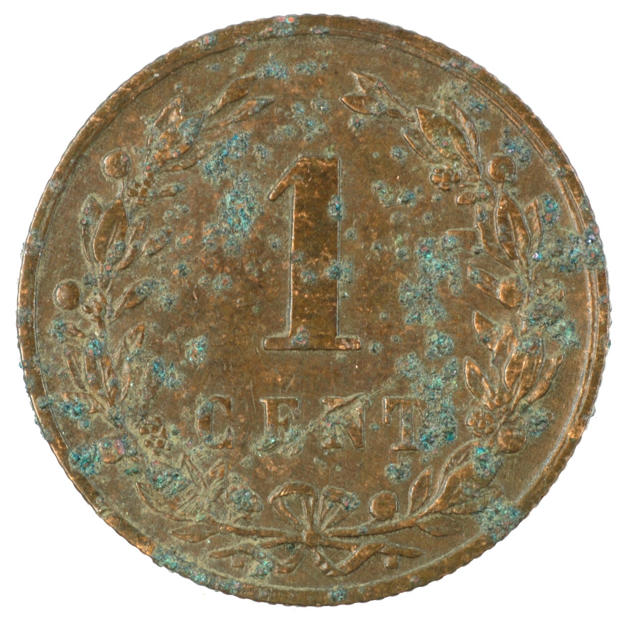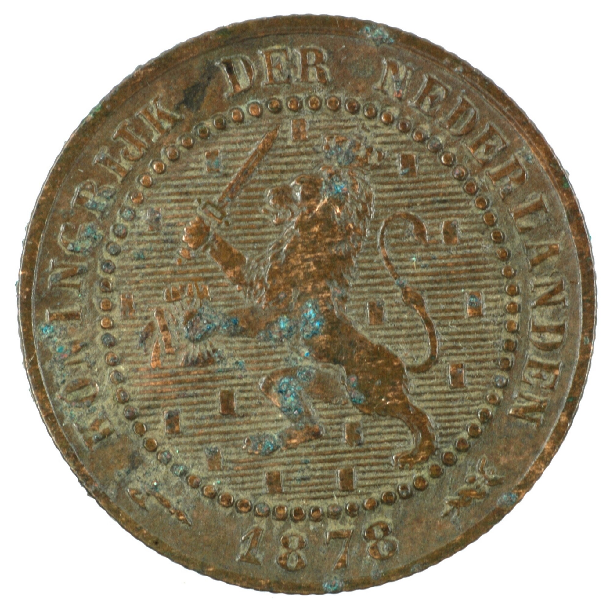 Cent; Nederland Koninkrijk (1813-heden); Willem III (1849-1890); vz.: klimmende leeuw naar links met zwaard en pijlenbundel op een veld van azuur met zeventien blokken binnen parelcirkel, met omschrift (bijl) KONINGRIJK DER NEDERLANDEN (mercuriusstaf) 1878; kz.: binnen een krans van twee samengebonden oranjetakken in twee regels: 1 / CENT; muntplaats: Utrecht; gewicht: 2.51 gram; referentie: Schulman ...