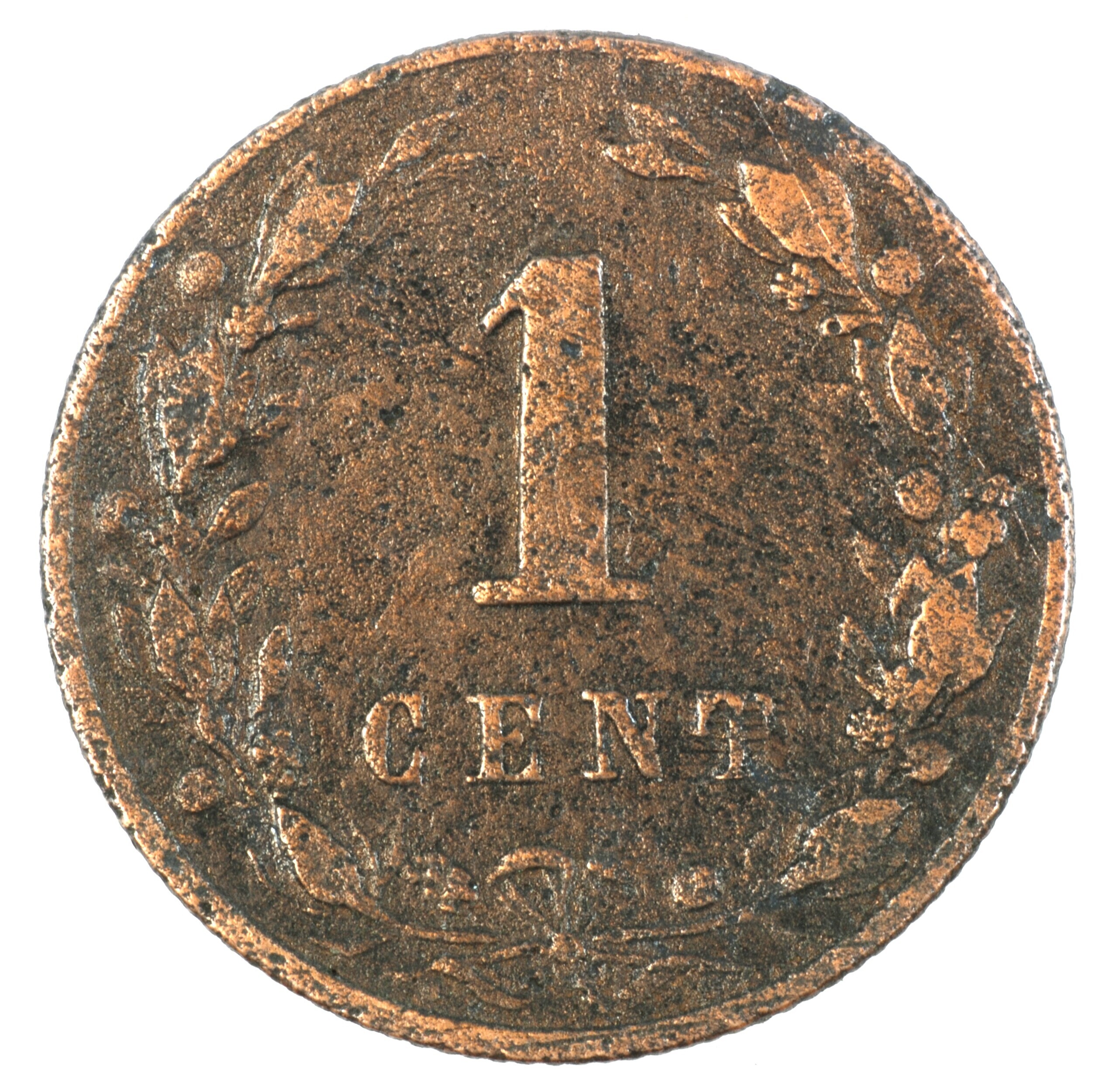 Cent; Nederland Koninkrijk (1813-heden); Willem III (1849-1890); vz.: klimmende leeuw naar links met zwaard en pijlenbundel op een veld van azuur met zeventien blokken binnen parelcirkel, met omschrift (bijl) KONINGRIJK DER NEDERLANDEN (mercuriusstaf) 1880; kz.: binnen een krans van twee samengebonden oranjetakken in twee regels: 1 / CENT; muntplaats: Utrecht; gewicht: 2.43 gram; referentie: Schulman ...
