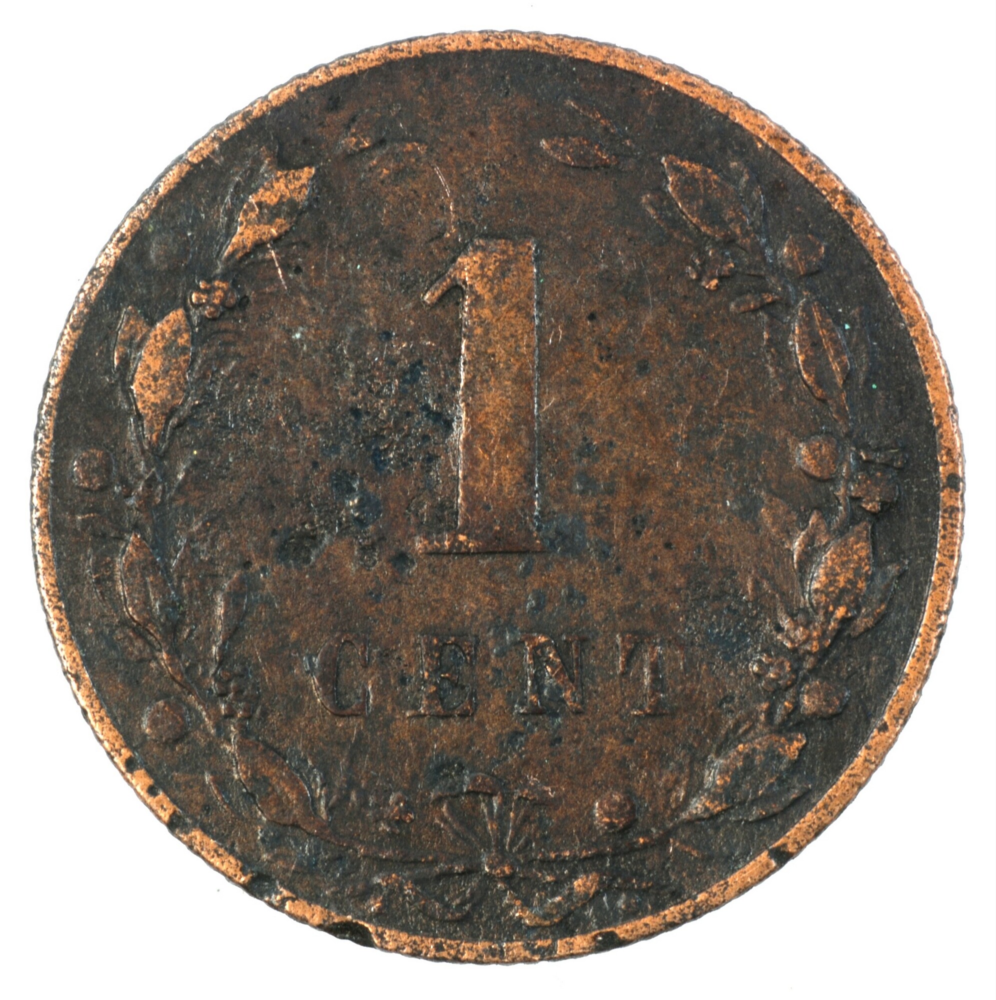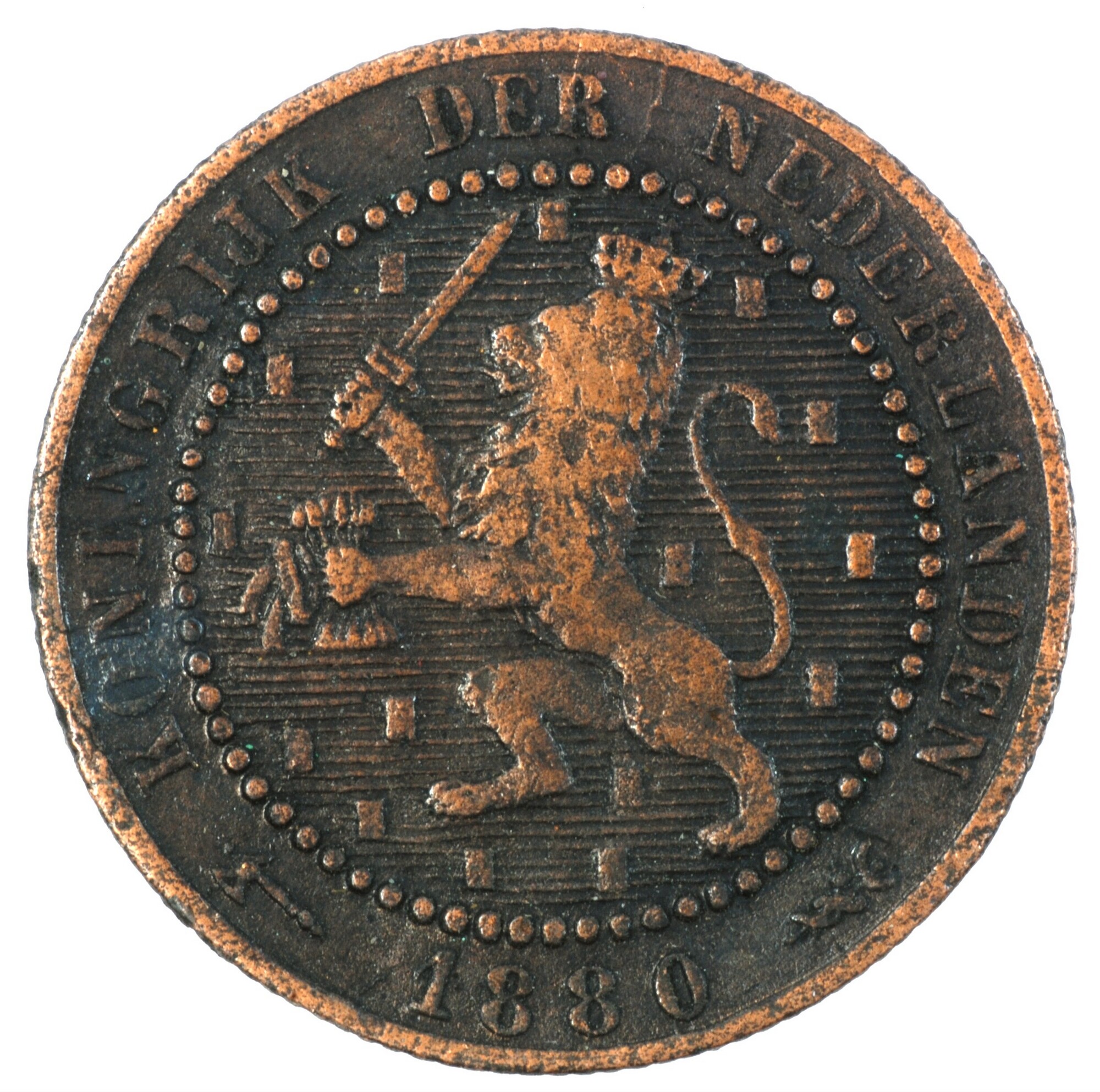 Cent; Nederland Koninkrijk (1813-heden); Willem III (1849-1890); vz.: klimmende leeuw naar links met zwaard en pijlenbundel op een veld van azuur met zeventien blokken binnen parelcirkel, met omschrift (bijl) KONINGRIJK DER NEDERLANDEN (mercuriusstaf) 1880; kz.: binnen een krans van twee samengebonden oranjetakken in twee regels: 1 / CENT; muntplaats: Utrecht; gewicht: 2.51 gram; referentie: Schulman ...