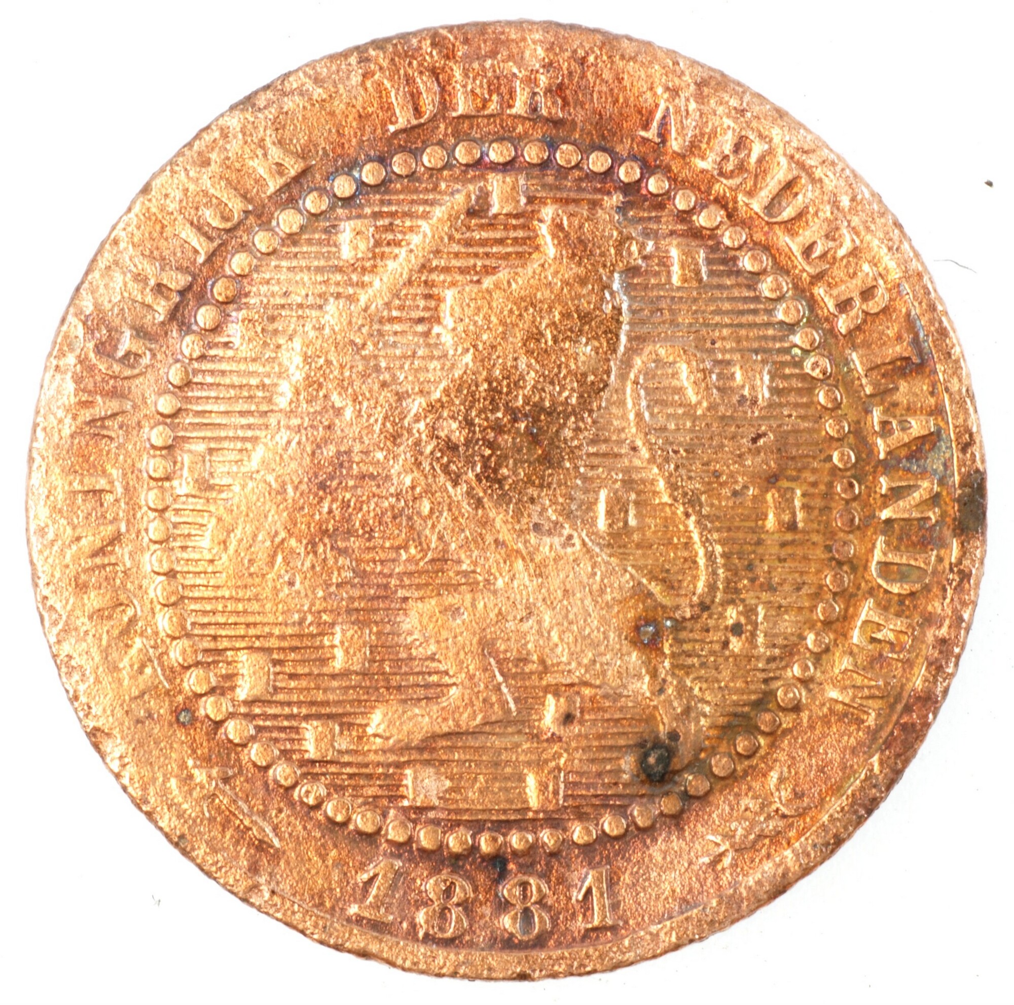 Cent; Nederland Koninkrijk (1813-heden); Willem III (1849-1890); vz.: klimmende leeuw naar links met zwaard en pijlenbundel op een veld van azuur met zeventien blokken binnen parelcirkel, met omschrift (bijl) KONINGRIJK DER NEDERLANDEN (mercuriusstaf) 1881; kz.: binnen een krans van twee samengebonden oranjetakken in twee regels: 1 / CENT; muntplaats: Utrecht; gewicht: 2.15 gram; referentie: Schulman ...