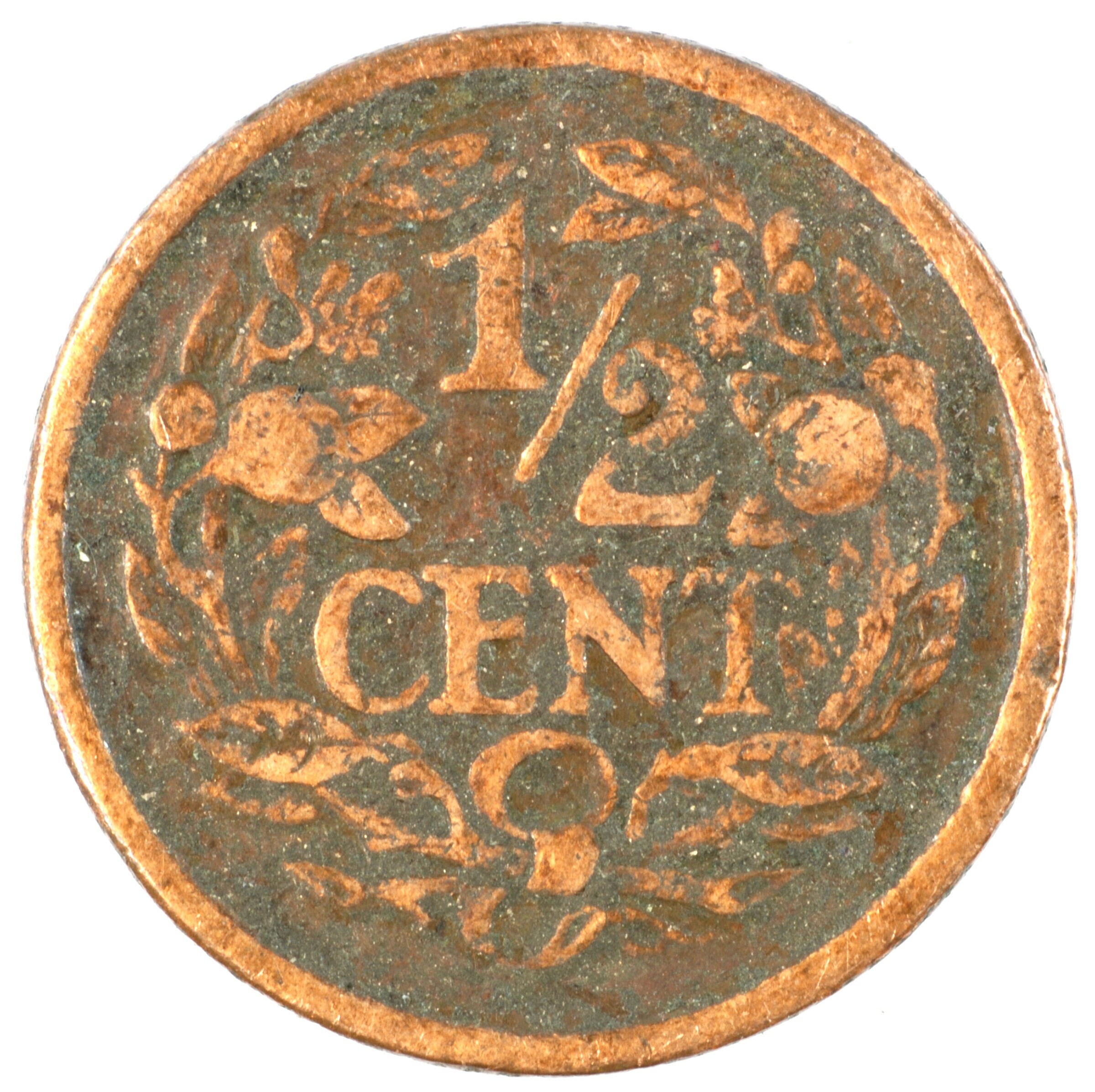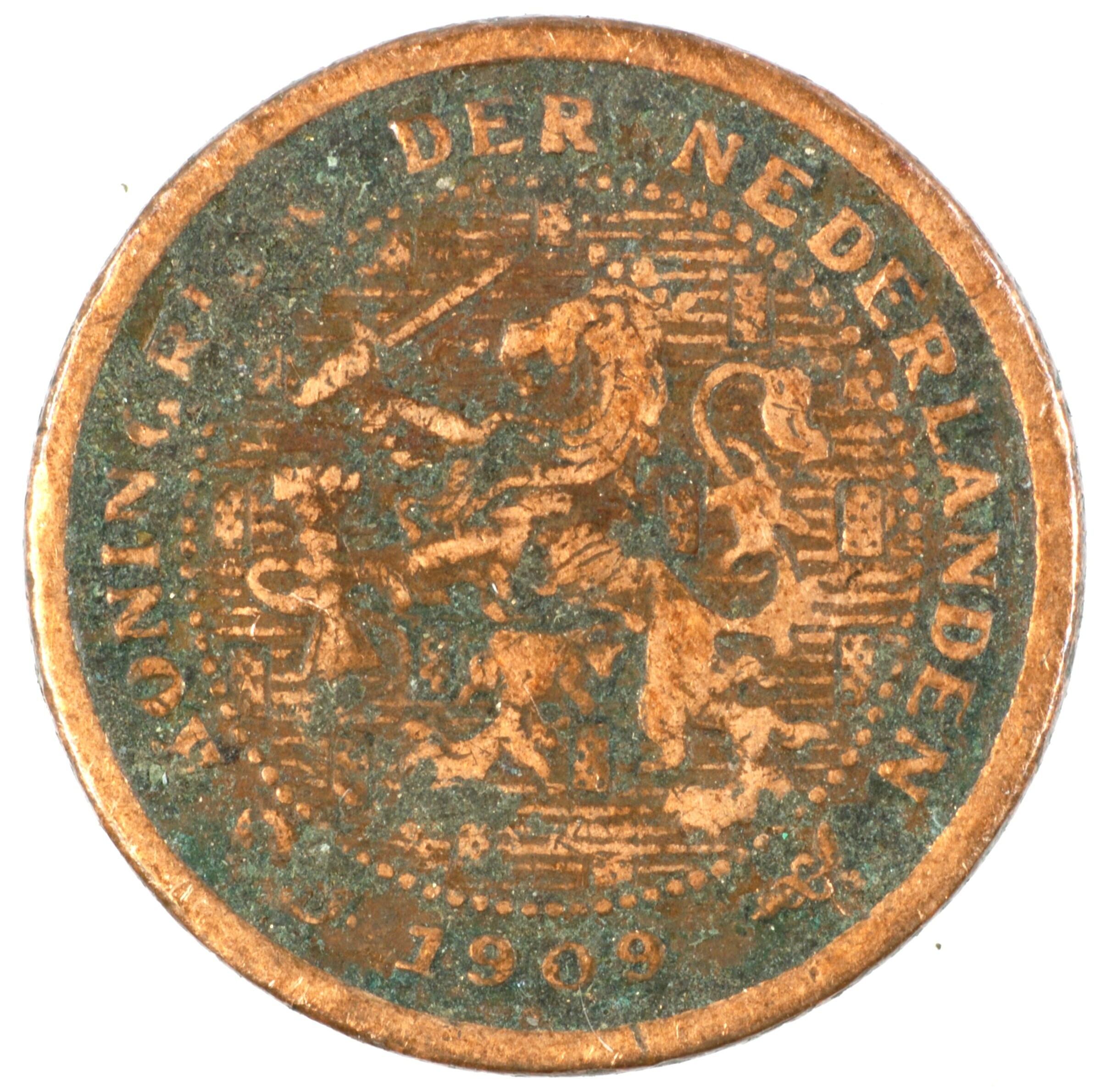 Halve cent; Nederland Koninkrijk (1813-heden); Wilhelmina (1890-1948); vz.: klimmende leeuw naar links met zwaard en pijlenbundel op een veld van azuur met zeventien blokken binnen parelcirkel, met omschrift (zeepaardje) KONINGRIJK DER NEDERLANDEN (mercuriusstaf) 1909; kz.: binnen een krans van twee samengebonden oranjetakken in twee regels: ½ / CENT; muntplaats: Utrecht; gewicht: 1.27 gram; referentie: Schulman ...