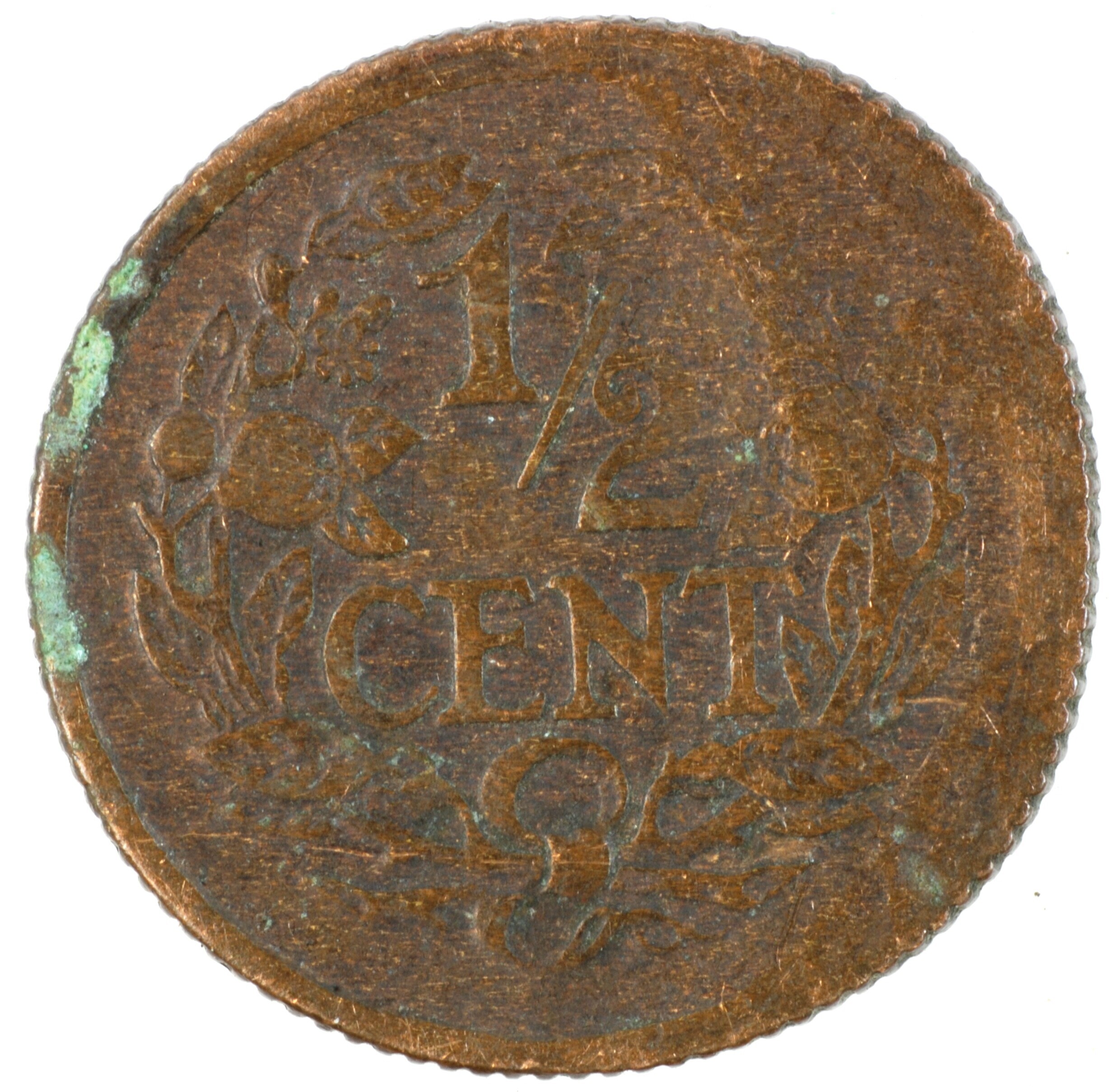 Halve cent; Nederland Koninkrijk (1813-heden); Wilhelmina (1890-1948); vz.: klimmende leeuw naar links met zwaard en pijlenbundel op een veld van azuur met zeventien blokken binnen parelcirkel, met omschrift (zeepaardje) KONINGRIJK DER NEDERLANDEN (mercuriusstaf) 1916; kz.: binnen een krans van twee samengebonden oranjetakken in twee regels: ½ / CENT; muntplaats: Utrecht; gewicht: 1.28 gram; referentie: Schulman ...