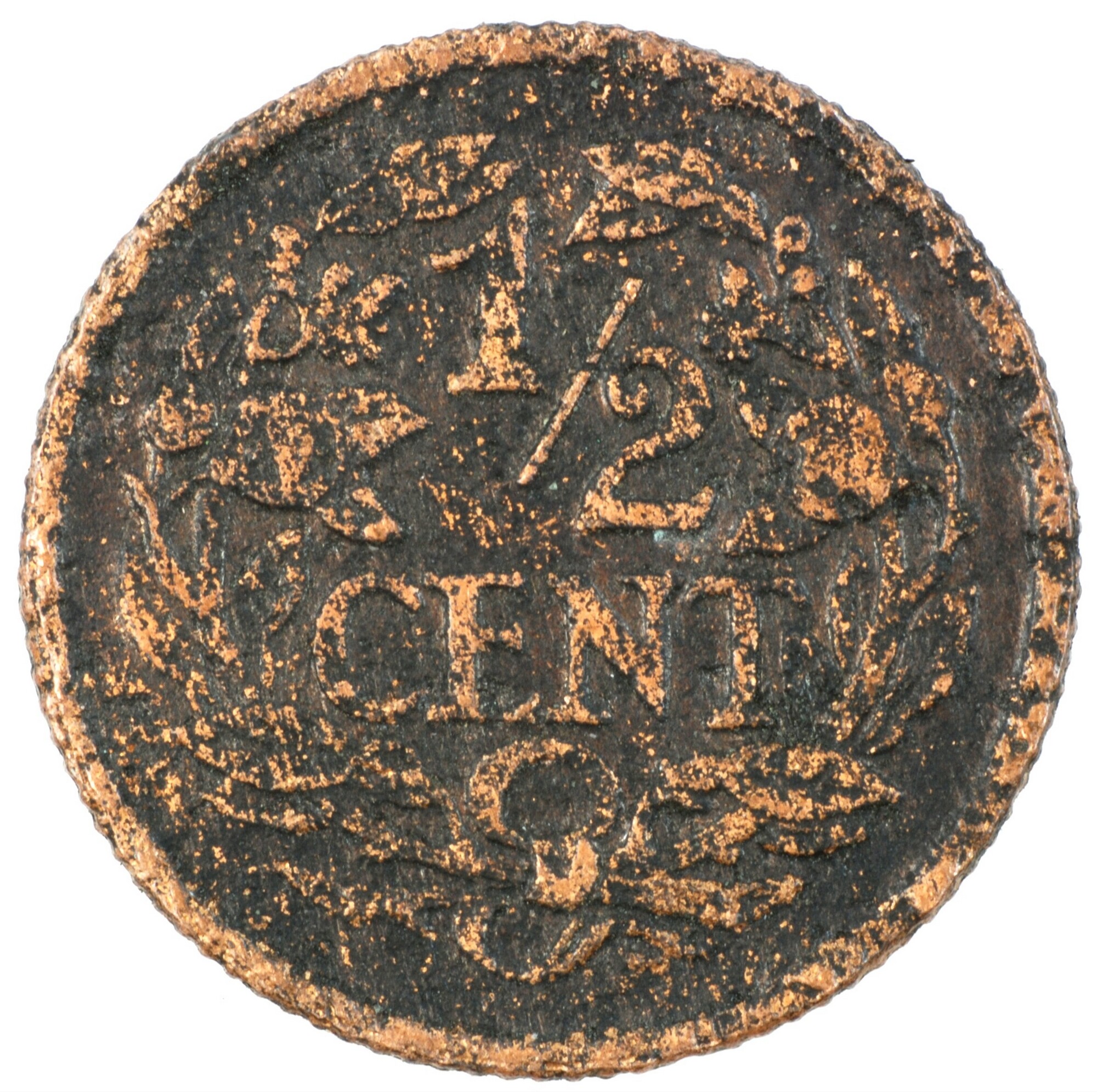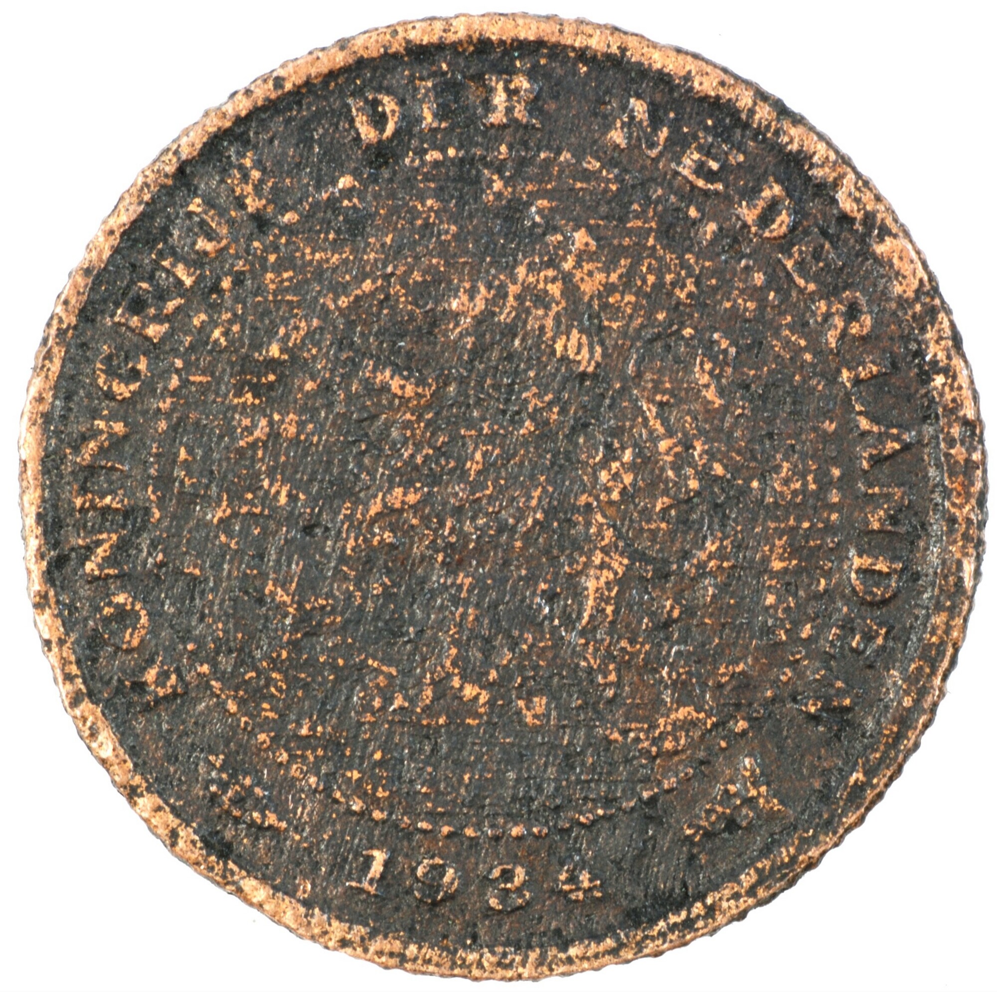 Halve cent; Nederland Koninkrijk (1813-heden); Wilhelmina (1890-1948); vz.: klimmende leeuw naar links met zwaard en pijlenbundel op een veld van azuur met zeventien blokken binnen parelcirkel, met omschrift (druiventros) KONINGRIJK DER NEDERLANDEN (mercuriusstaf) 1934; kz.: binnen een krans van twee samengebonden oranjetakken in twee regels: ½ / CENT; muntplaats: Utrecht; gewicht: 1.09 gram; referentie: Schulman ...