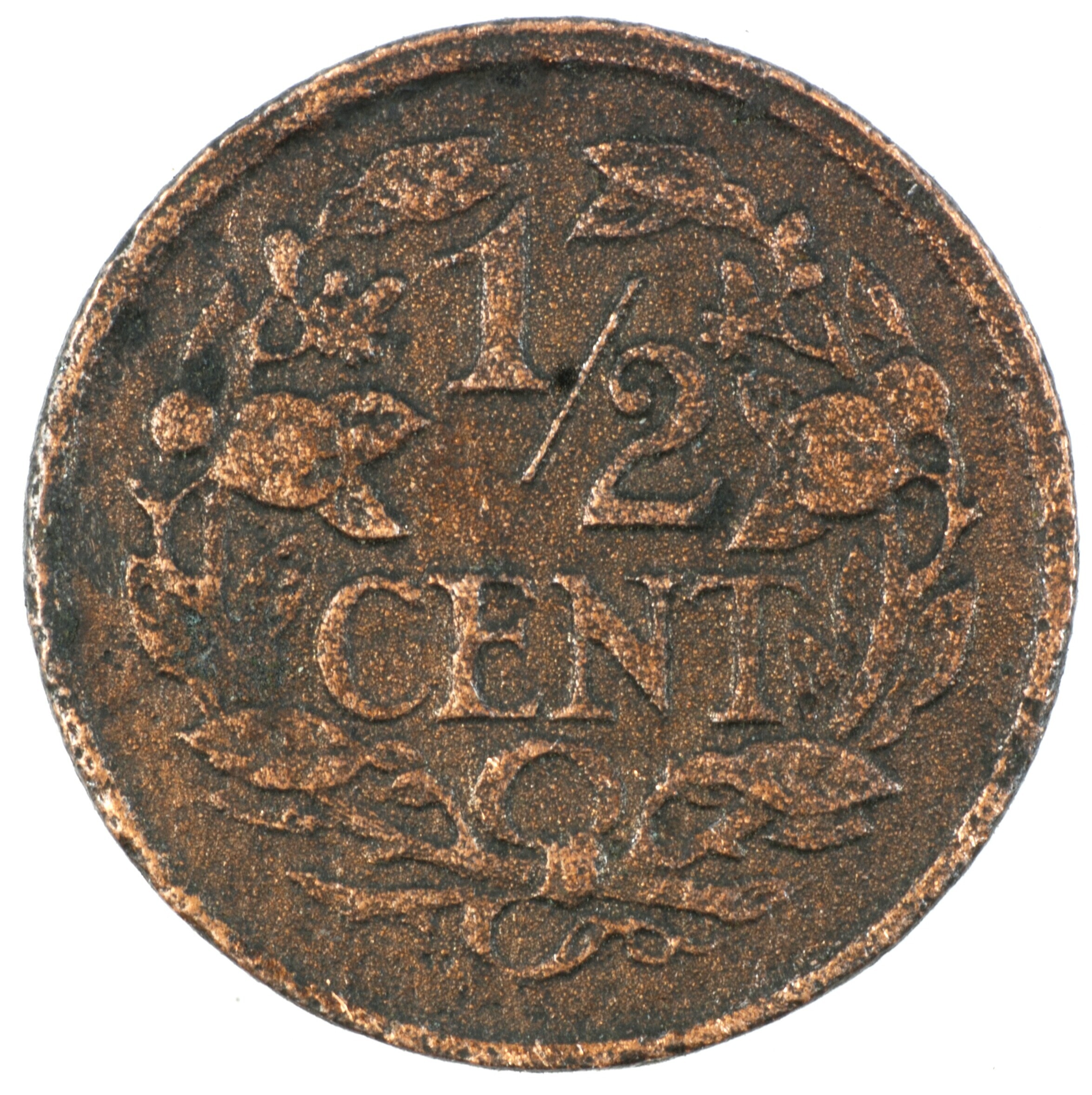 Halve cent; Nederland Koninkrijk (1813-heden); Wilhelmina (1890-1948); vz.: klimmende leeuw naar links met zwaard en pijlenbundel op een veld van azuur met zeventien blokken binnen parelcirkel, met omschrift (zeepaardje) KONINGRIJK DER NEDERLANDEN (mercuriusstaf) 1930; kz.: binnen een krans van twee samengebonden oranjetakken in twee regels: ½ / CENT; muntplaats: Utrecht; gewicht: 1.02 gram; referentie: Schulman ...