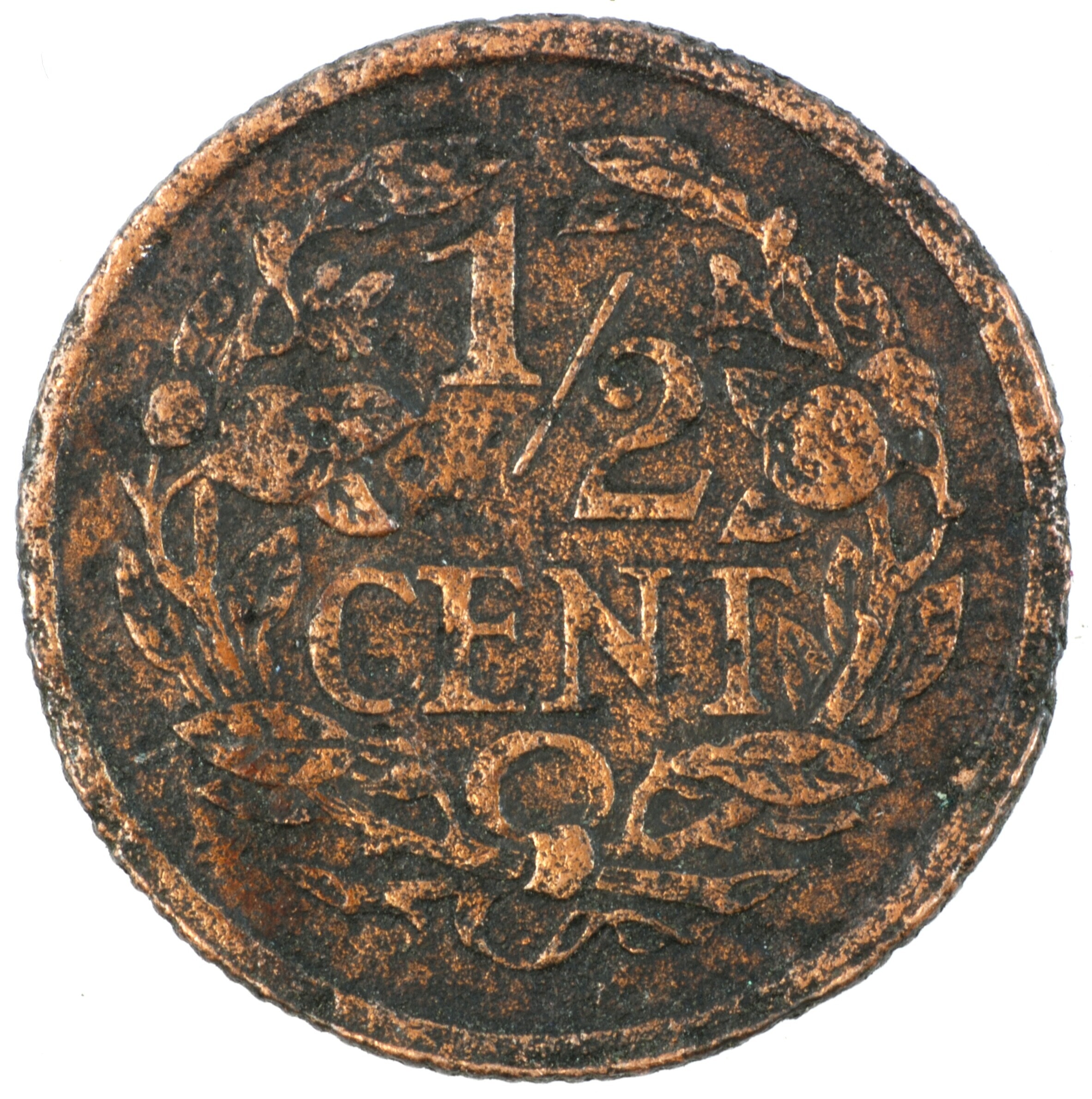Halve cent; Nederland Koninkrijk (1813-heden); Wilhelmina (1890-1948); vz.: klimmende leeuw naar links met zwaard en pijlenbundel op een veld van azuur met zeventien blokken binnen parelcirkel, met omschrift (druiventros) KONINGRIJK DER NEDERLANDEN (mercuriusstaf) 1938; kz.: binnen een krans van twee samengebonden oranjetakken in twee regels: ½ / CENT; muntplaats: Utrecht; gewicht: 1.17 gram; referentie: Schulman ...