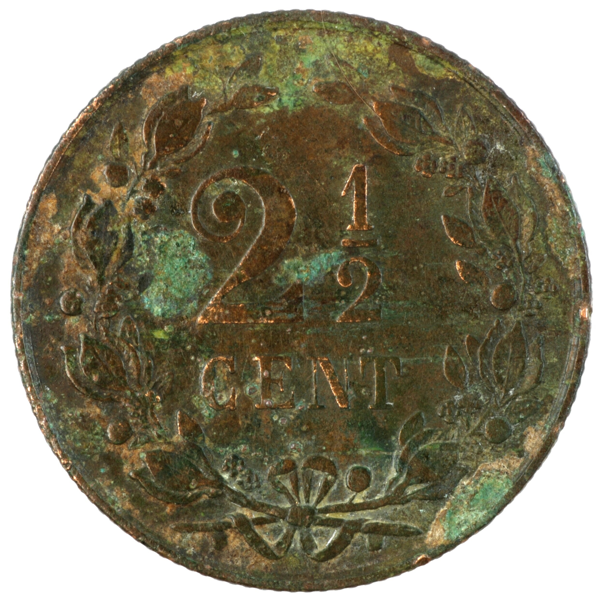 Tweeënhalve cent; Nederland Koninkrijk (1813-heden); Willem III (1849-1890); vz.: klimmende leeuw naar links met zwaard en pijlenbundel op een veld van azuur met zeventien blokken binnen parelcirkel, met omschrift (bijl) KONINGRI[JK DE]R NEDERLANDEN (mercuriusstaf) 1877; kz.: binnen een krans van twee samengebonden oranjetakken in twee regels: 2 ½ / CENT; muntplaats: Utrecht; gewicht: 3.93 gram; ...