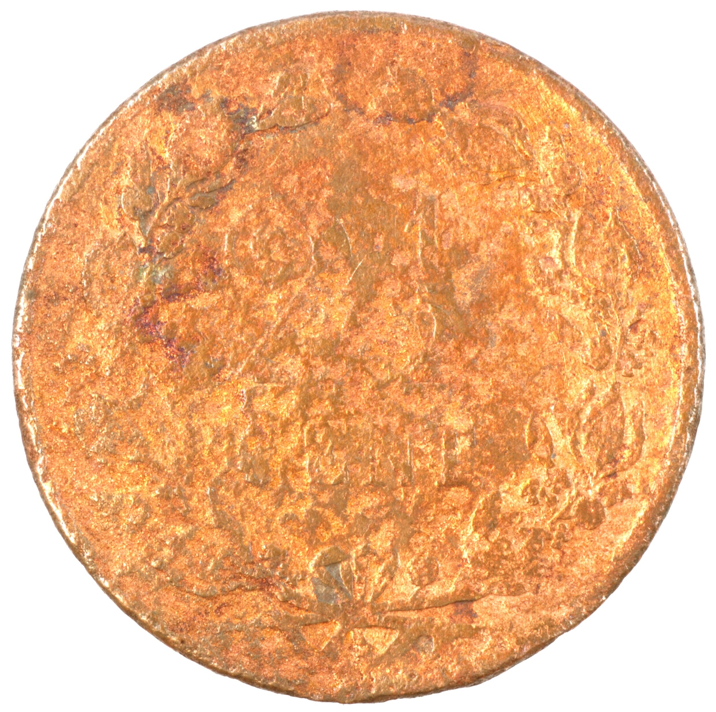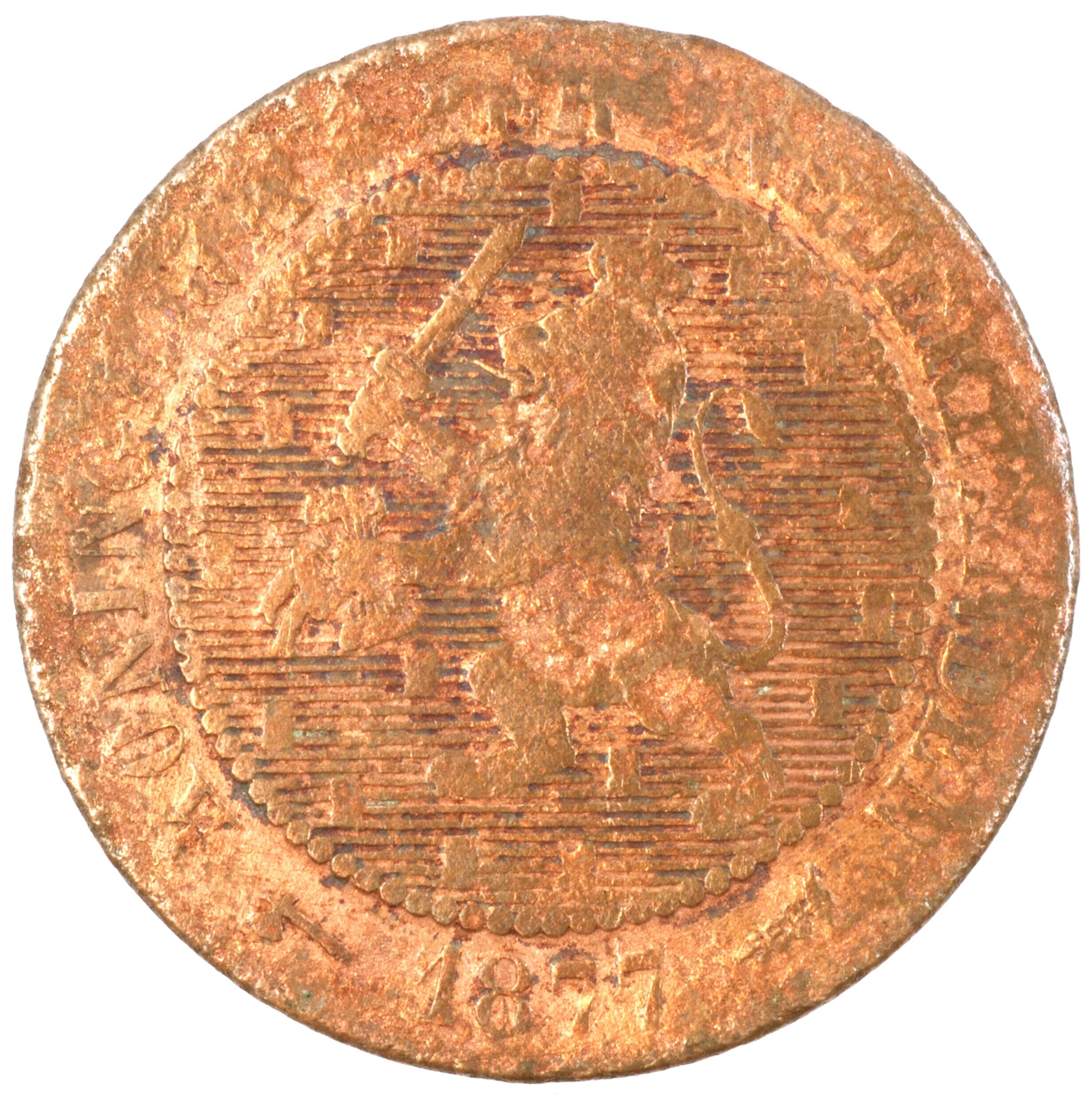 Tweeënhalve cent; Nederland Koninkrijk (1813-heden); Willem III (1849-1890); vz.: klimmende leeuw naar links met zwaard en pijlenbundel op een veld van azuur met zeventien blokken binnen parelcirkel, met omschrift (bijl) KONINGRI[JK DE]R NEDERLANDEN (mercuriusstaf) 1877; kz.: binnen een krans van twee samengebonden oranjetakken in twee regels: 2 ½ / CENT; muntplaats: Utrecht; 3.58 gram; referentie: ...