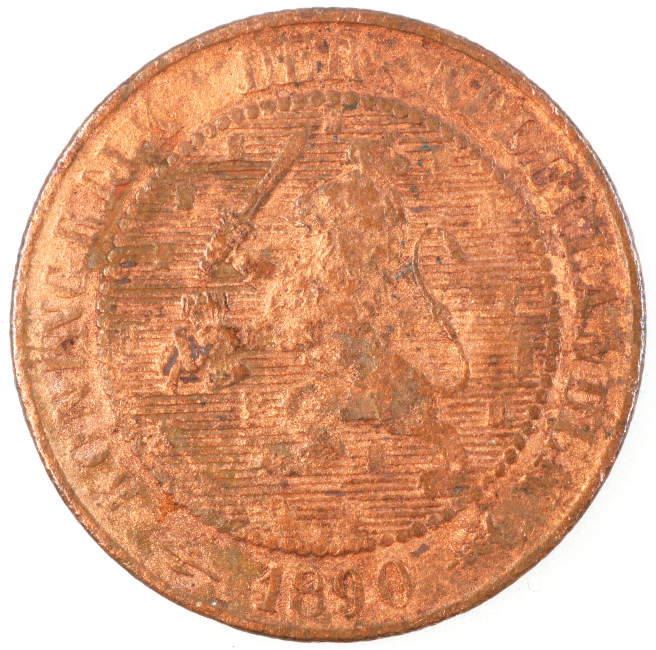 Tweeënhalve cent; Nederland Koninkrijk (1813-heden); Willem III (1849-1890); vz.: klimmende leeuw naar links met zwaard en pijlenbundel op een veld van azuur met zeventien blokken binnen parelcirkel, met omschrift (bijl) KONINGRI[JK DE]R NEDERLANDEN (mercuriusstaf) 1890; kz.: binnen een krans van twee samengebonden oranjetakken in twee regels: 2 ½ / CENT; muntplaats: Utrecht; 3.66 gram; referentie: ...
