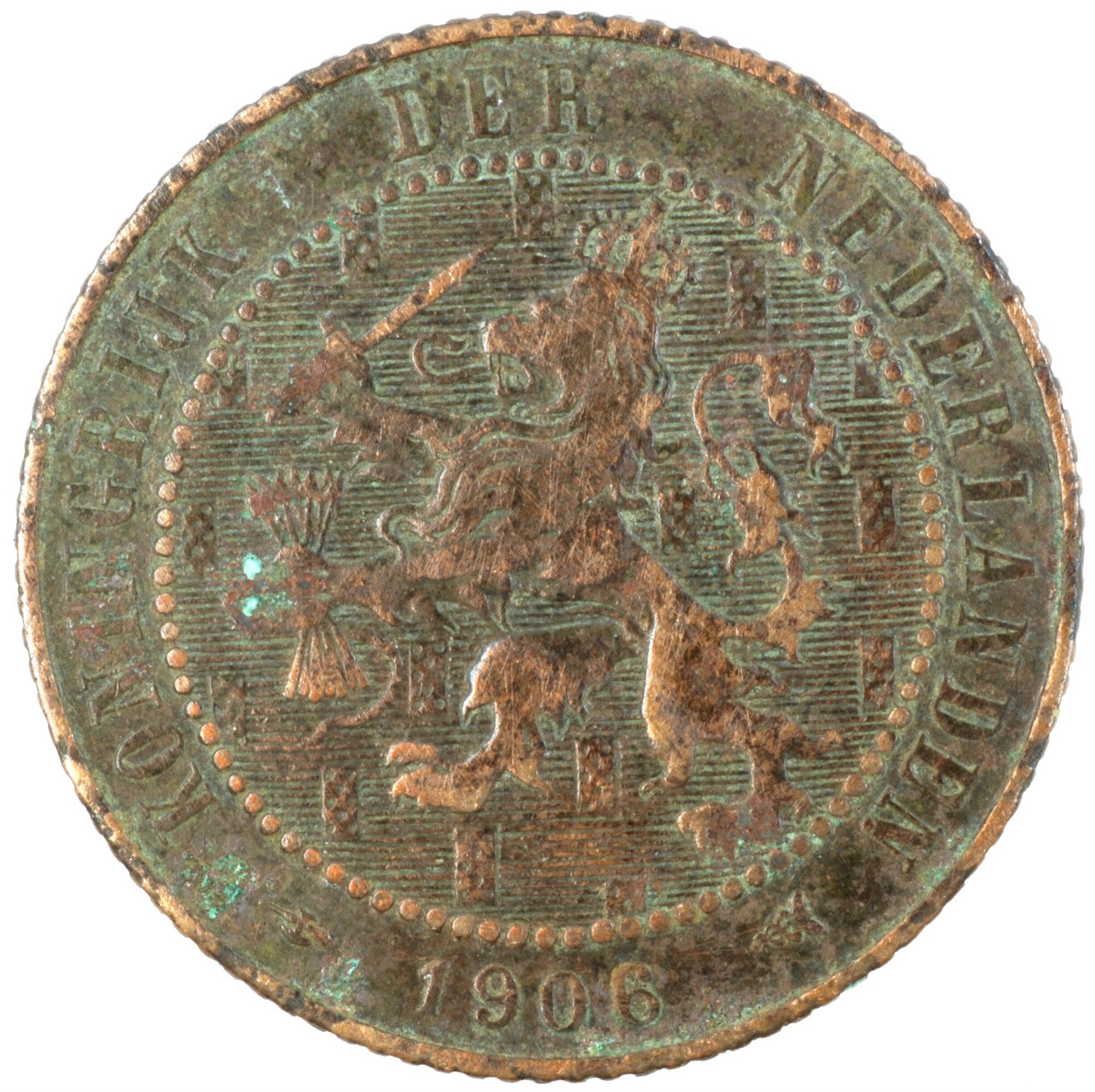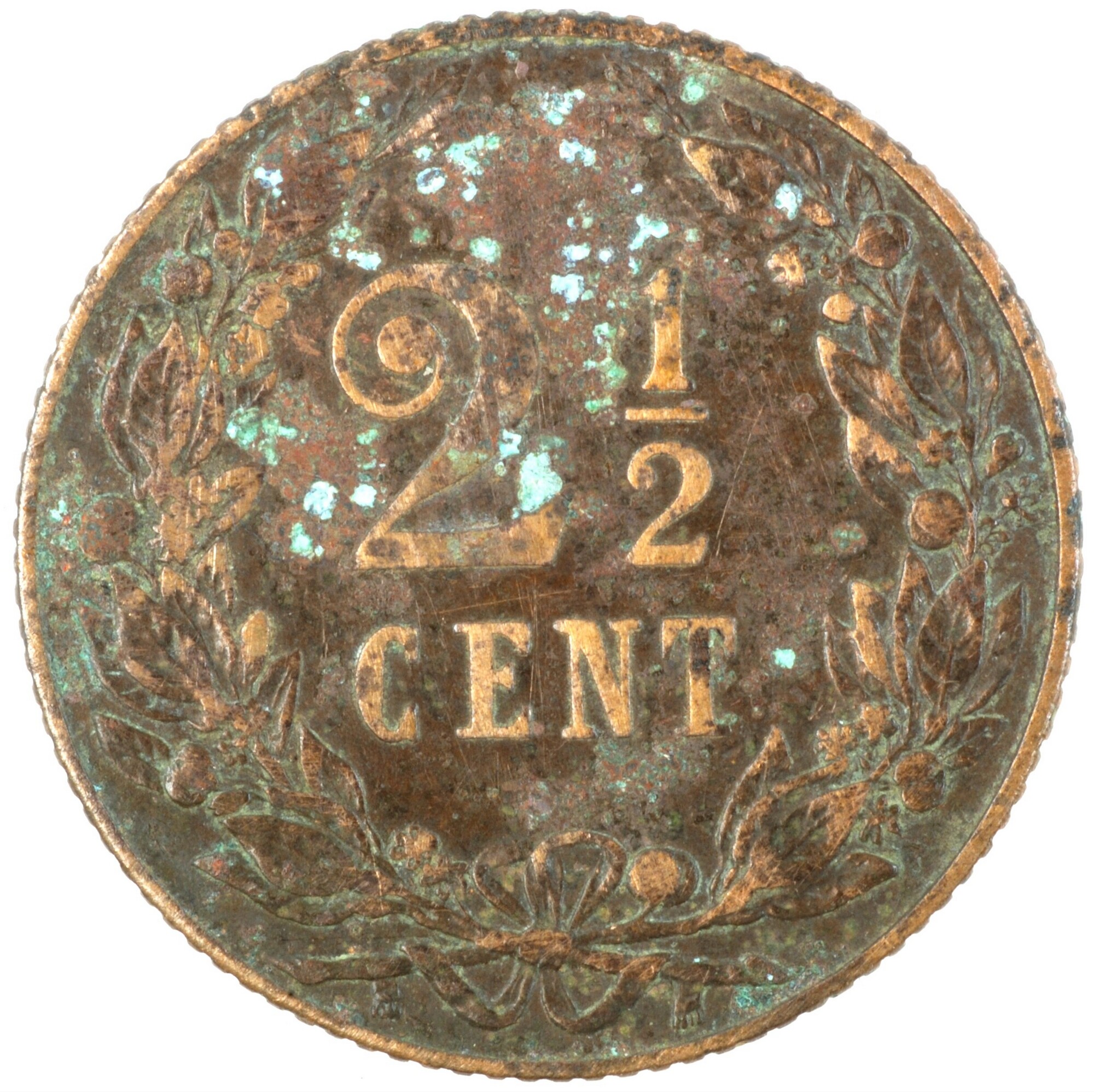 Tweeënhalve cent; Nederland Koninkrijk (1813-heden); Wilhelmina (1890-1948); vz.: klimmende leeuw naar links met zwaard en pijlenbundel op een veld van azuur met vijftien blokken binnen parelcirkel, met omschrift (hellebaard) KONINGRIJK DER NEDERLANDEN (mercuriusstaf) 1906; kz.: binnen een krans van twee samengebonden oranjetakken in twee regels: 2 ½ / CENT; muntplaats: Utrecht; 3.97 gram; referentie: Schulman ...