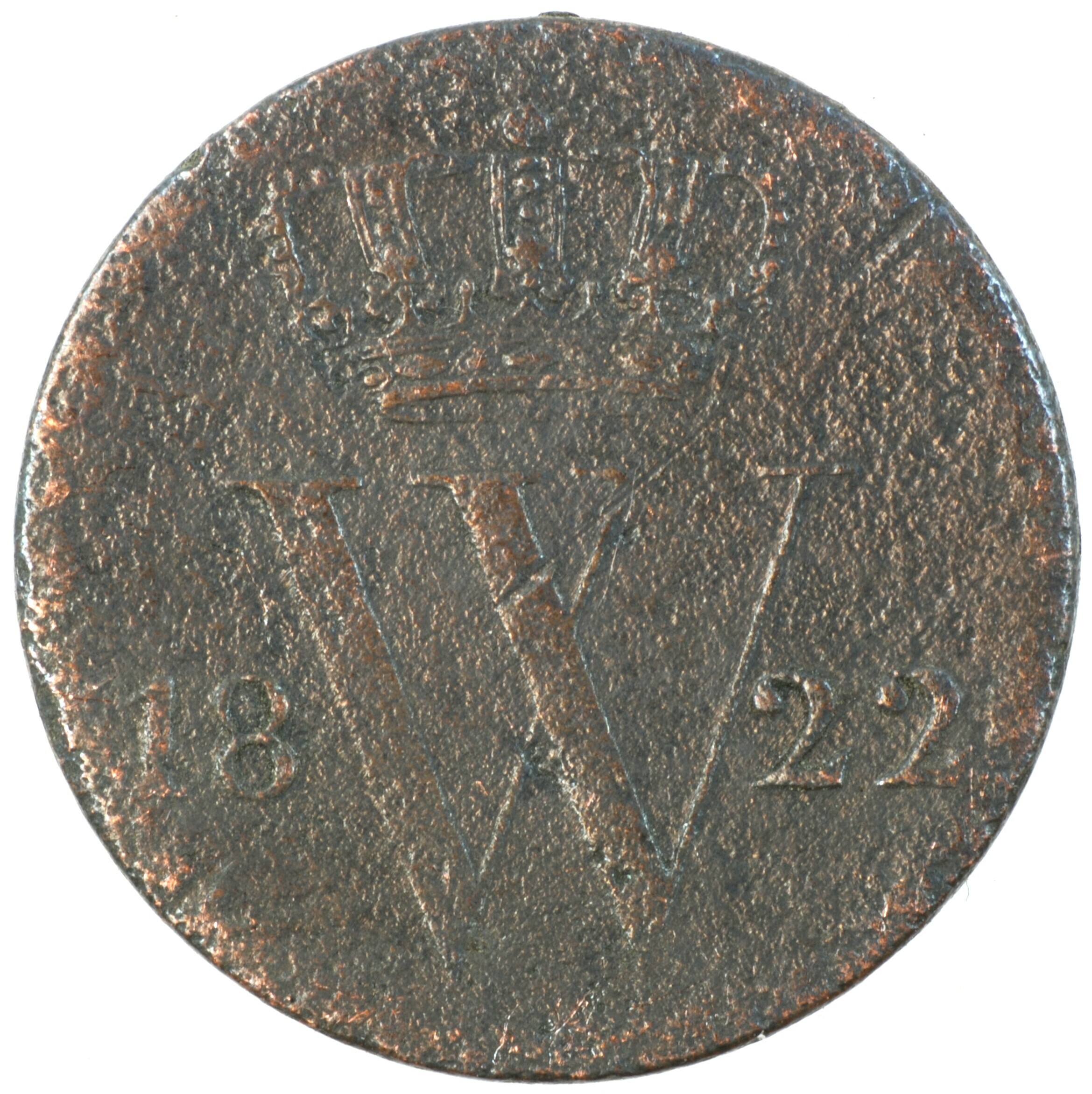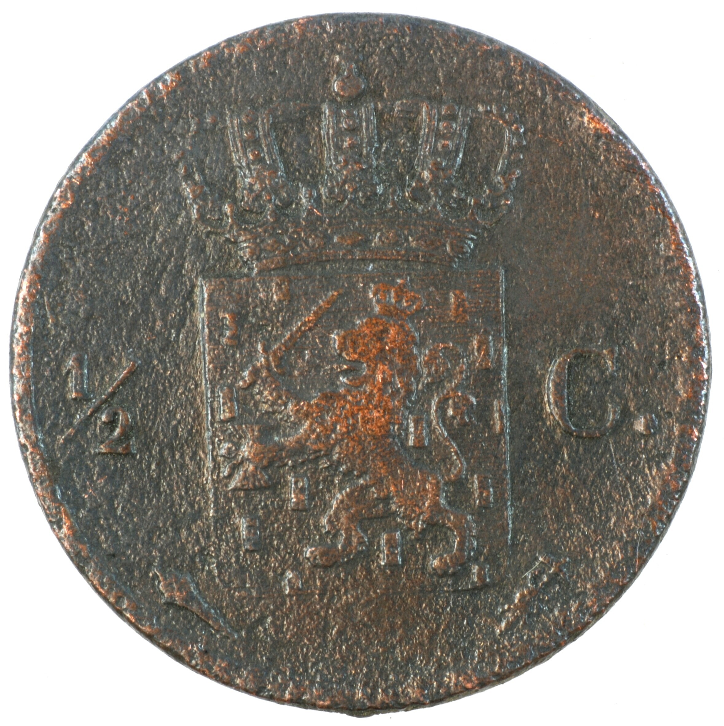 Halve cent; Nederland Koninkrijk (1813-heden); Willem I (1813-1840); vz.: gekroond W met ter weerszijden 18 – 22; kz.: gekroond Nederlands wapen met ter weerszijden ½ - C., met onder het wapen (fakkel) en (mercuriusstaf); muntplaats: Utrecht; gewicht: 1.81 gram; referentie: Schulman 353