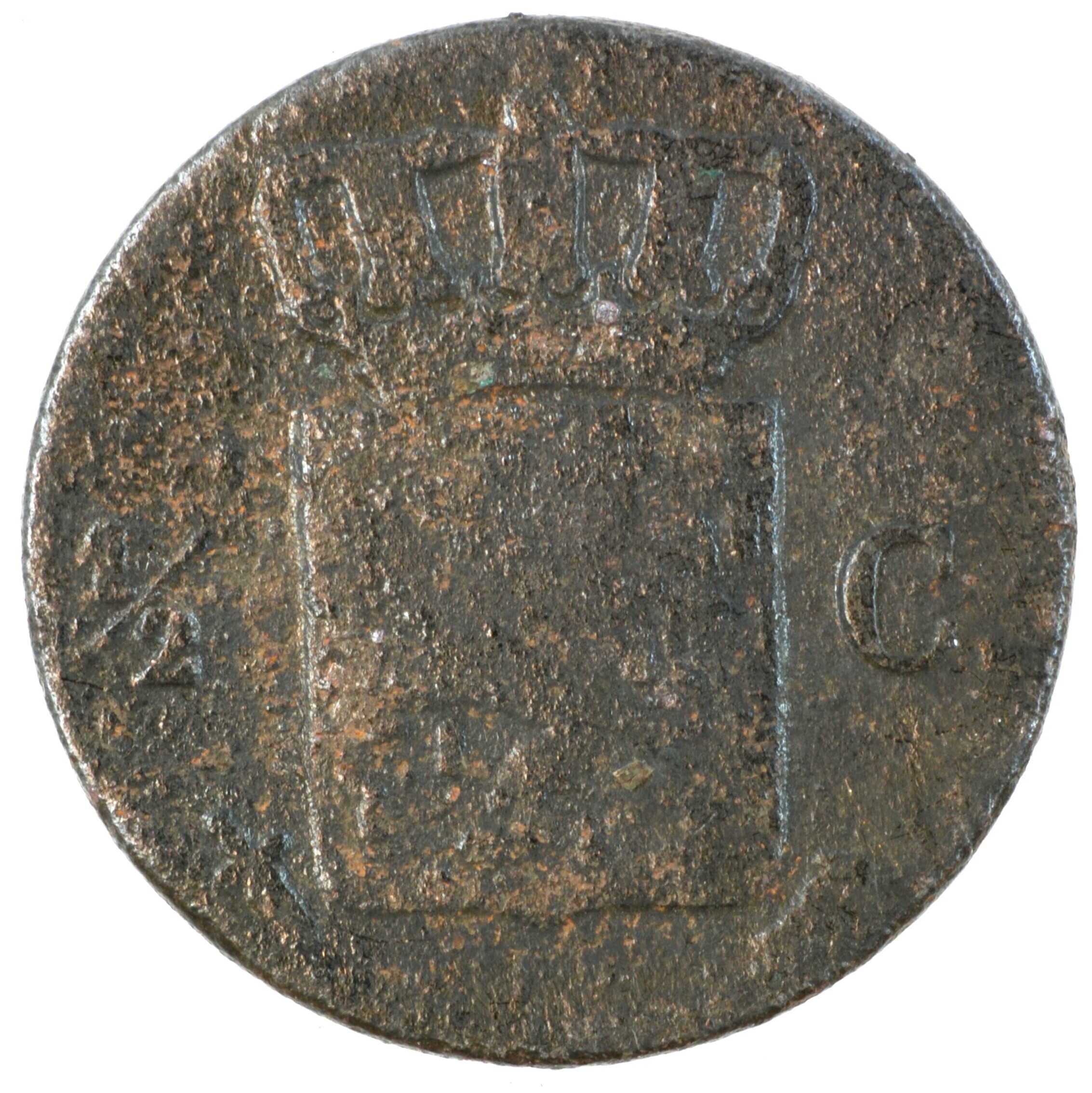 Halve cent; Nederland Koninkrijk (1813-heden); Willem III (1849-1890); vz.: gekroond W met ter weerszijden 18 – 50; kz.: gekroond Nederlands wapen met ter weerszijden ½ - C., met onder het wapen (zwaard) en (mercuriusstaf); muntplaats: Utrecht; gewicht: 1.81 gram; referentie: Schulman 703