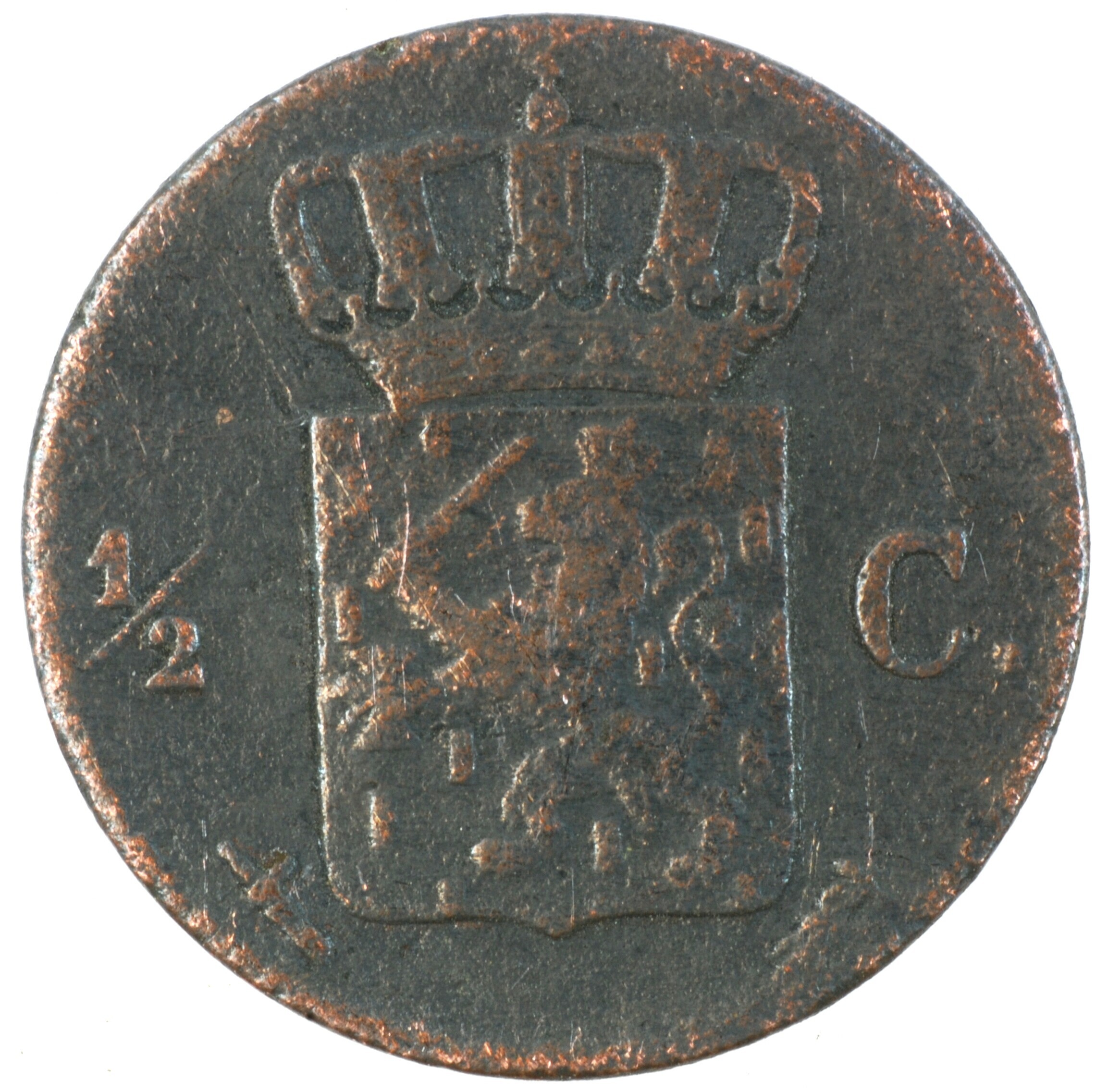 Halve cent; Nederland Koninkrijk (1813-heden); Willem III (1849-1890); vz.: gekroond W met ter weerszijden 18 – 70; kz.: gekroond Nederlands wapen met ter weerszijden ½ - C., met onder het wapen (zwaard) en (mercuriusstaf); muntplaats: Utrecht; gewicht: 1.86 gram; referentie: Schulman 718