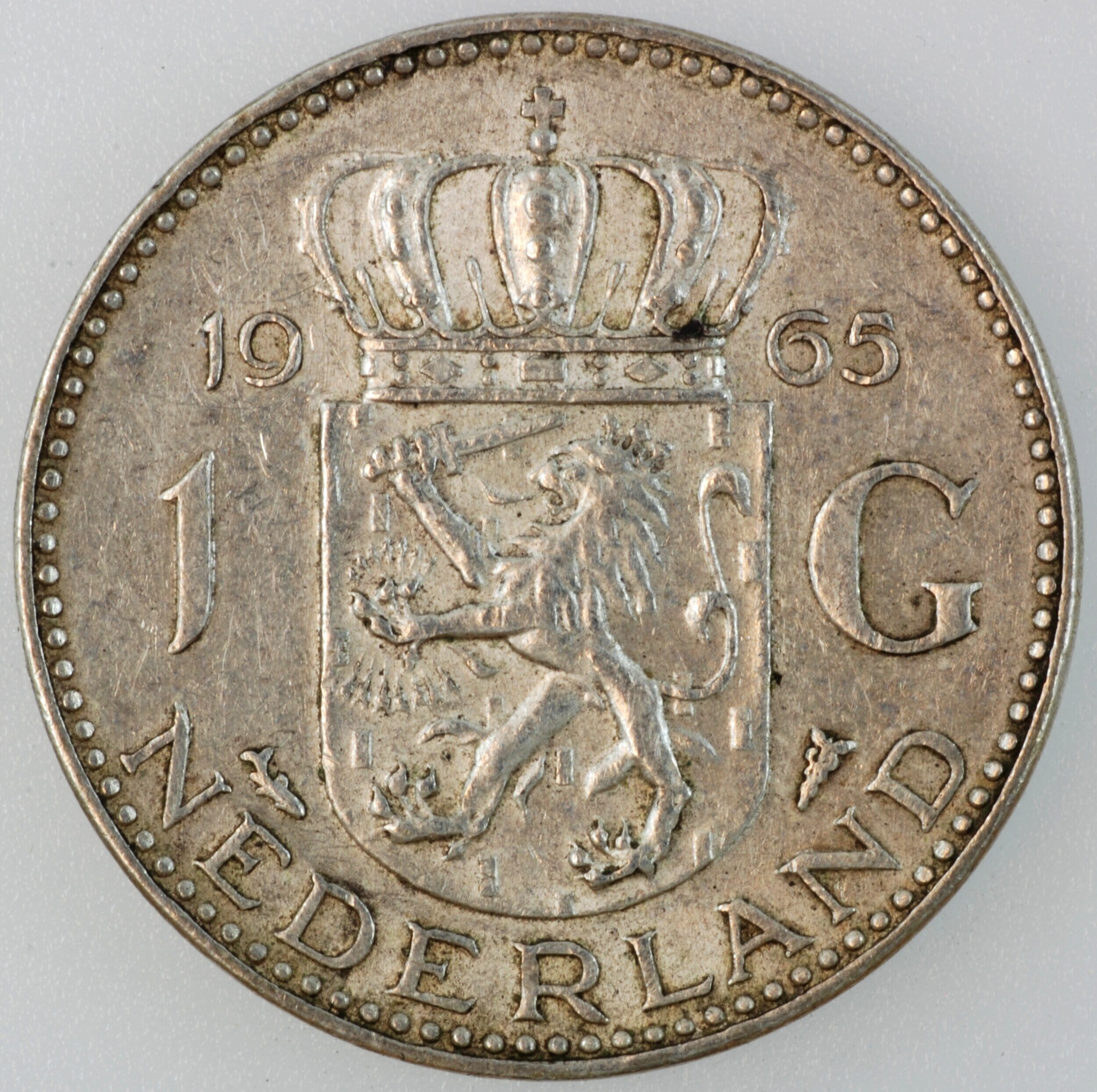 Gulden; Nederland Koninkrijk (1813-heden); Juliana (1948-1980); vz.: hoofd naar links met W aan onderzijde van de nek, met omschrift JULIANA KONINGIN DER NEDERLANDEN•; kz.: gekroond wapenschild met klimmende leeuw naar links met ter weerszijden 19 – 65 / 1 – G / (vis) – (mercuriusstaf) en aan onderzijde NEDERLAND; muntplaats: Utrecht; gewicht: 6.50 gram; referentie: ...