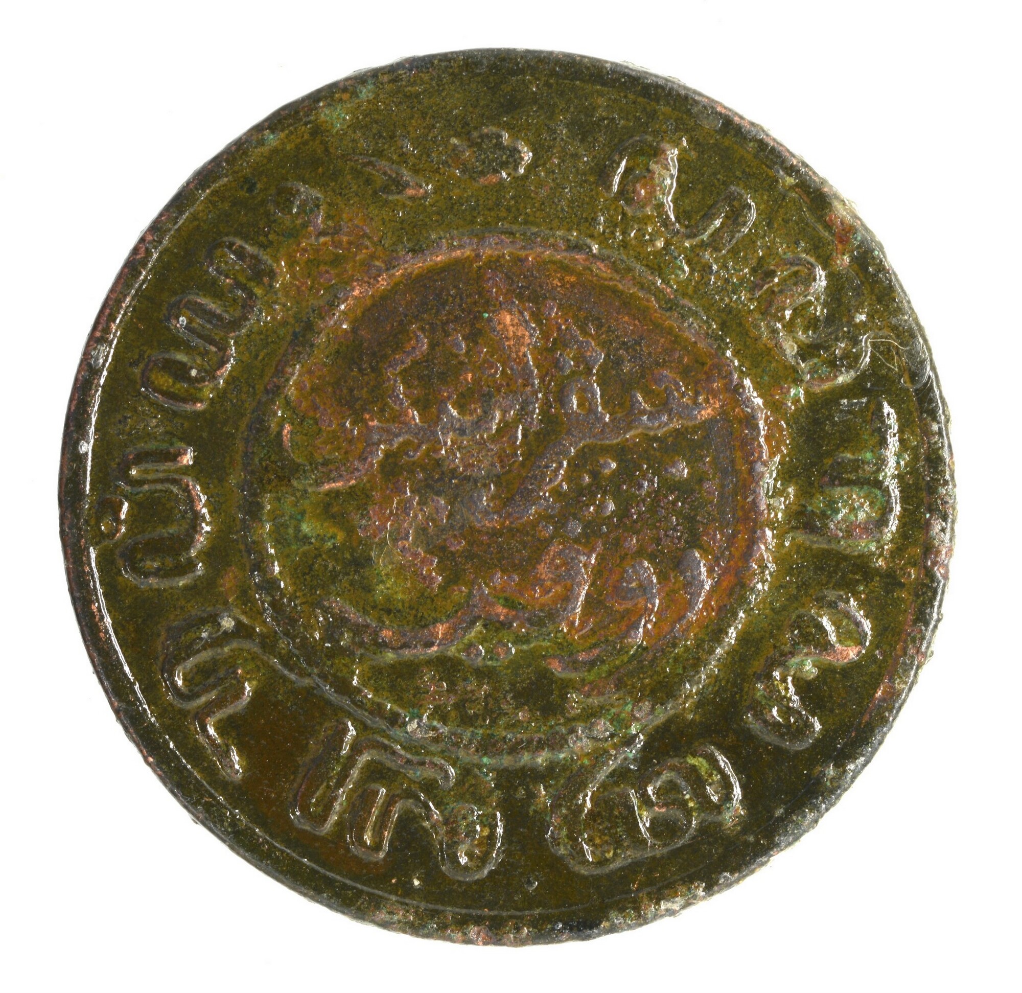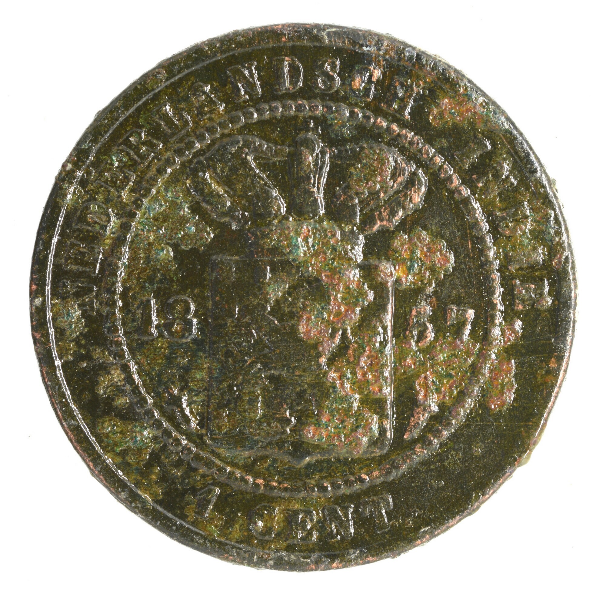 1 cent Nederlands Indie; vz.: het wapen van het Koninkrijk der Nederlanden met het jaartal 1857 en randschrift 1 CENT NEDERLANDSCH INDIE; kz.: Oud-Javaans schrift; gewicht: 4.67 gram