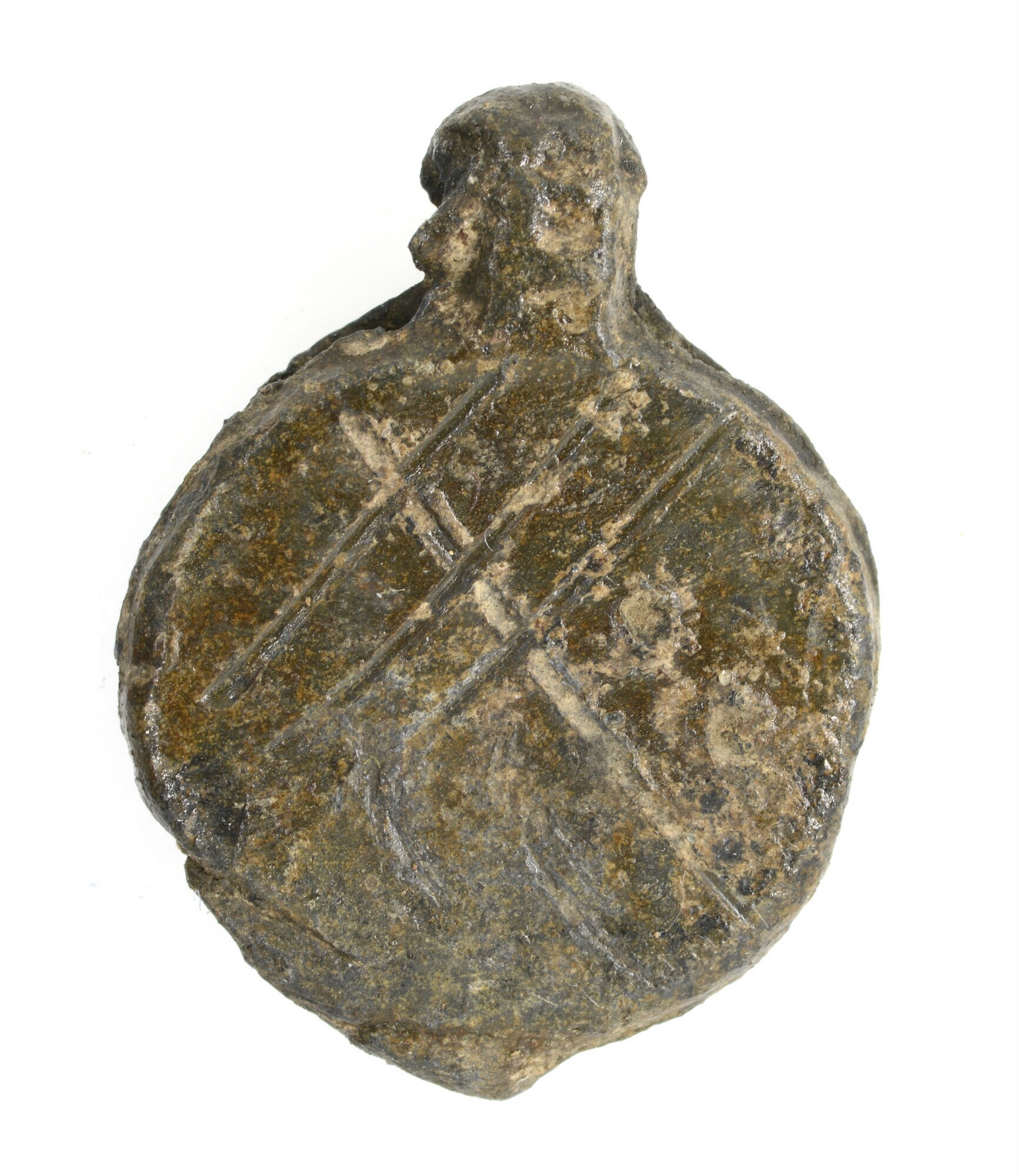 Deelbewerkerslood/textiellood; pb-tex; vz.: huismerk; kz.: ingekraste strepen (telmerk)