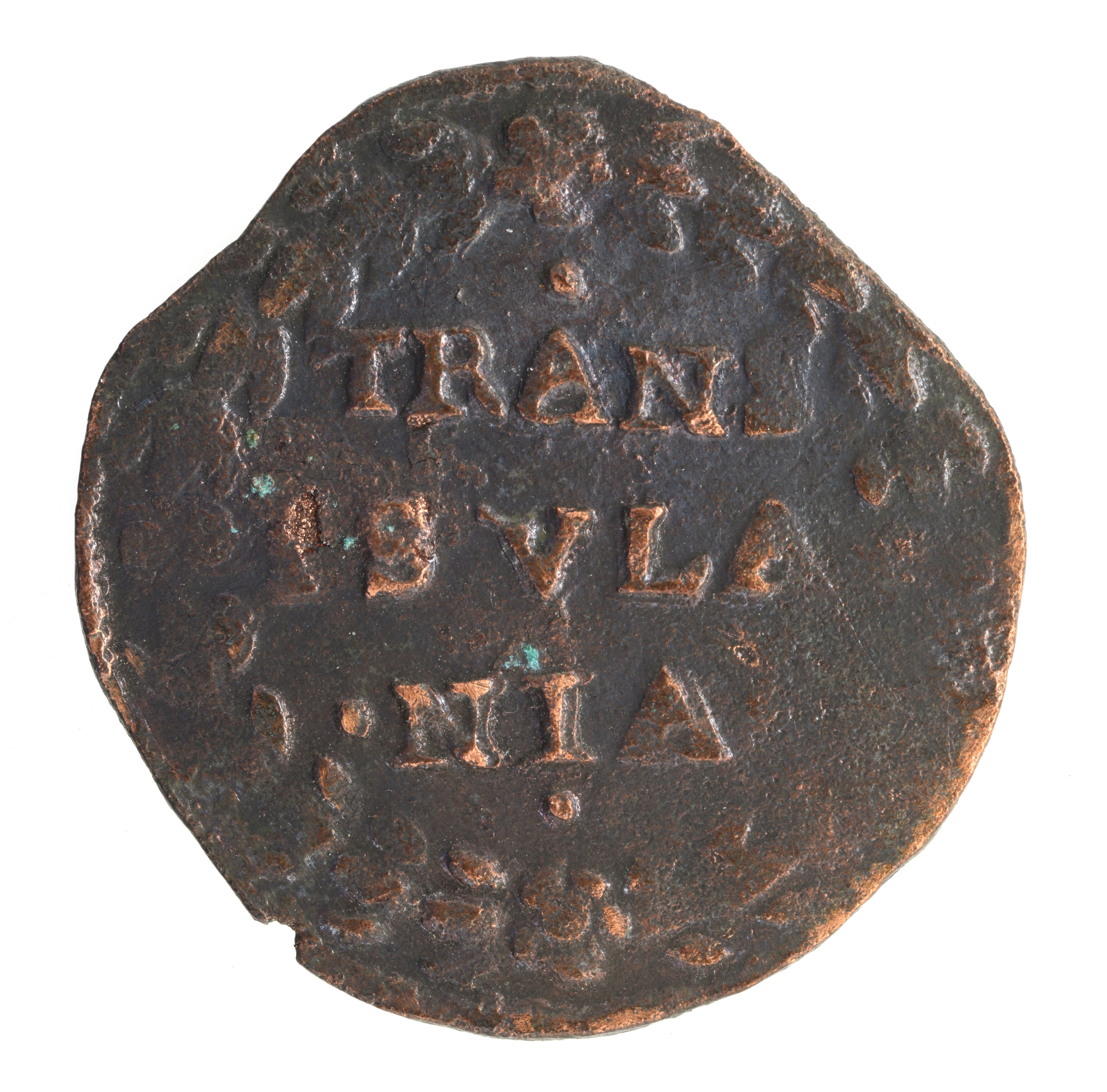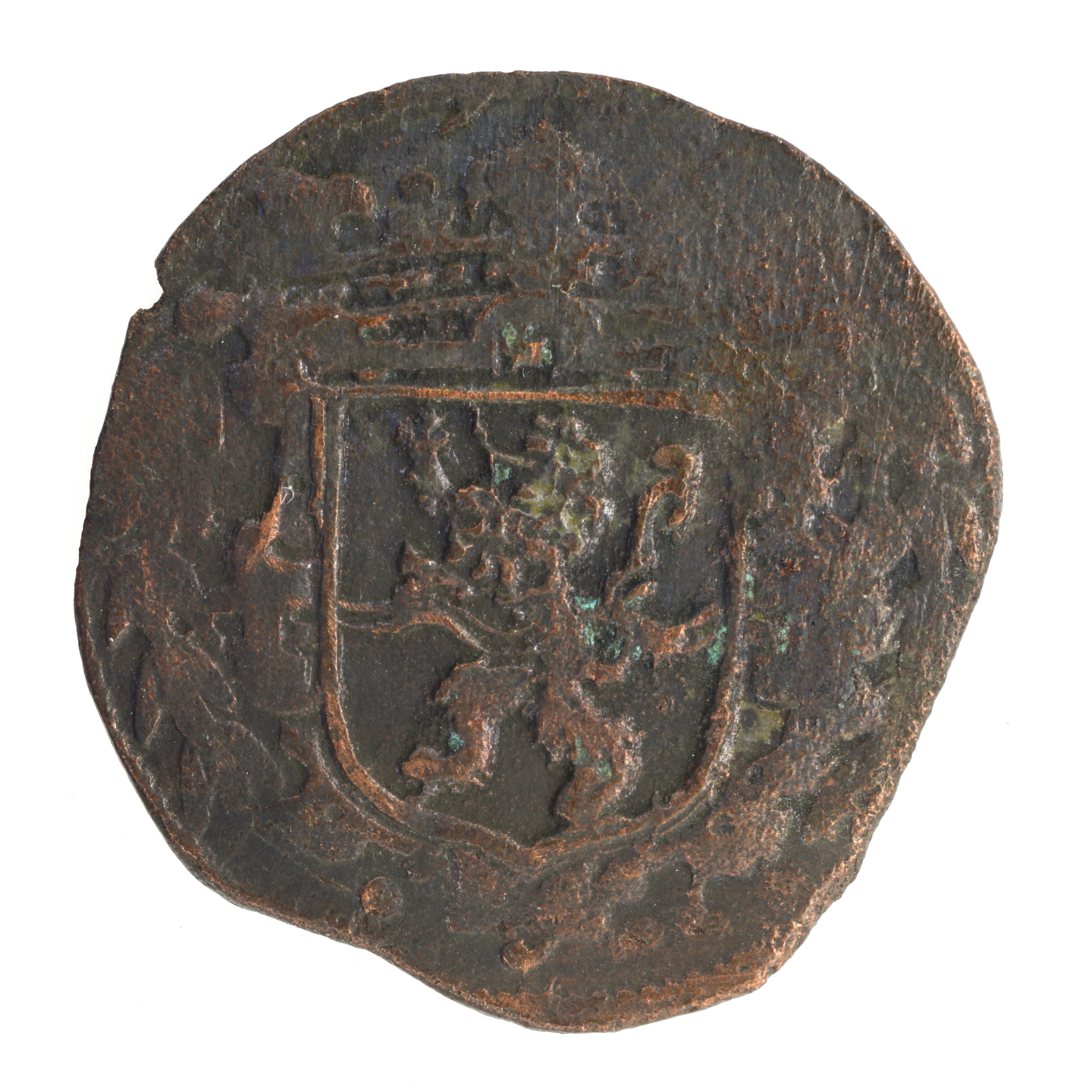 Duit; Overijssel Provincie (1581-1795); vz.: Een tulpkrans met daarin de tekst TRANS ISVLA NIA in drie regels zonder jaartal; kz.: Gekroond wapen van Overijssel, hierin staat een klauwende leeuw met op de achtergrond een golvende lijn wat de rivier de IJssel moet voorstellen. De rand van het wapen is bewerkt. Dit type is MET tulpkrans ...