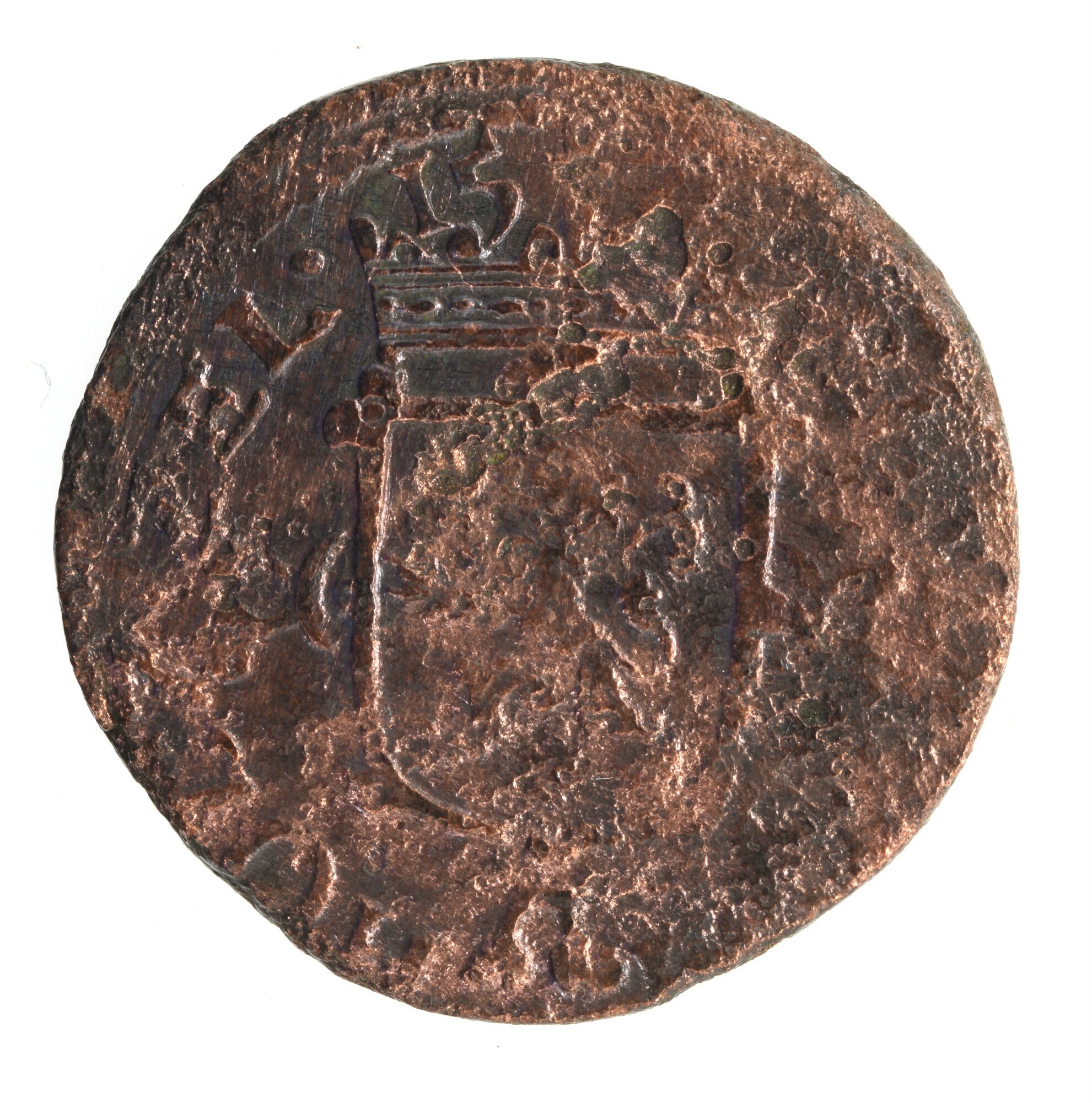 Oord; Holland Provincie (1581-1795); vz.: Gekroond wapenschild met leeuw naar links, gelegen op een stokkenkruis en randtekst PHS. D:G. COM. HOL. Z. ZEL; kz.: De Hollandse maagd zittende in een gesloten tuin. Zij wijst met haar rechterhand naar een zonnige hemel als teken van het vertrouwen op de Heer en randtekst AVX. NOS. IN. NOM. ...