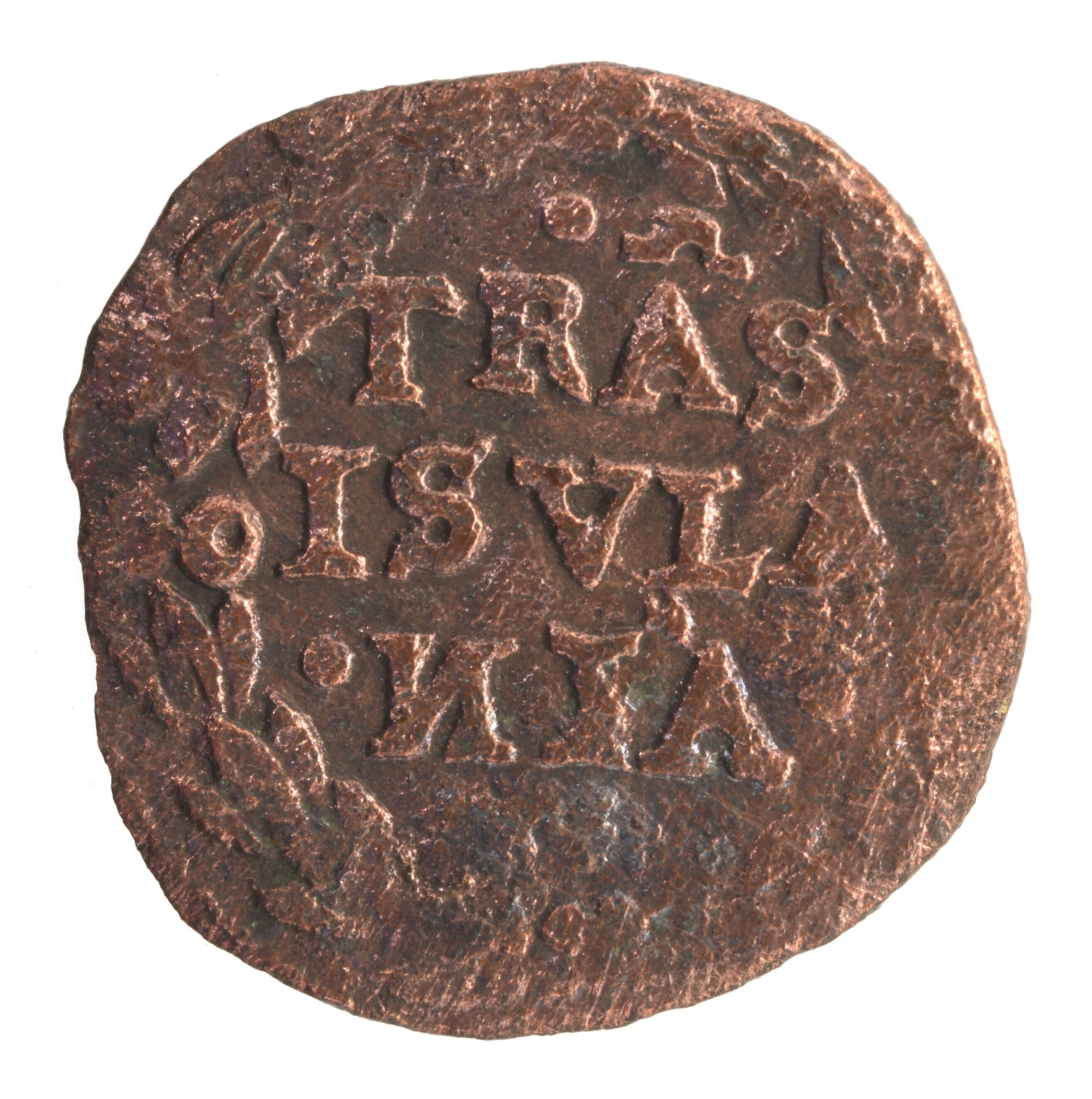 Duit; Overijssel Provincie (1581-1795); vz.: Een tulpkrans met daarin de tekst TRAS ISVLA NIA in drie regels zonder jaartal; kz.: Gekroond wapen van Overijssel, hierin staat een klauwende leeuw met op de achtergrond een golvende lijn wat de rivier de IJssel moet voorstellen; gewicht: 1.58 gram