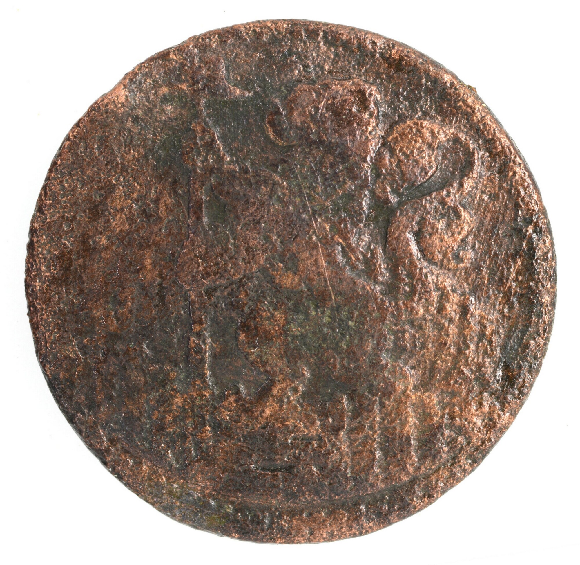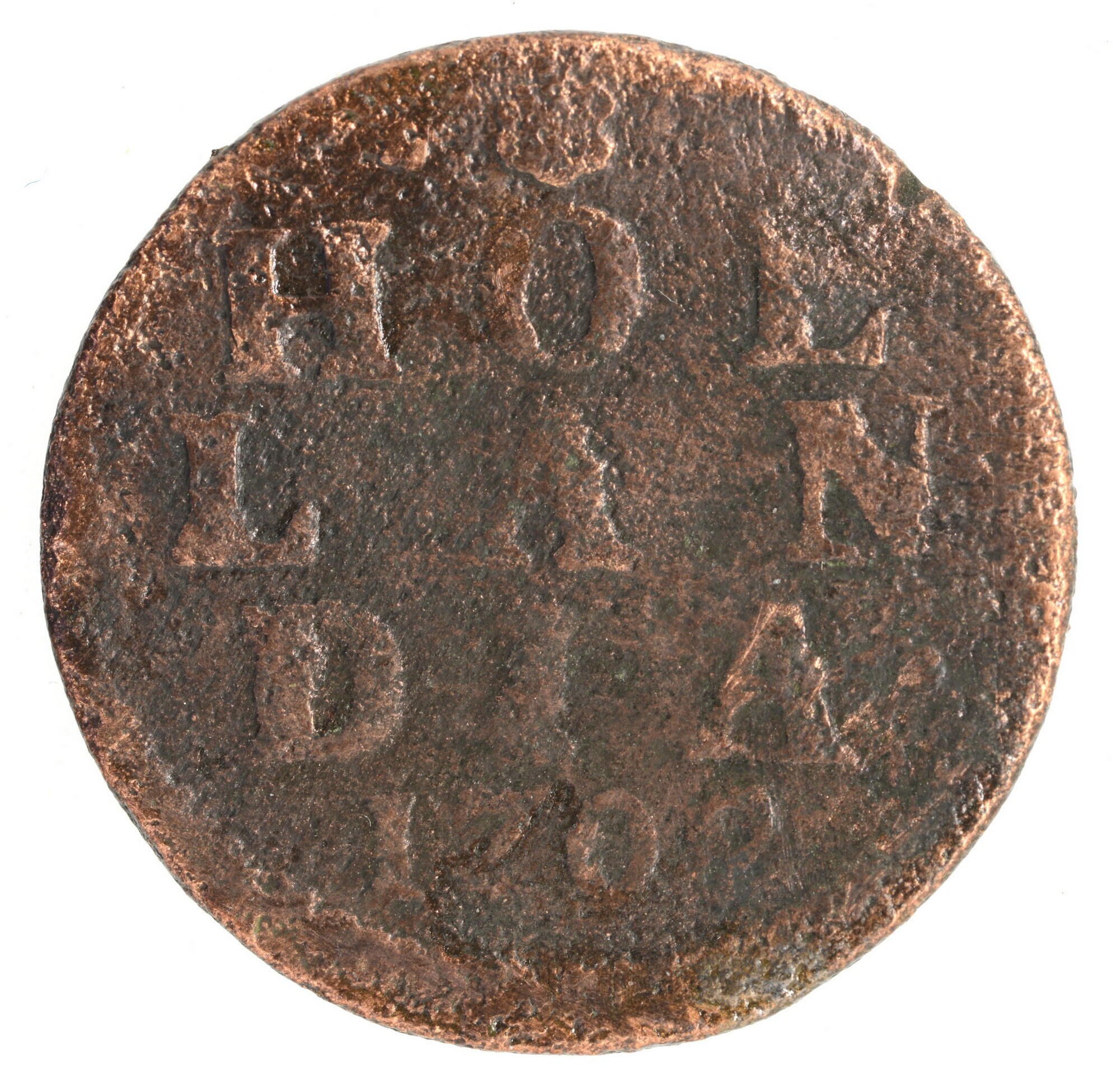 Duit; Holland Provincie (1581-1795); vz.: HOL LAN DIA in drie regels en het jaartal 1702; kz.: Een leeuw naar links in een gesloten Hollandse tuin. De leeuw heeft met zijn klauwen een speer vast met op de punt de zogenaamde vrijheidshoed; gewicht: 3.24 gram