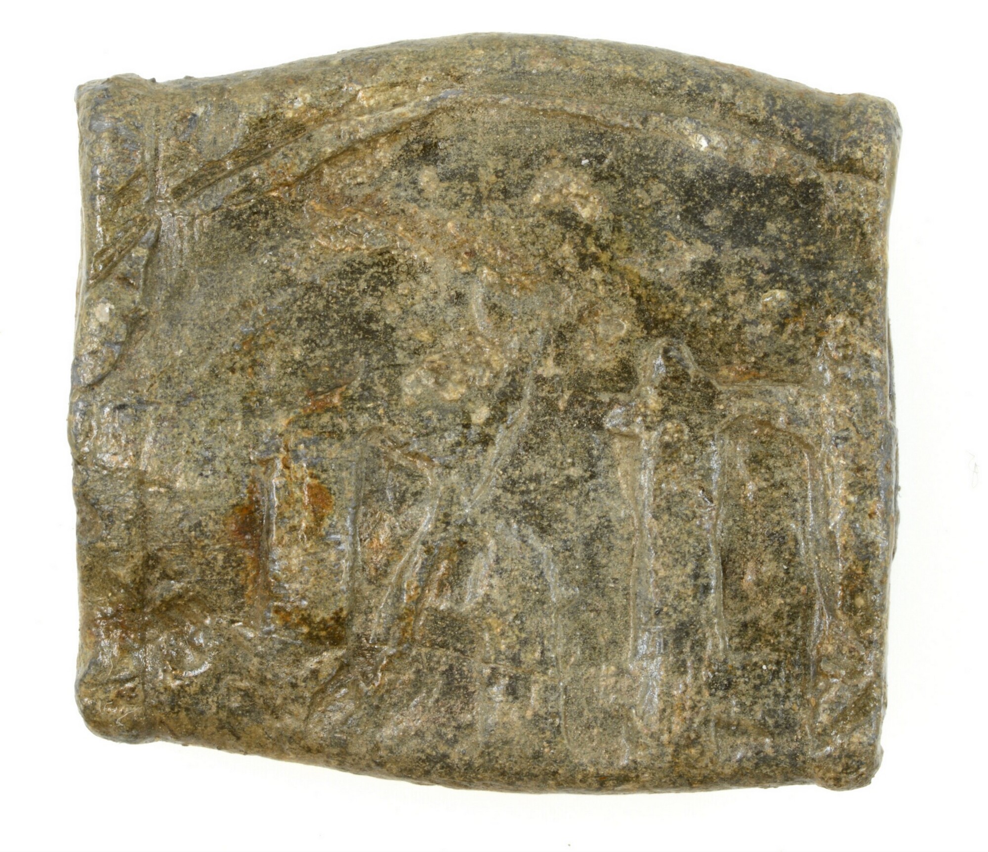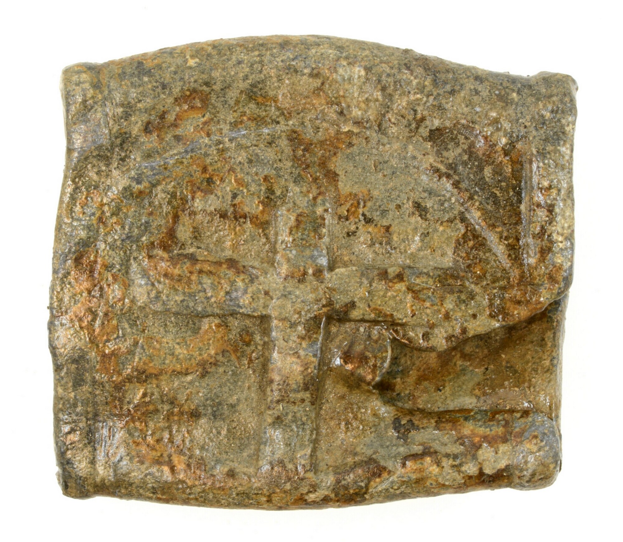 Pijplood; vz.: ronde stempel met patriarchaal kruis (het wapen van Ieper) binnen een cirkel. Rondom de cirkel is een rand met stippen aanwezig; kz.: gotische letters