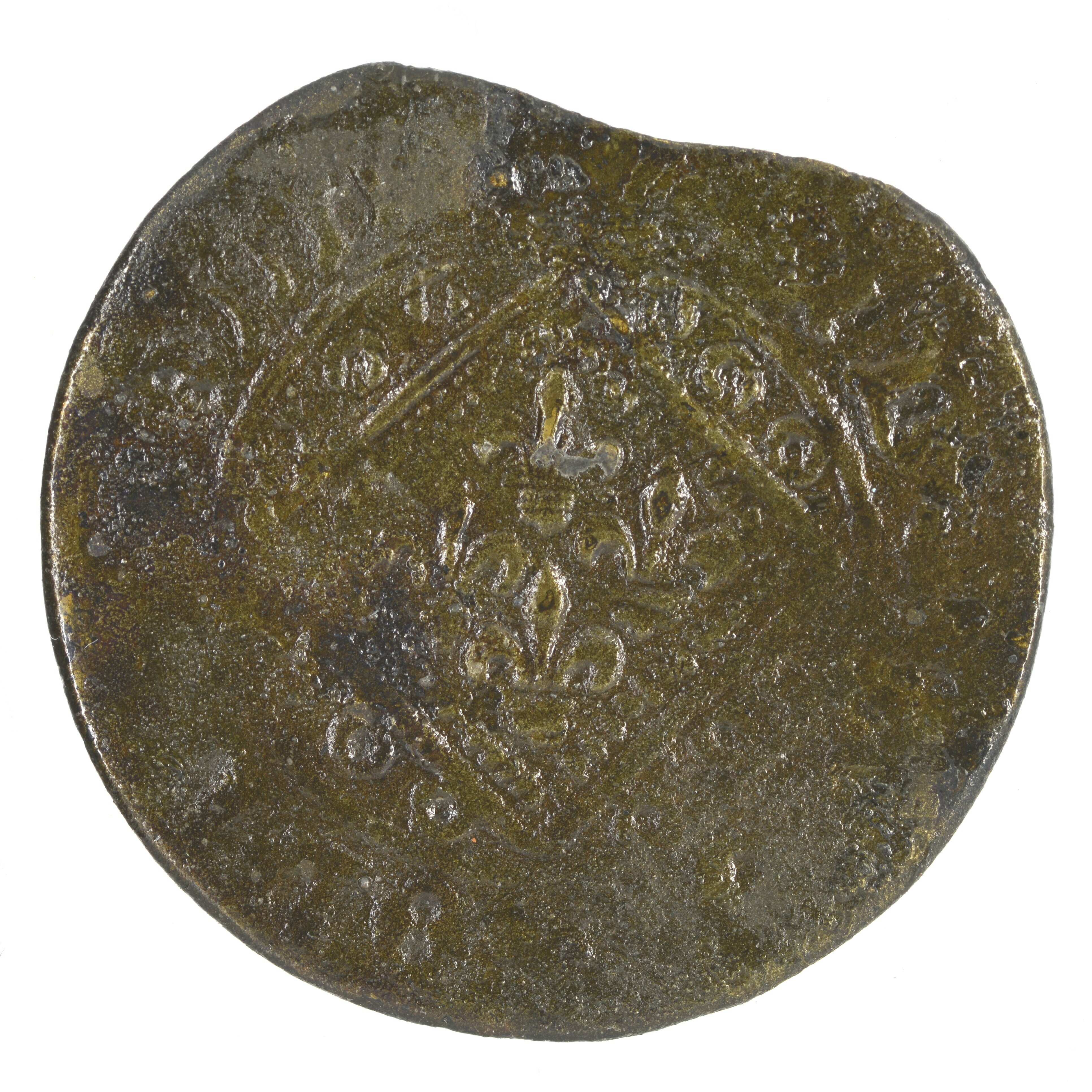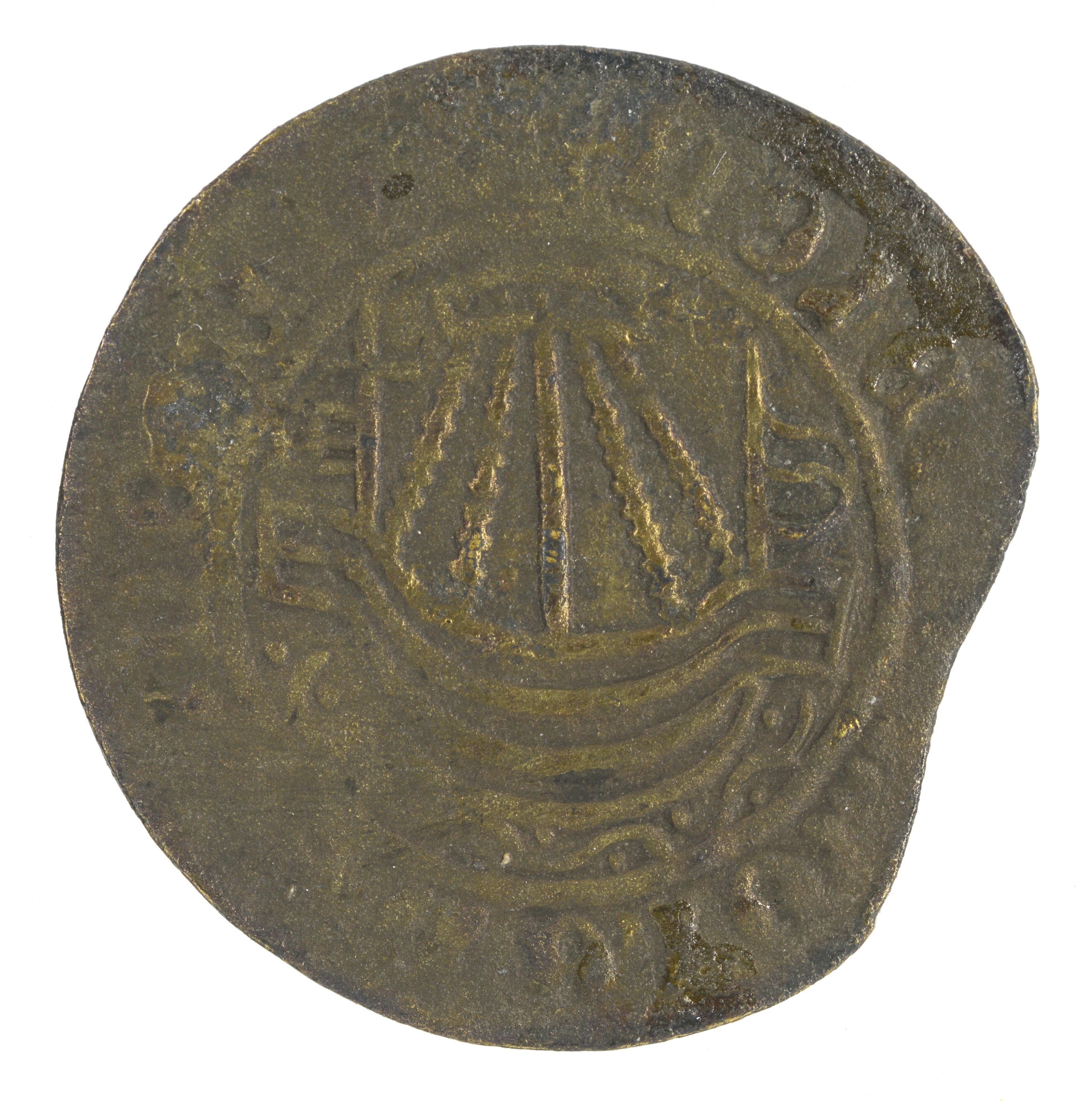 Rekenpenning; vz.: koggeschip met pseudo randtekst; kz.: een ruit met vier Franse lelies en pseudo randtekst; gewicht: 2.20 gram
