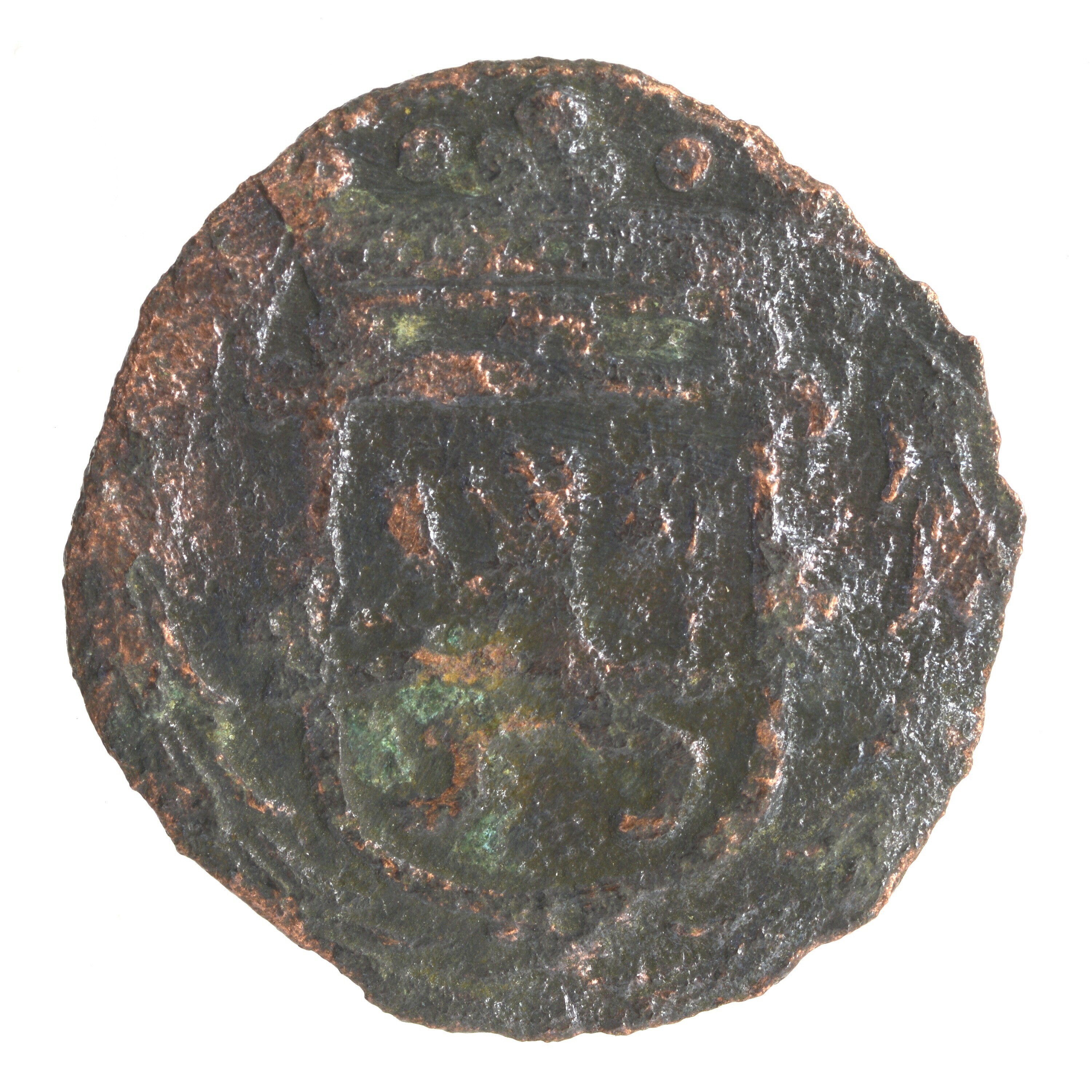 Duit; Overijssel Provincie (1581-1795); vz.: tulpkrans met daarin de tekst TRAS ISVLA .NIA. (of variant) in drie regels met daaronder het jaartal 1628; kz.: Gekroond wapen van Overijssel met klauwende leeuw naar links en langs het wapen loopt een tulpkrans; gewicht: 1.16 gram