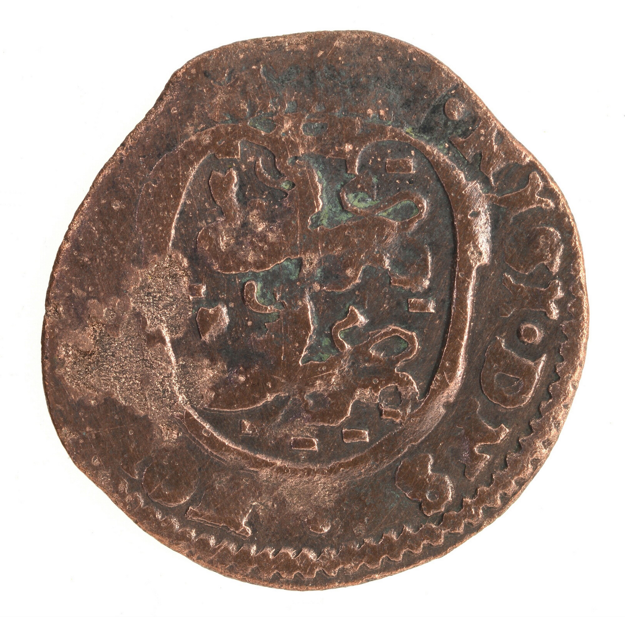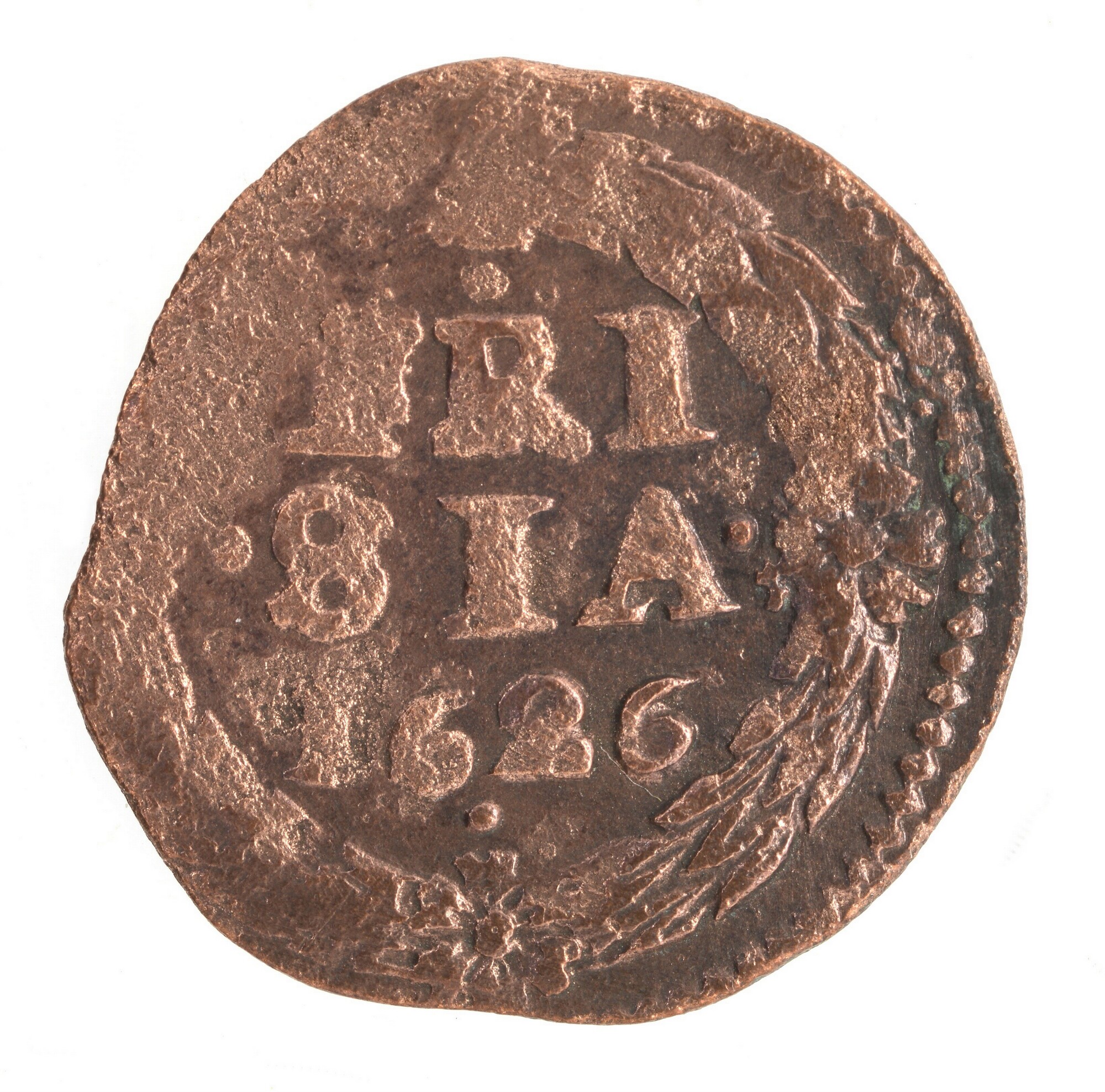 Duit; Friesland Provincie (1581-1795); vz.: tulpkrans met daarin de tekst FRI SIA in twee regels, daaronder het jaartal 1626; kz.: Gekroond wapen van Friesland met twee gaande leeuwen boven elkaar. Het wapen heeft geen versieringen meer, is aan de onderzijde ronder en heeft aan de bovenzijde twee instulpingen en tekst .NISI. DNS. NOBISCVM.; gewicht: 1.87 ...