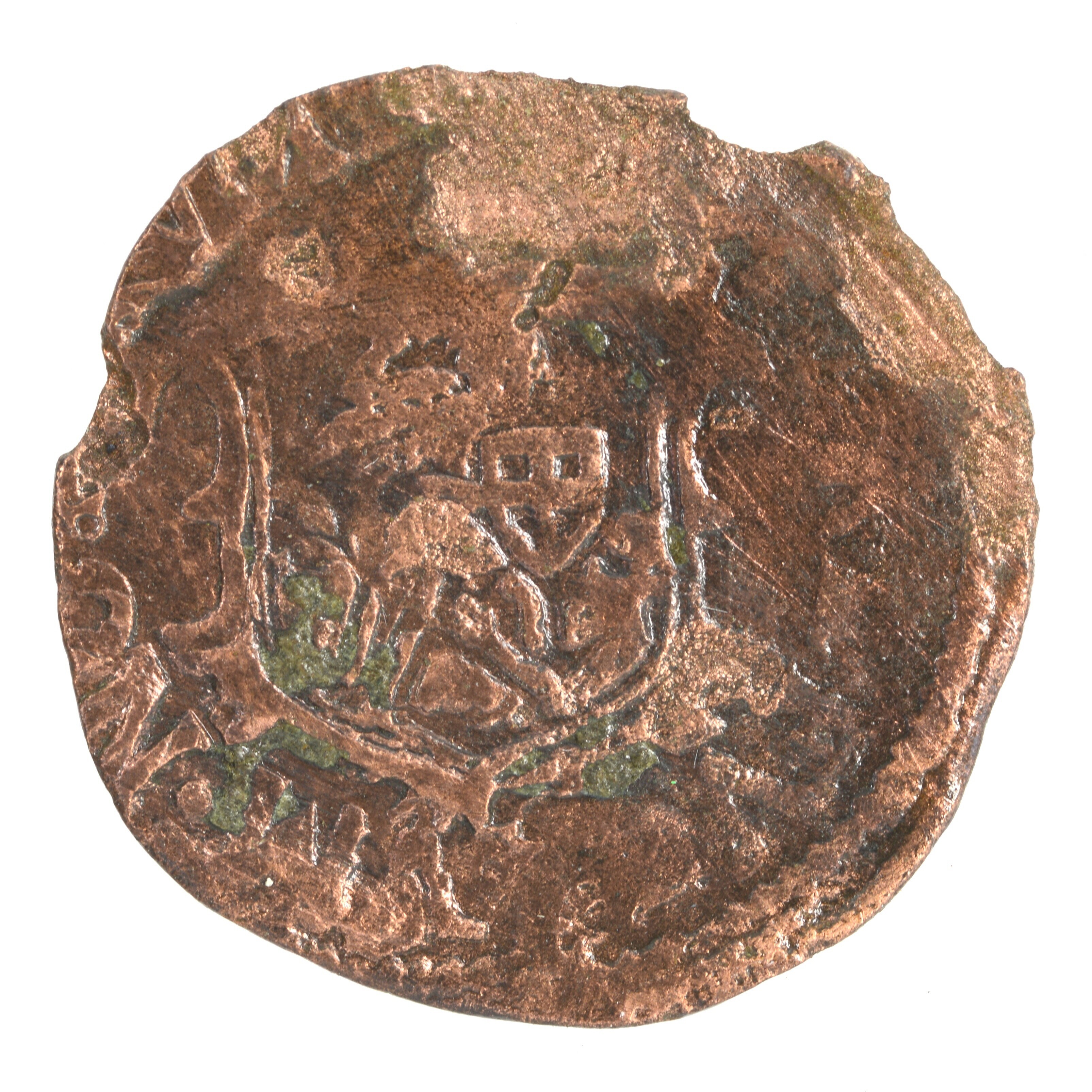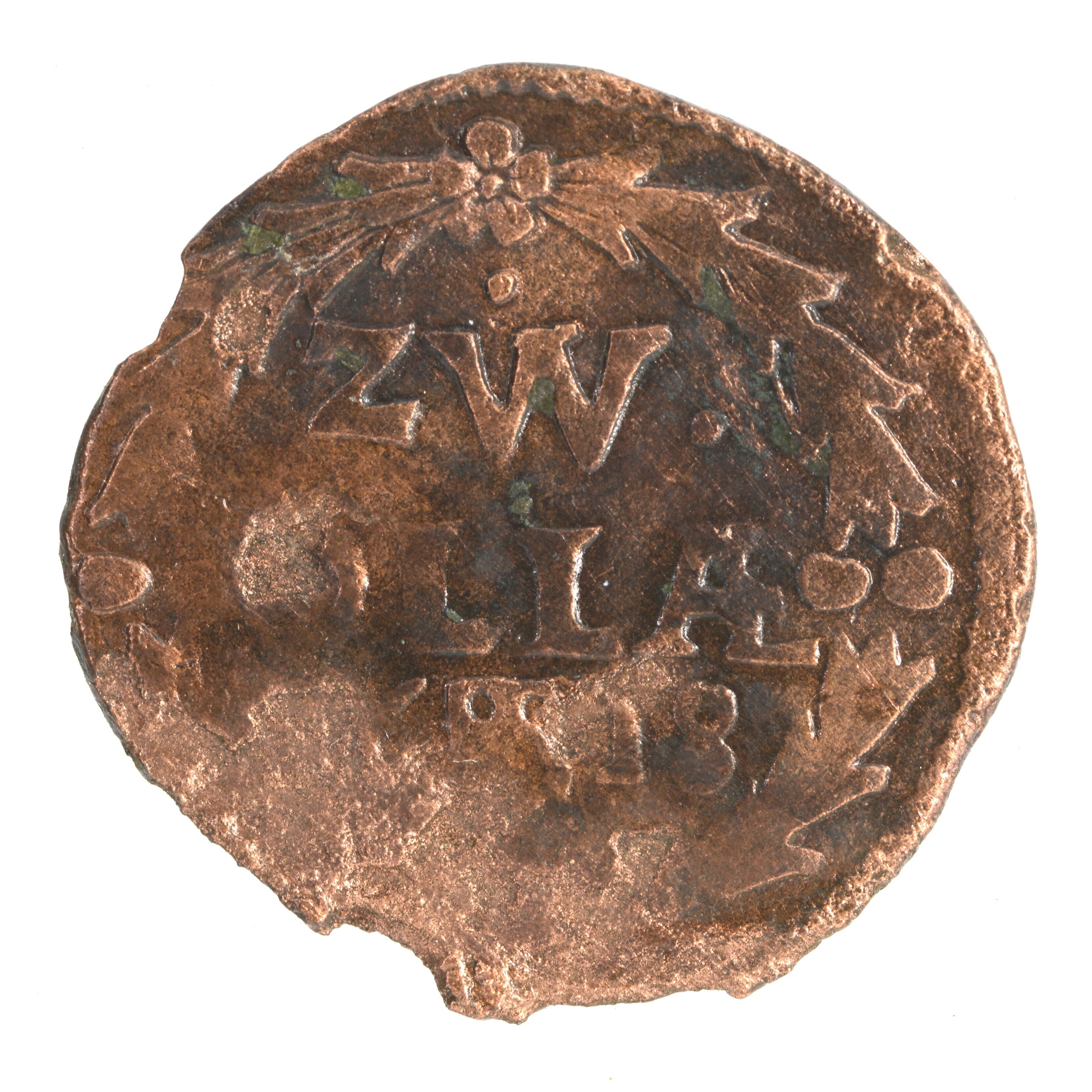 Duit Zwolle; vz.: tulpkrans met daarin de stadsnaam ZW. OL.LAE in twee regels en daaronder het jaartal (1618) gescheiden door een wapenschildje; kz.: Stadswapen van Zwolle met de heilige Sint Michael die een draak bevecht en randtekst DEVS. REFVGIVM. NOSTRVM.; gewicht: 1.93 gram