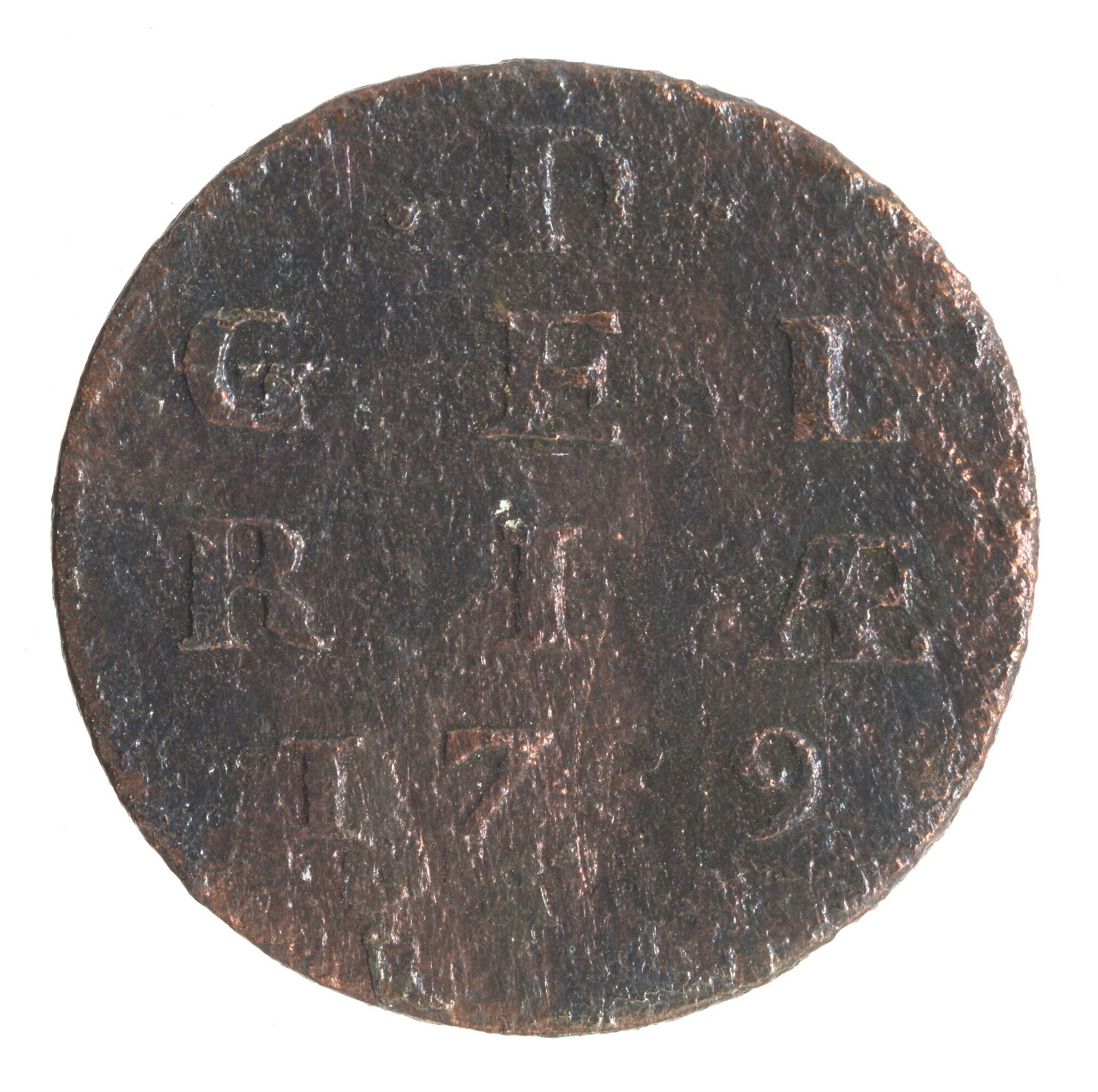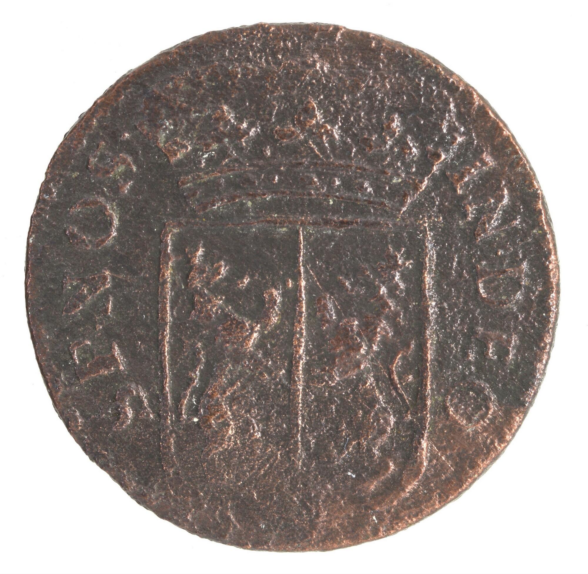 Duit; Gelderland Provincie (1581-1795); vz.: .D. GEL RIÆ in drie regels met daaronder het jaartal 1739 en het muntmeesterteken springend paard welke tussen twee rozetten is geplaatst; kz.: Gekroond wapen van Gelderland. Tekst: IN. DEO. SP. NOS.; gewicht: 2.84 gram
