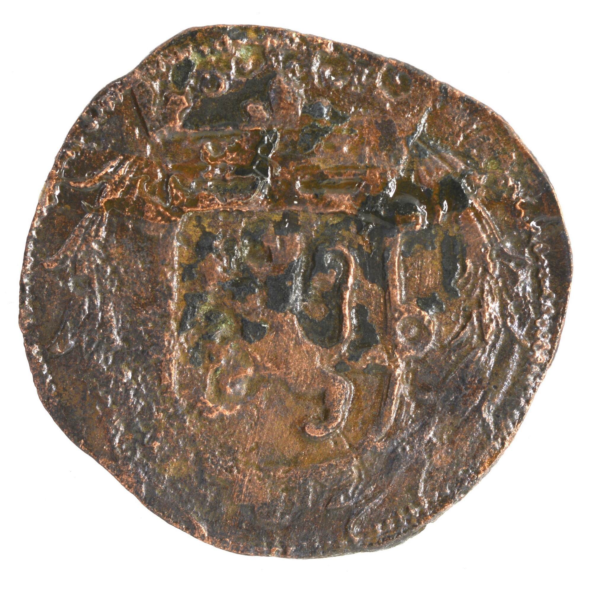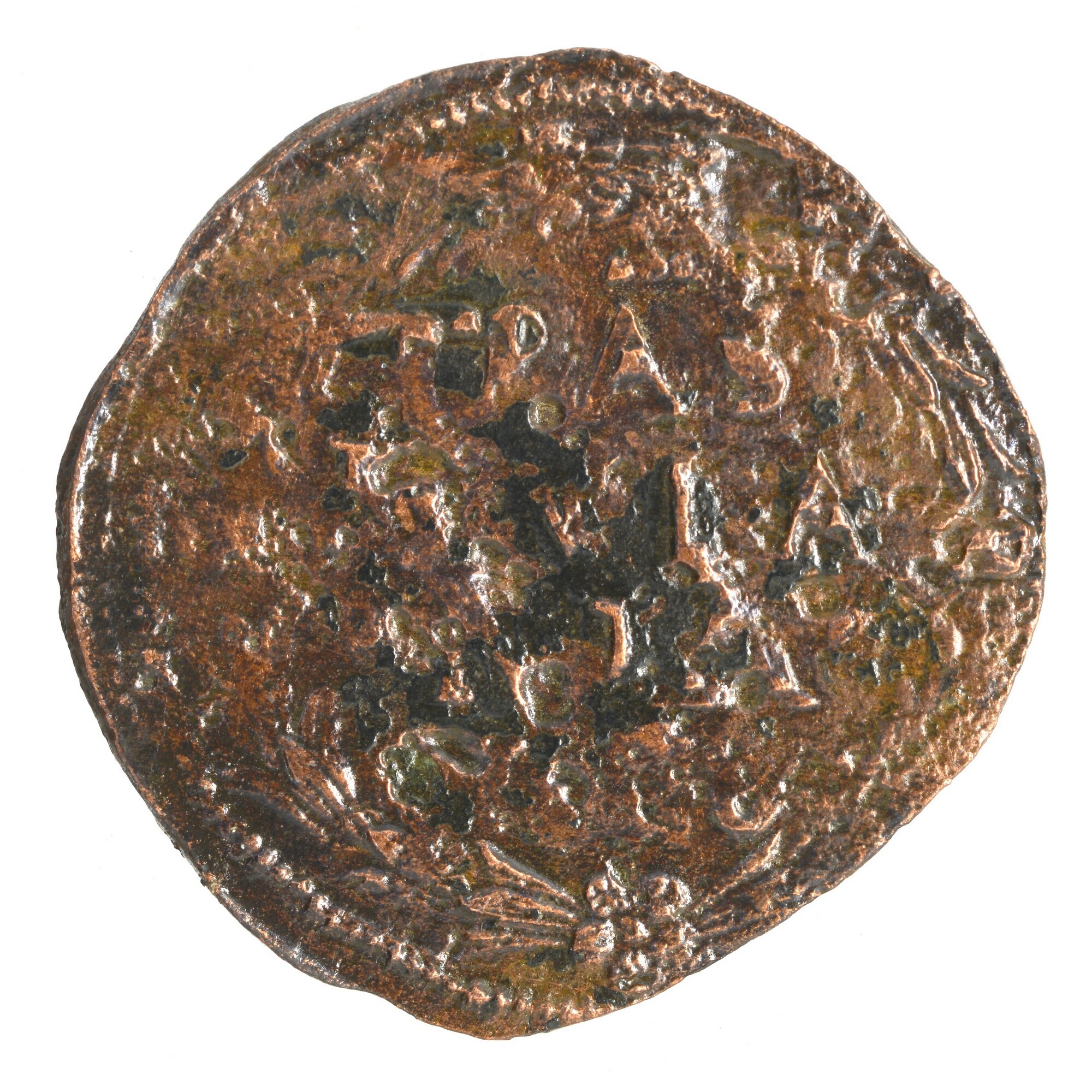 Duit; Overijssel Provincie (1581-1795); vz.: tulpkrans met daarin de tekst TRAS ISVLA .NIA. (of variant) in drie regels met daaronder het jaartal 1628; kz.: Gekroond wapen van Overijssel met klauwende leeuw naar links. Op de achtergrond een golvende lijn wat de rivier de IJssel moet voorstellen, langs het wapen loopt een tulpkrans; gewicht: 1.48 gram