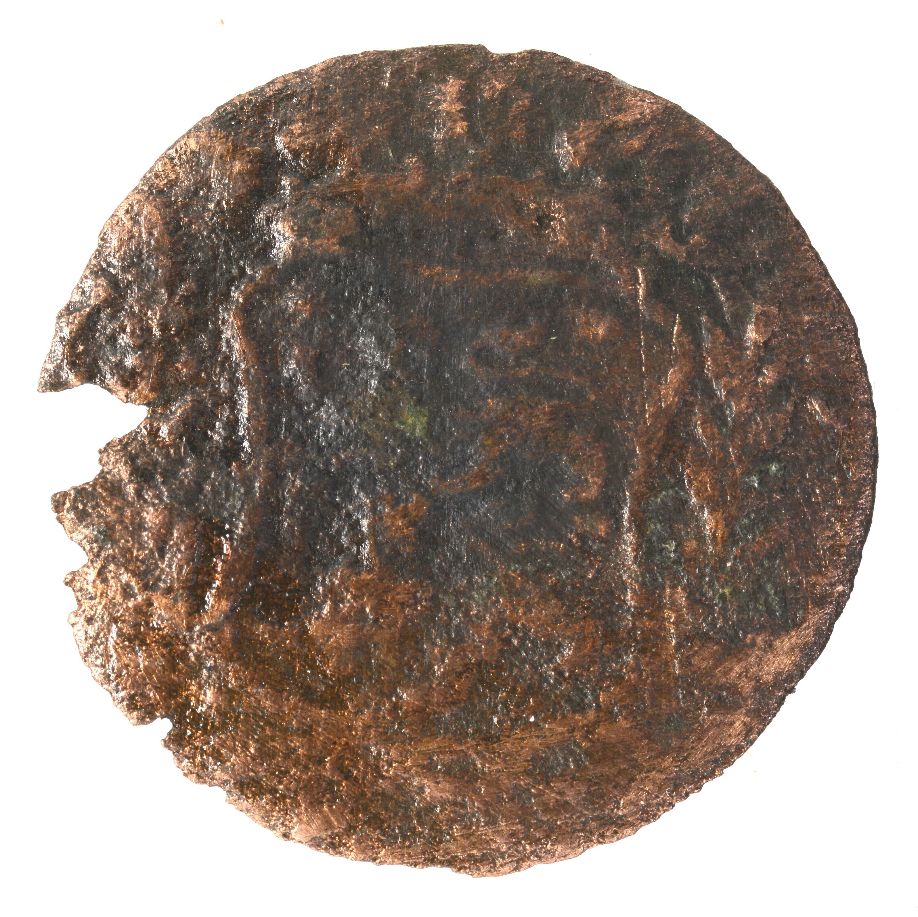 Duit West-Friesland; vz.: WEST FRISIAE in twee regels met hieronder het jaartal 1702; kz.: Gekroond ingebogen wapenschild met twee gaande leeuwen boven elkaar. De leeuwen hebben hun kop 'en face' gericht en wapen aan weerszijden versierd met bladertakken; gewicht: 1.50 gram