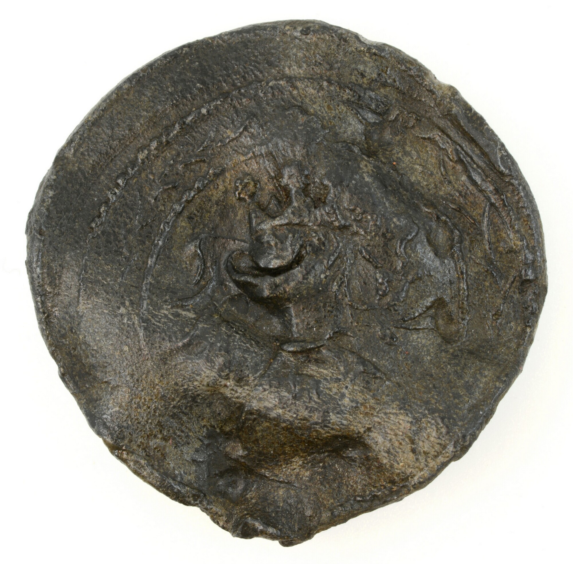 Textiellood; pb-tex; vz.: gekroonde helm; kz.: gekruiste sleutels (stadswapen Leiden)