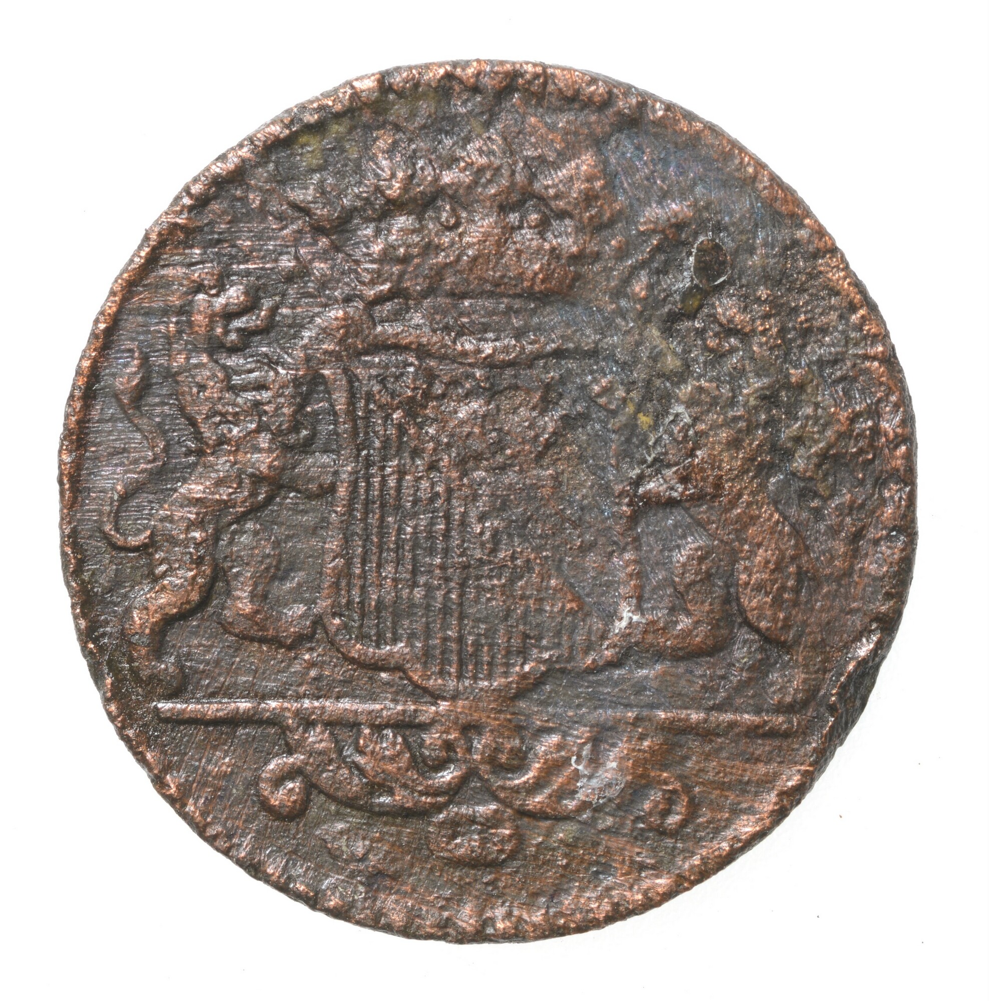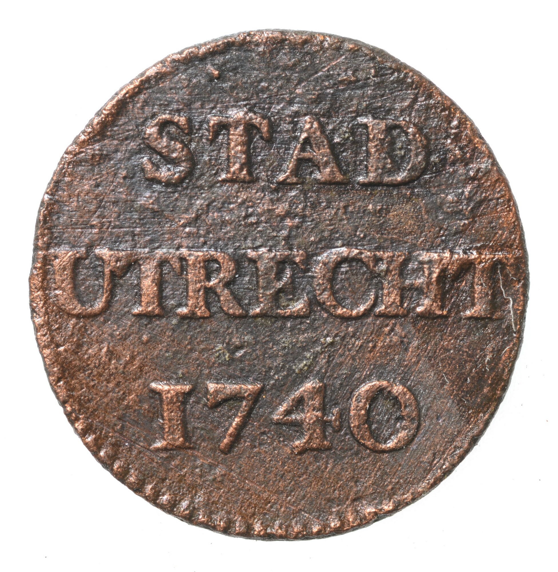 Duit; Stad Utrecht (1581-1795); vz.: STAD UTRECHT met daaronder jaartal met Romeinse I; kz.: Stadswapen van Utrecht met kroon, het wapen en de kroon worden vastgehouden door twee leeuwen. Onder het wapen loopt een dunne streep met daaronder een versiering met smalle (kleine) schelp. In het kwartier linksonder een grove arcering van verticale lijnen; gewicht: ...