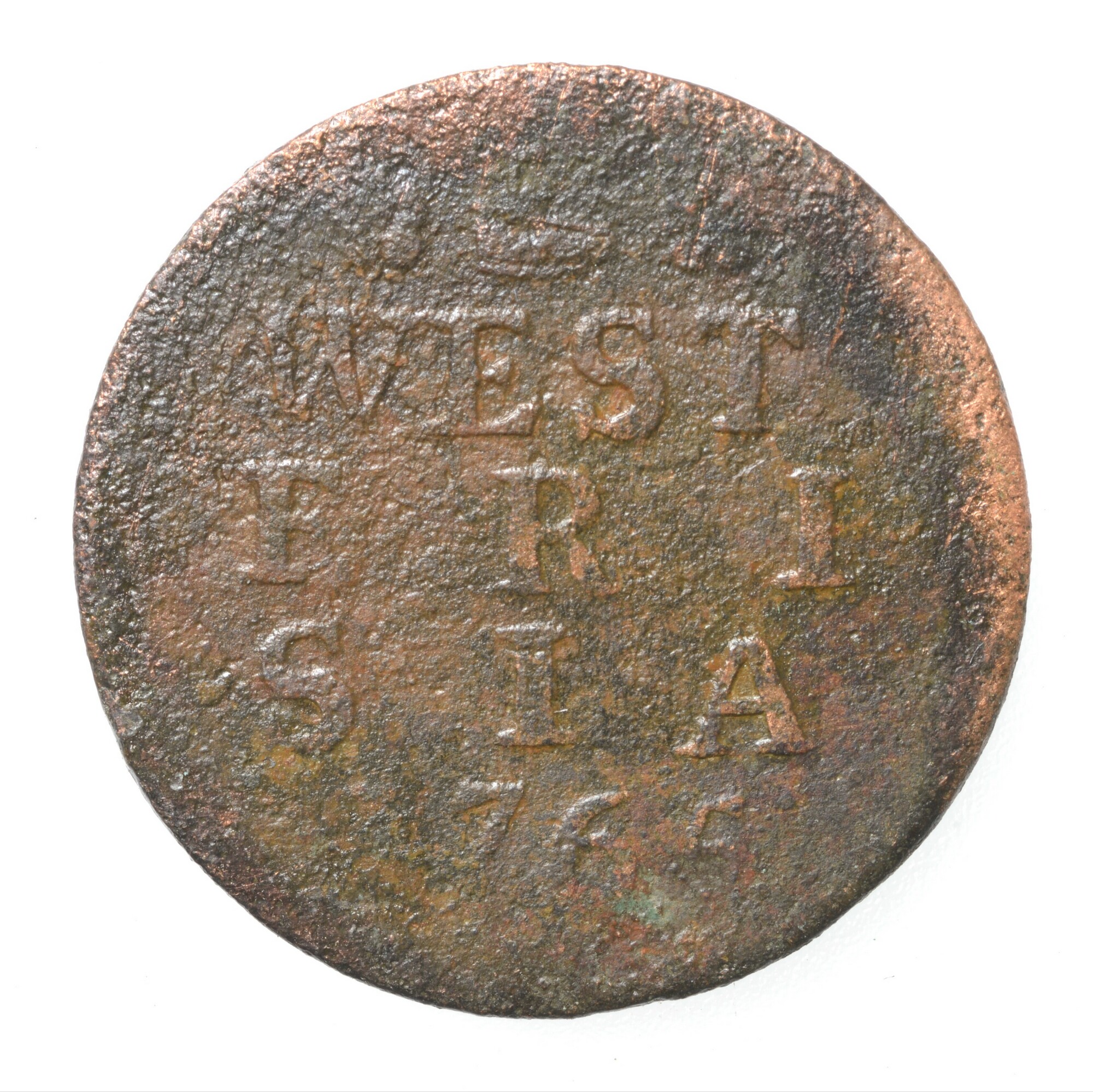 Duit West-Friesland; vz.: Haringbuis , daaronder WEST FRI SIA in drie regels en het jaartal 1765; kz.: Gekroond wapenschild met twee gaande leeuwen boven elkaar. De leeuwen hebben hun kop 'en face' gericht en het wapen is versierd met lauwertakken; gewicht: 2.96 gram