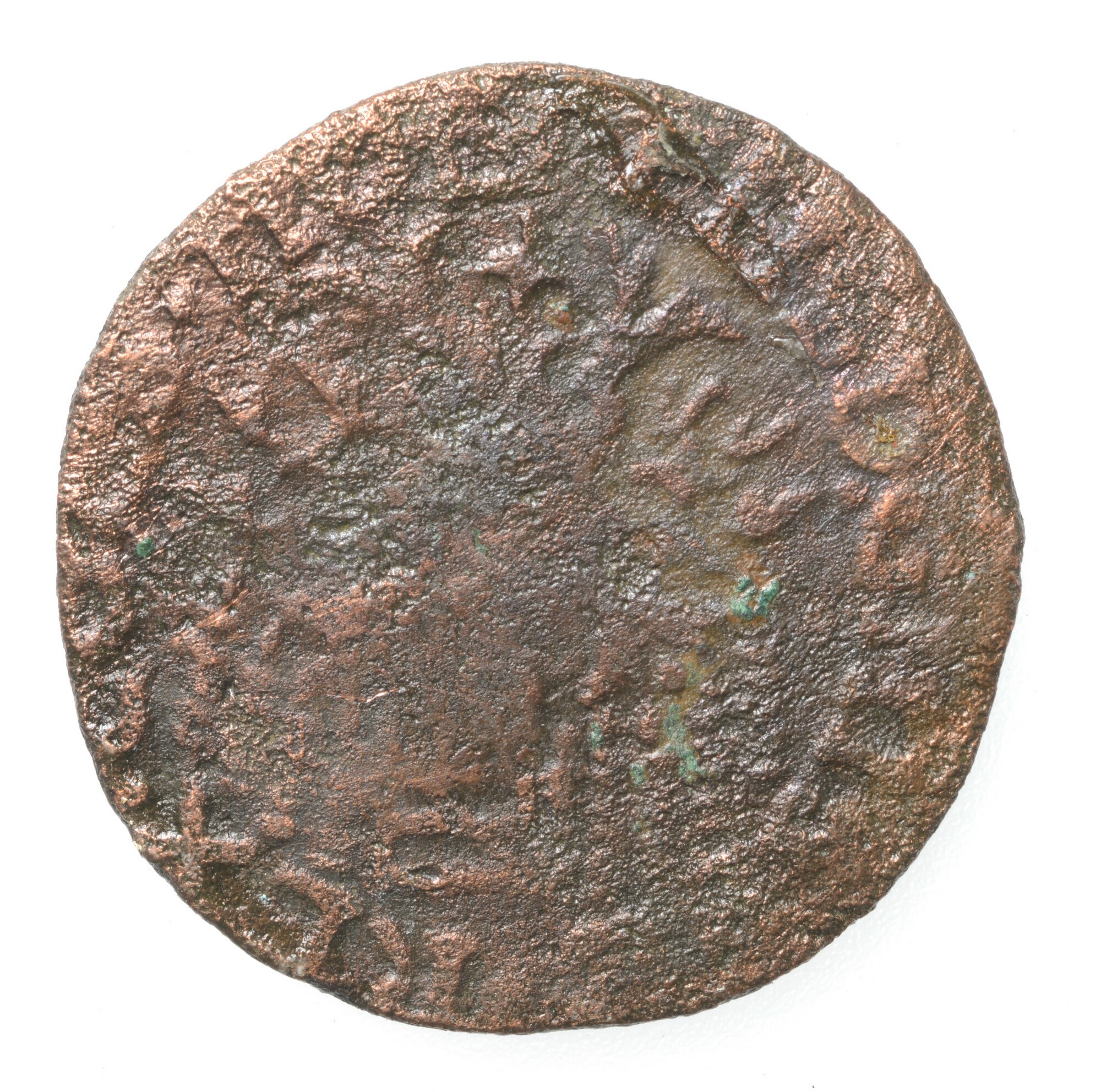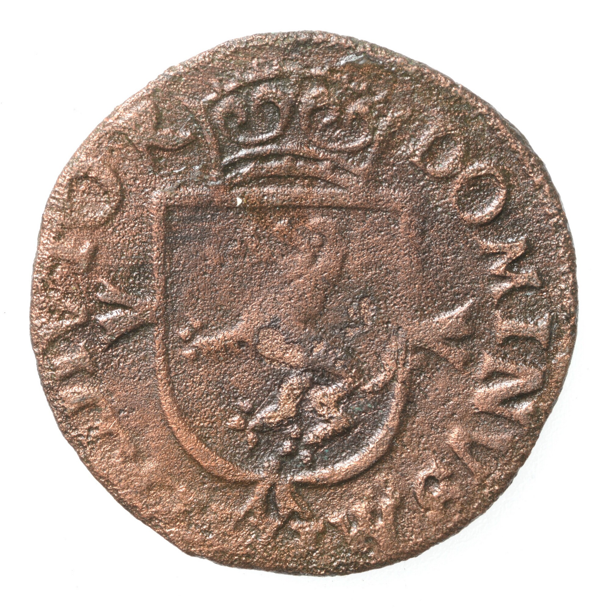 Duit; Holland Provincie (1581-1795); vz.: Een scheef geplaatst stokkenkruis met daarop een vuurijzer geplaatst, van het vuurijzer springen vonken af. Het geheel is geplaatst in de zogenaamde Hollandse tuin en randtekst PHS. D:G. HISP Z. REX. COES. HOL; kz.: Gekroond wapenschild gelegen op een kruis. In het wapen een klauwende leeuw naar links en randtekst ...