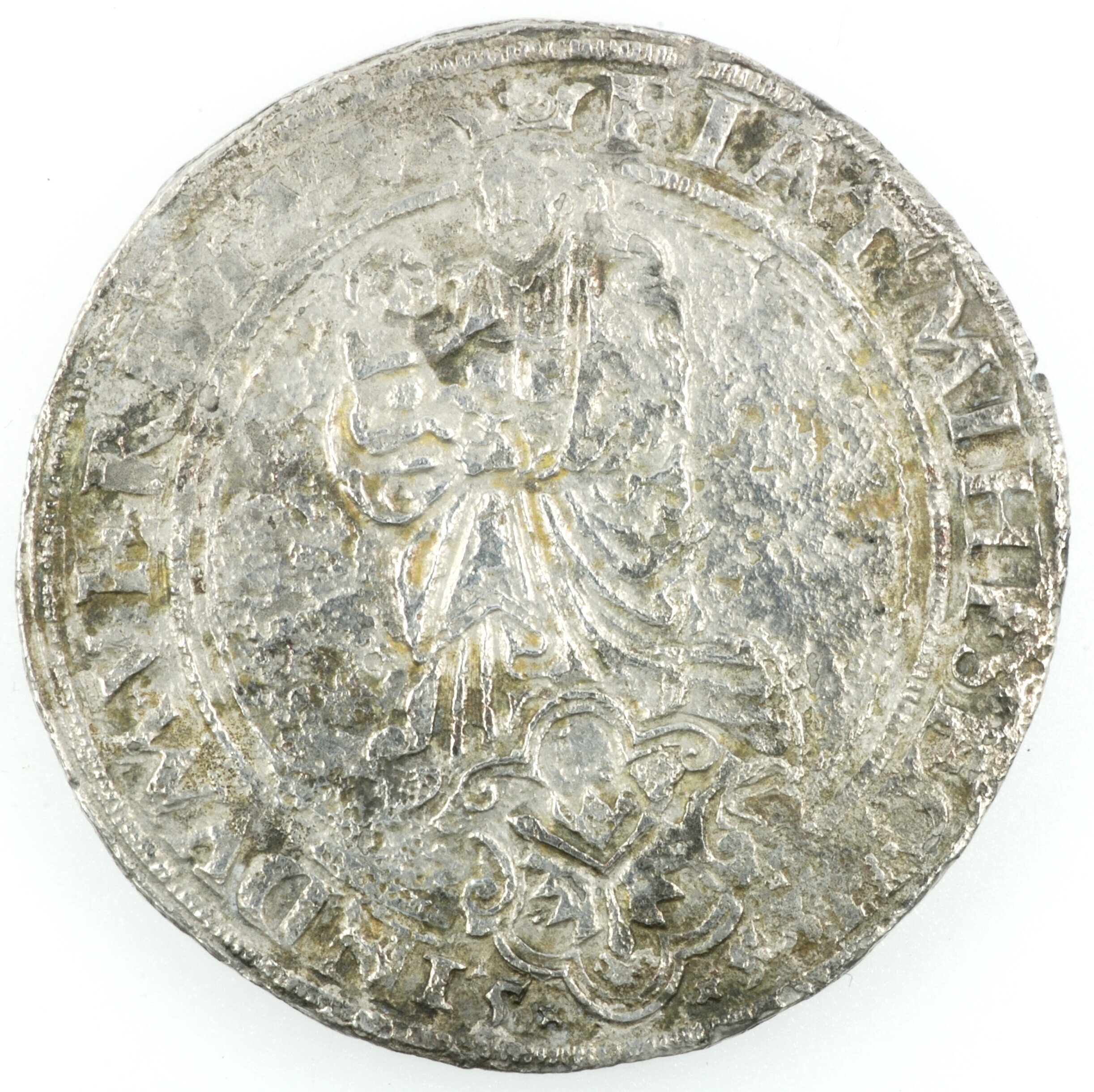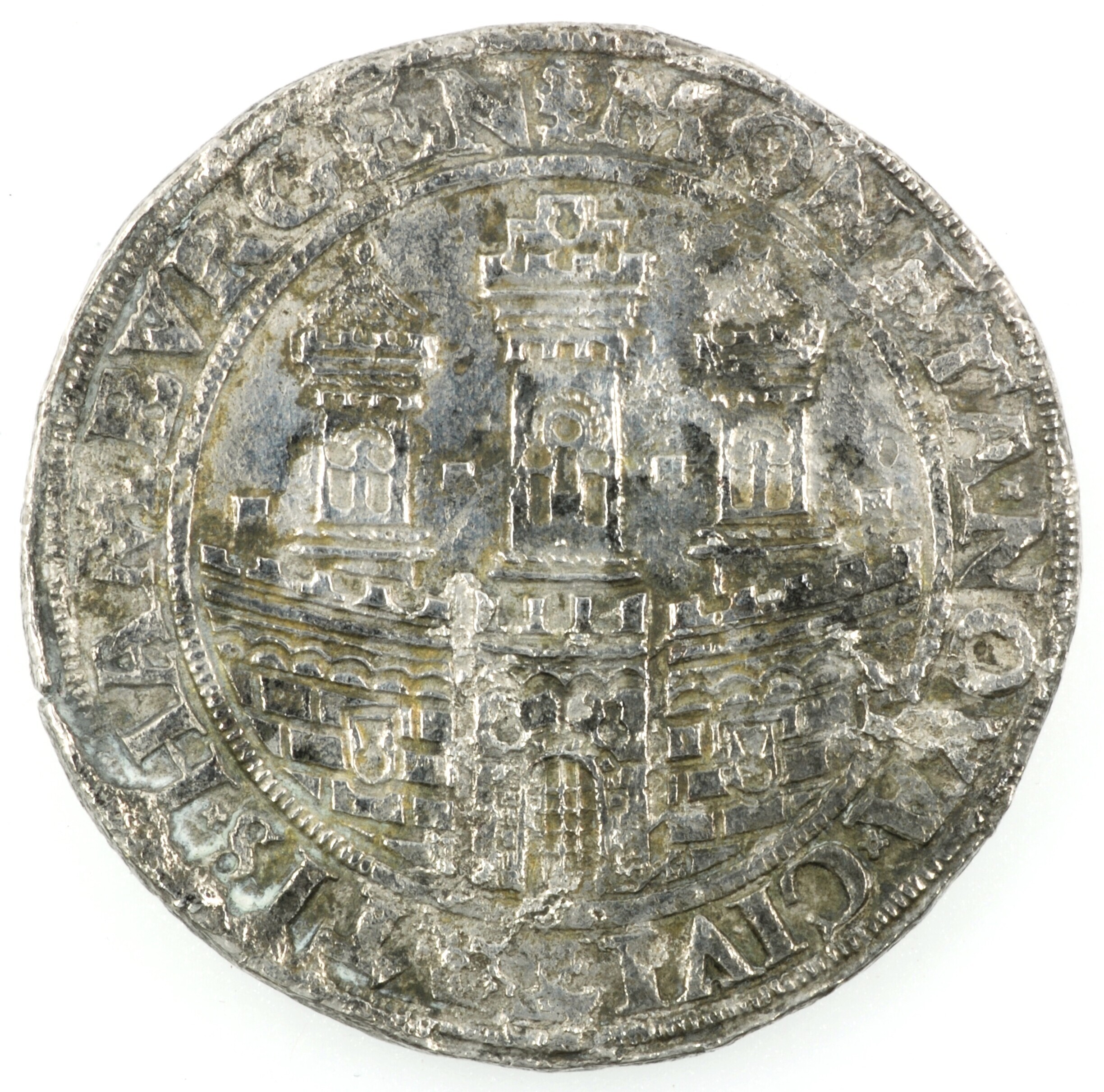Thaler Hamburg; vz.: stadspoort met drie torens in een stadsmuur afgebeeld; randtekst: MONETA.NOVA.CIVITATIS.HAMBVRGEN; kz.: staande Maria met Kind met daaronder een wapenschild; randtekst: FIAT.MIHI.SECV.NDVM.VER.TVVM en geheel onderaan het jaartal 1553; gewicht: 25.12 gram