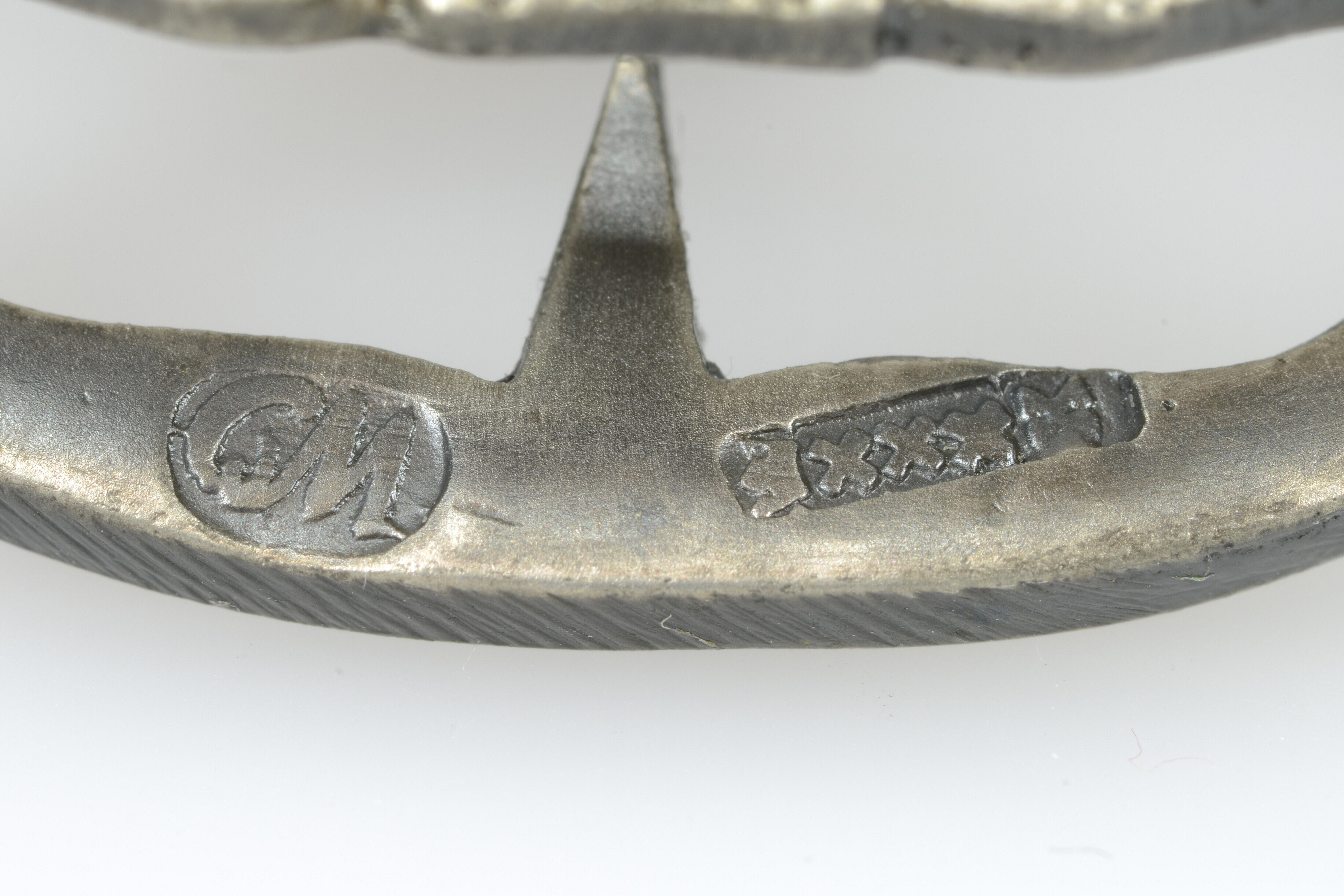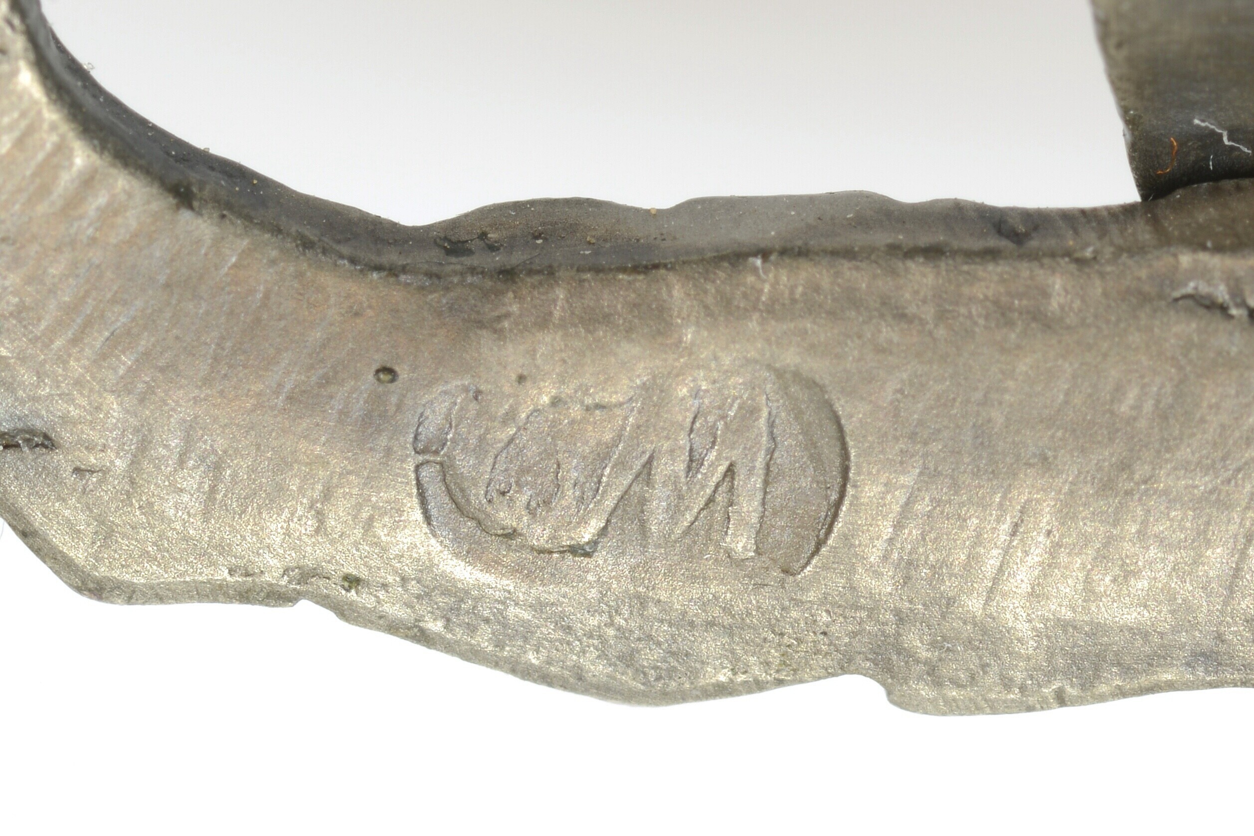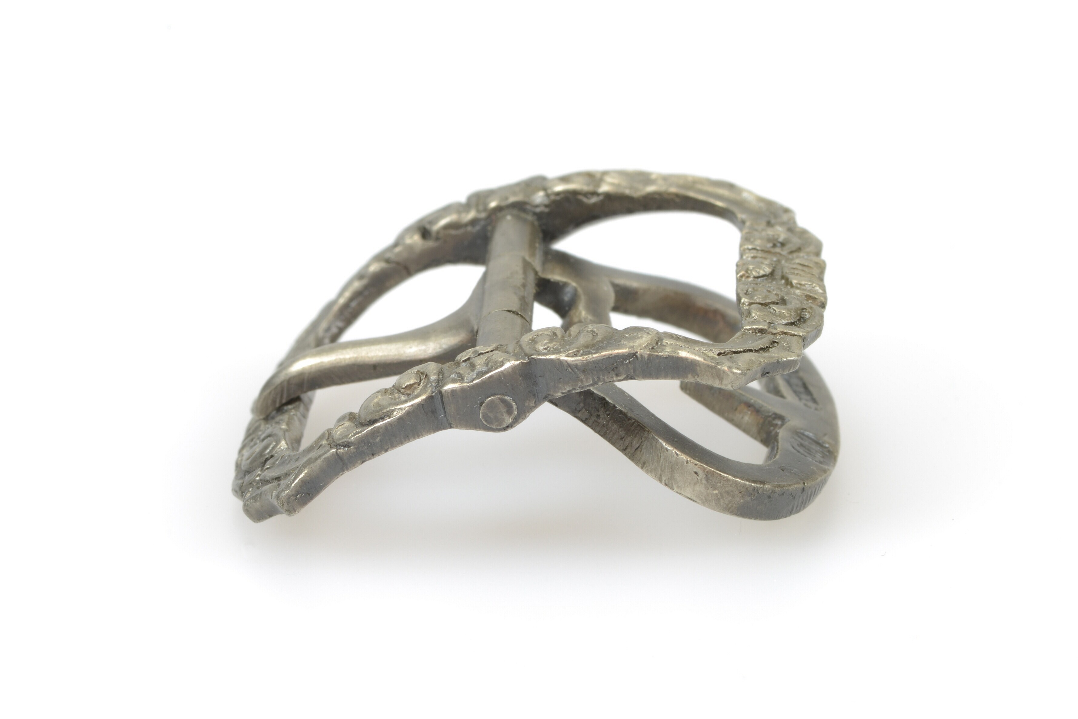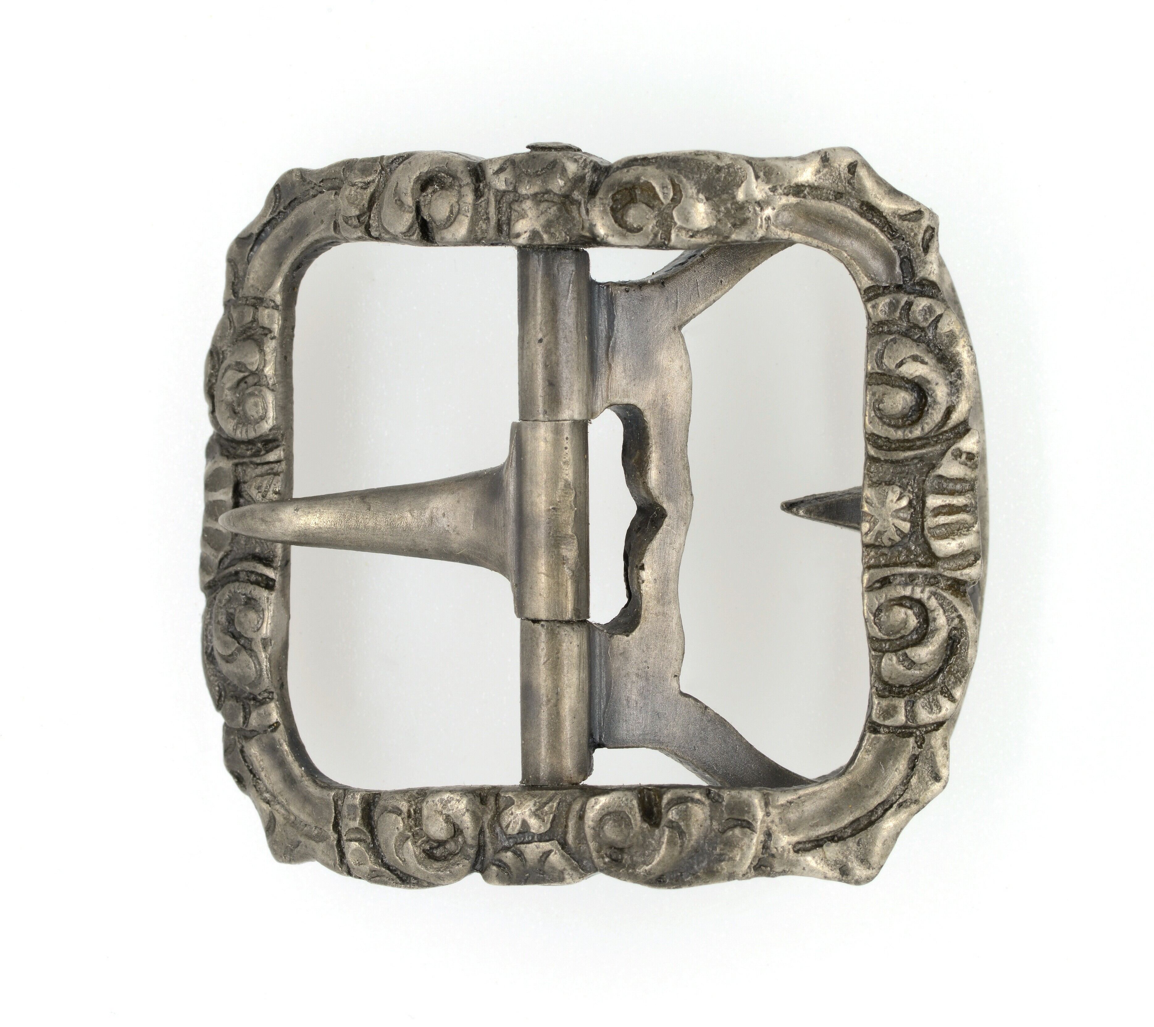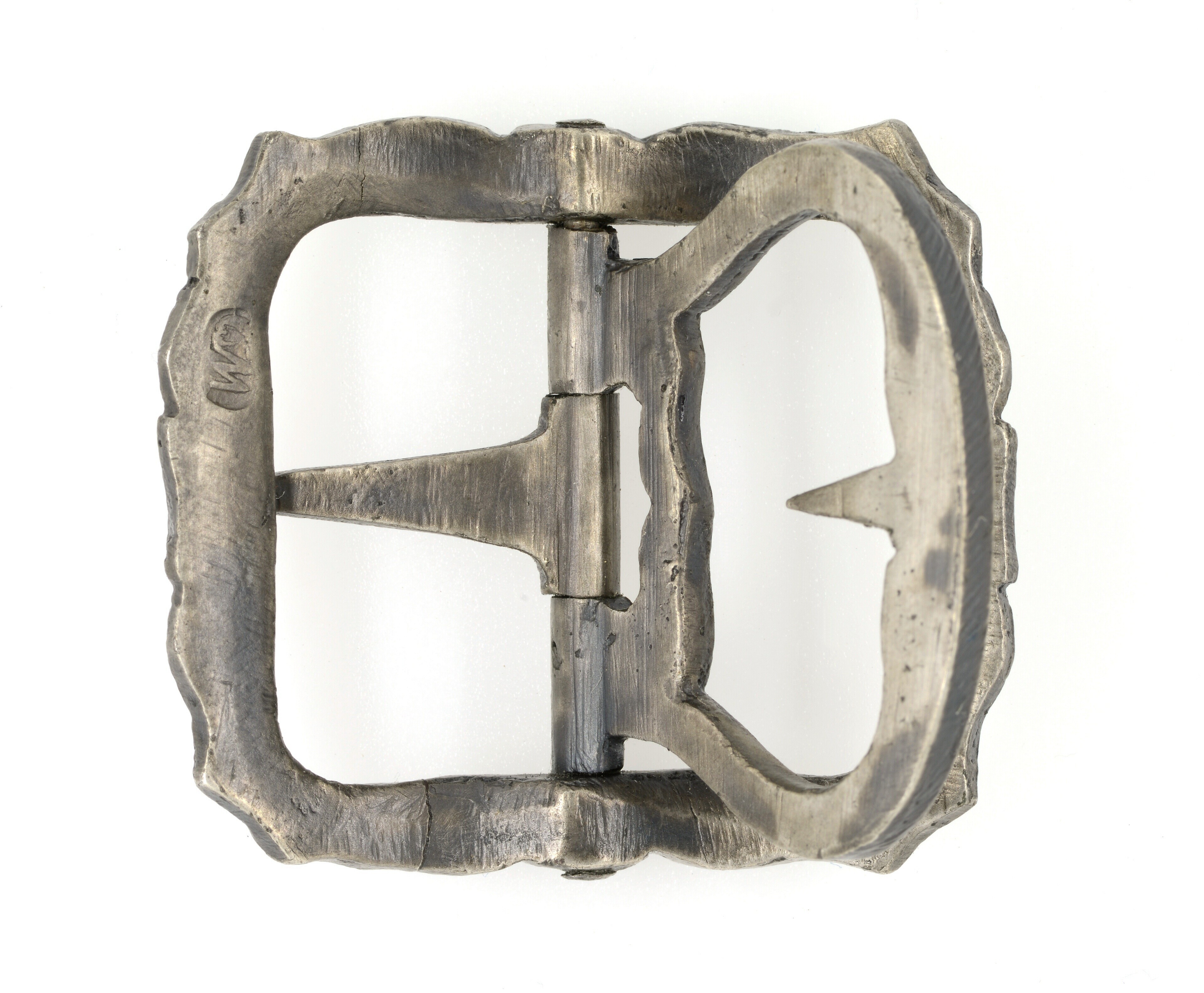 Schoengesp; rechthoek met afgeronde zijden; reliëfdecoratie: voluten en schelpmotieven; haakbeugel met angel en zilvermerken; herkomst: Amsterdam; gewicht: 22.82 gram