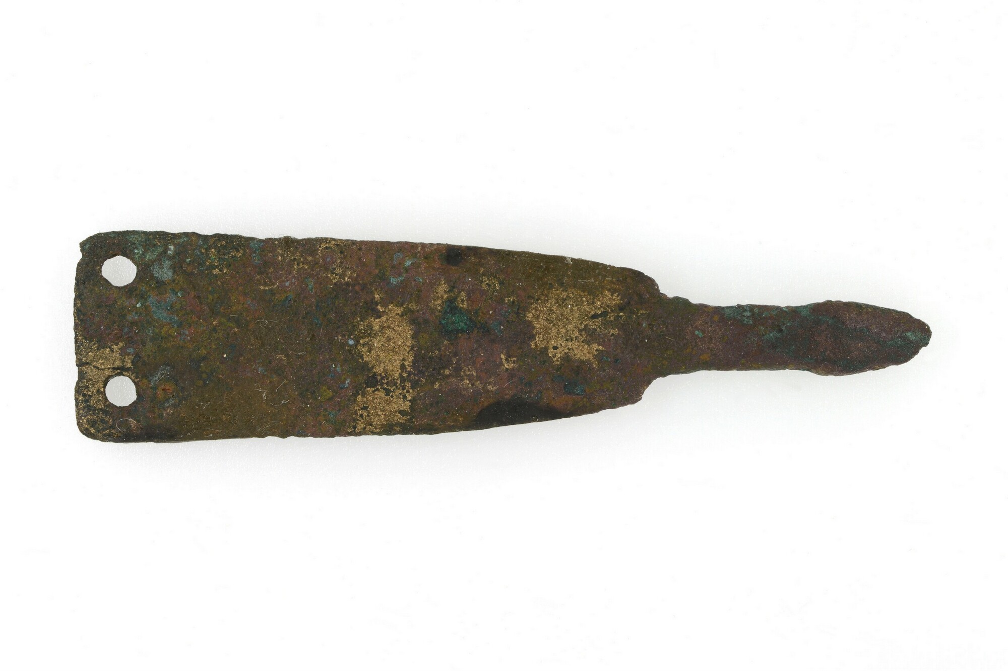 Riemtong; trapeziumvormige voetplaat met twee nagelgaten aan de brede zijde en een 2cm lange knop met eikelvormig (verdikt) uiteinde