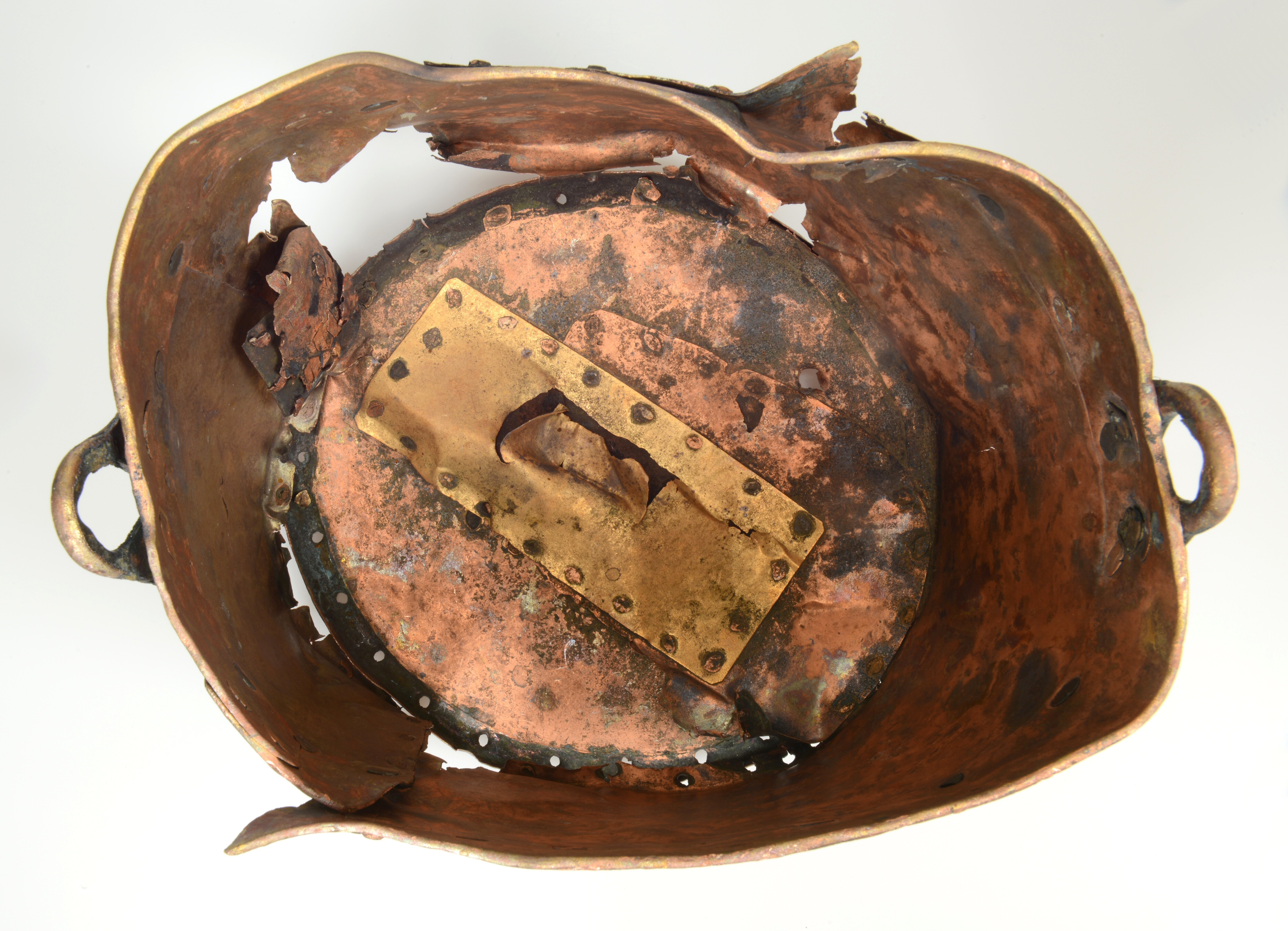 Ketel; ronde ketel met platte bodem; hengsel ontbreekt; diverse reparatie in de vorm van geklonken koperplaatjes
