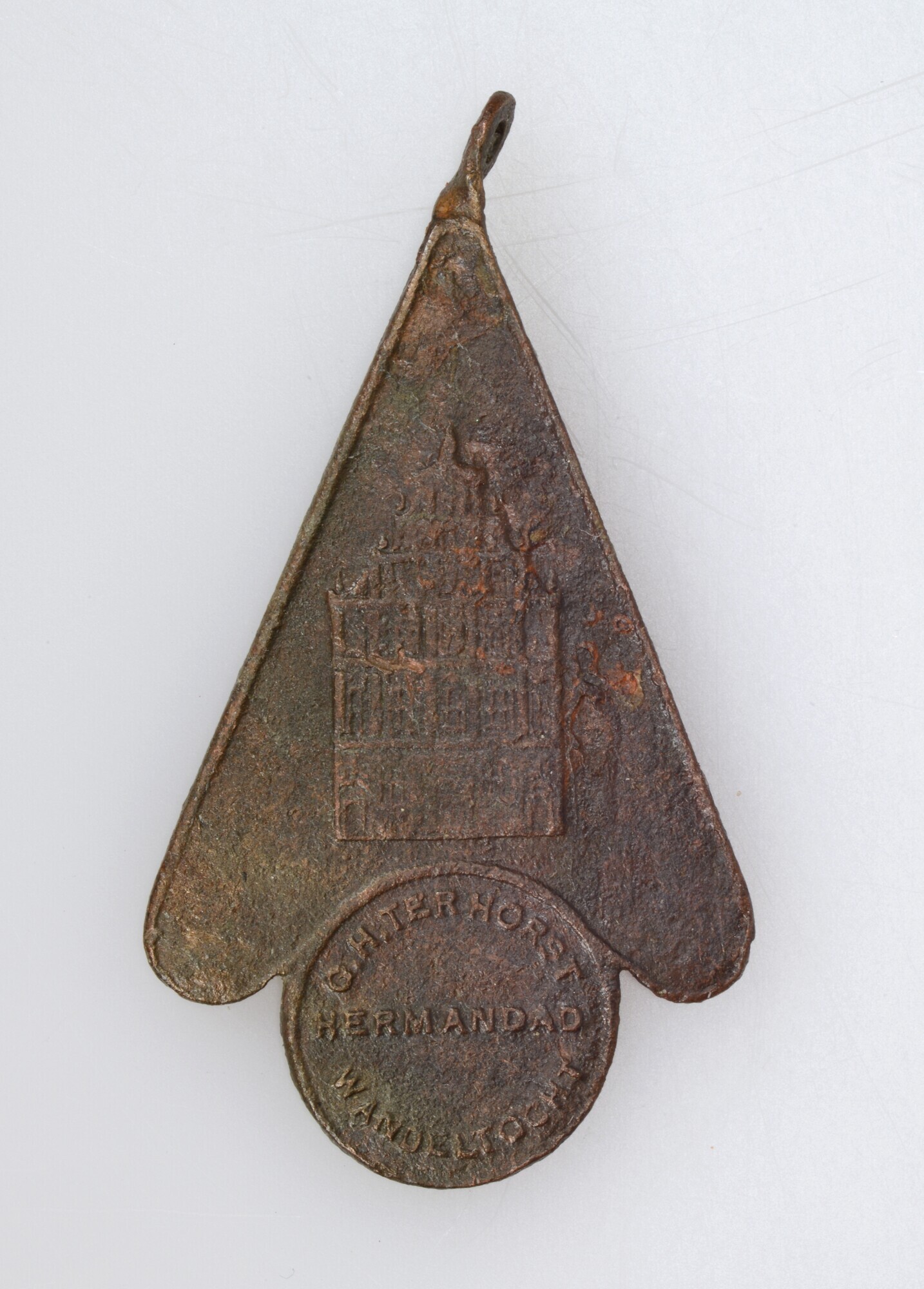 Medaille; driehoekig met daaronder een cirkel; op driehoek: in reliëf: huis met trapgevel; op cirkel: 'G.H. Ter Horst hermandad wandeltocht'
